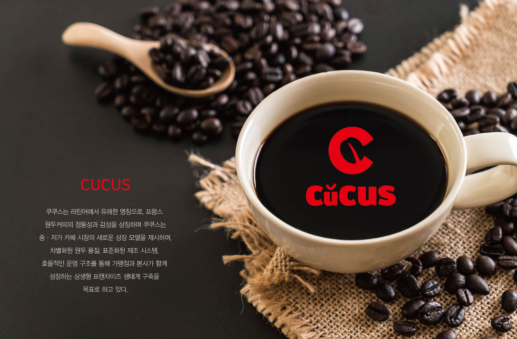 쿠쿠스커피 BI 원두부터 다르게, 커피의 가치를 높이다 쿠쿠스는 라틴어로 프랑스식 원두커피를 상징하는 이름으로, 커피 전문 브랜드로서의 정체성을 분명히 하기 위한 출발점에서 브랜드 개발이 시작되었다. 기존 저가 커피 시장의 한계를 넘어, 보다 차별화된 품질과 경험을 제공하는 커피 전문점으로 자리매김하는 것을 목표로 설정하였다. 커피의 전문성과 원두의 경쟁력을 핵심 가치로 삼아, 매장 방문 순간부터 브랜드의 철학과 품질이 자연스럽게 전달될 수 있는 통합적인 브랜드 구조가 요구되었다. 특히 프랜차이즈 확장을 고려한 명확하고 일관된 브랜드 인식 구축이 중요한 과제로 설정되었다. 이에 따라 CUCUS COFFEE의 브랜드 개발은 ‘커피 전문성·원두·차별성’이라는 핵심 요소를 중심으로, 소비자가 한눈에 인식할 수 있는 강력한 시각적 아이덴티티를 구축하는 방향으로 진행되었으며, 향후 가맹 확장과 시장 경쟁력 강화를 위한 기반을 마련하는 데 초점을 두었다. | ||||