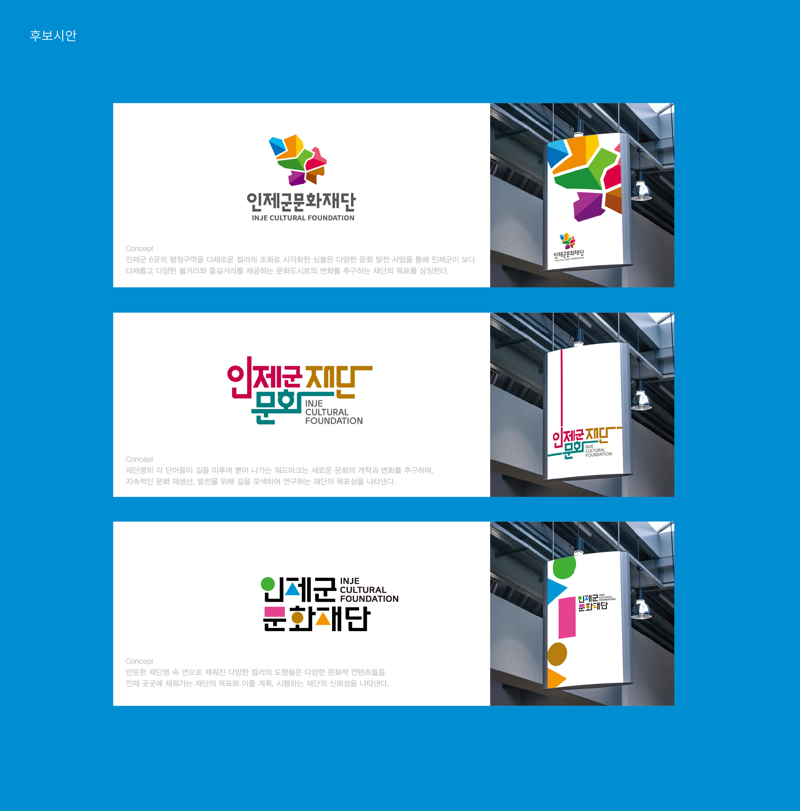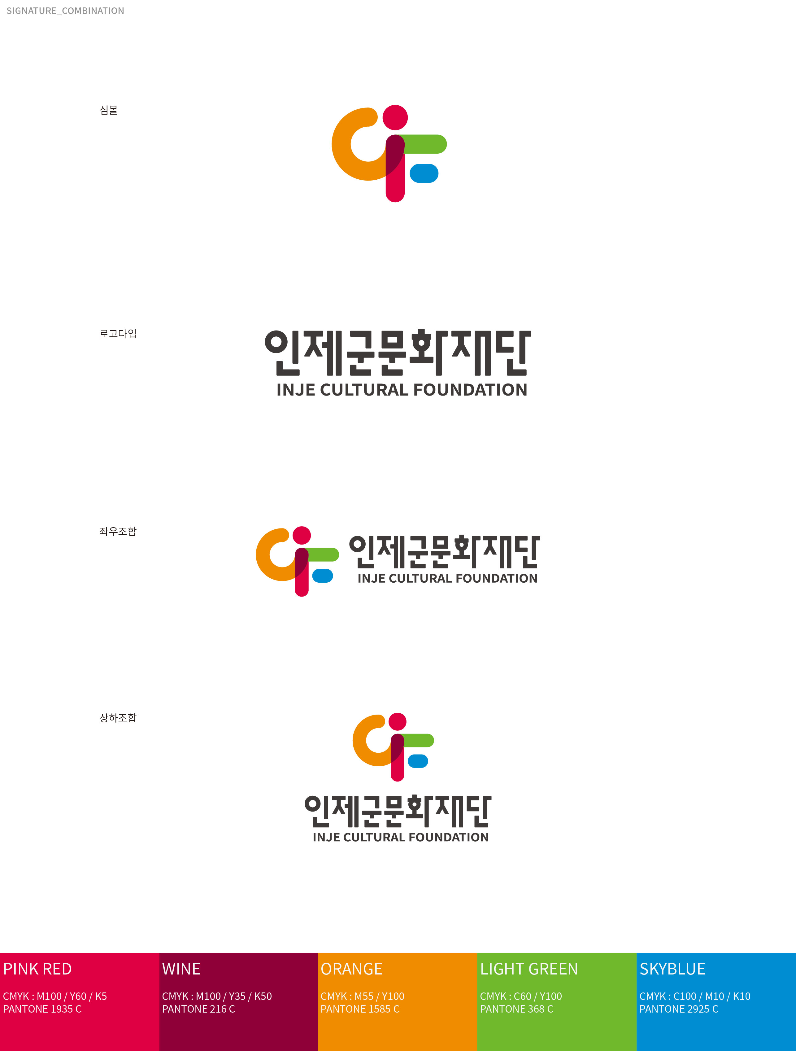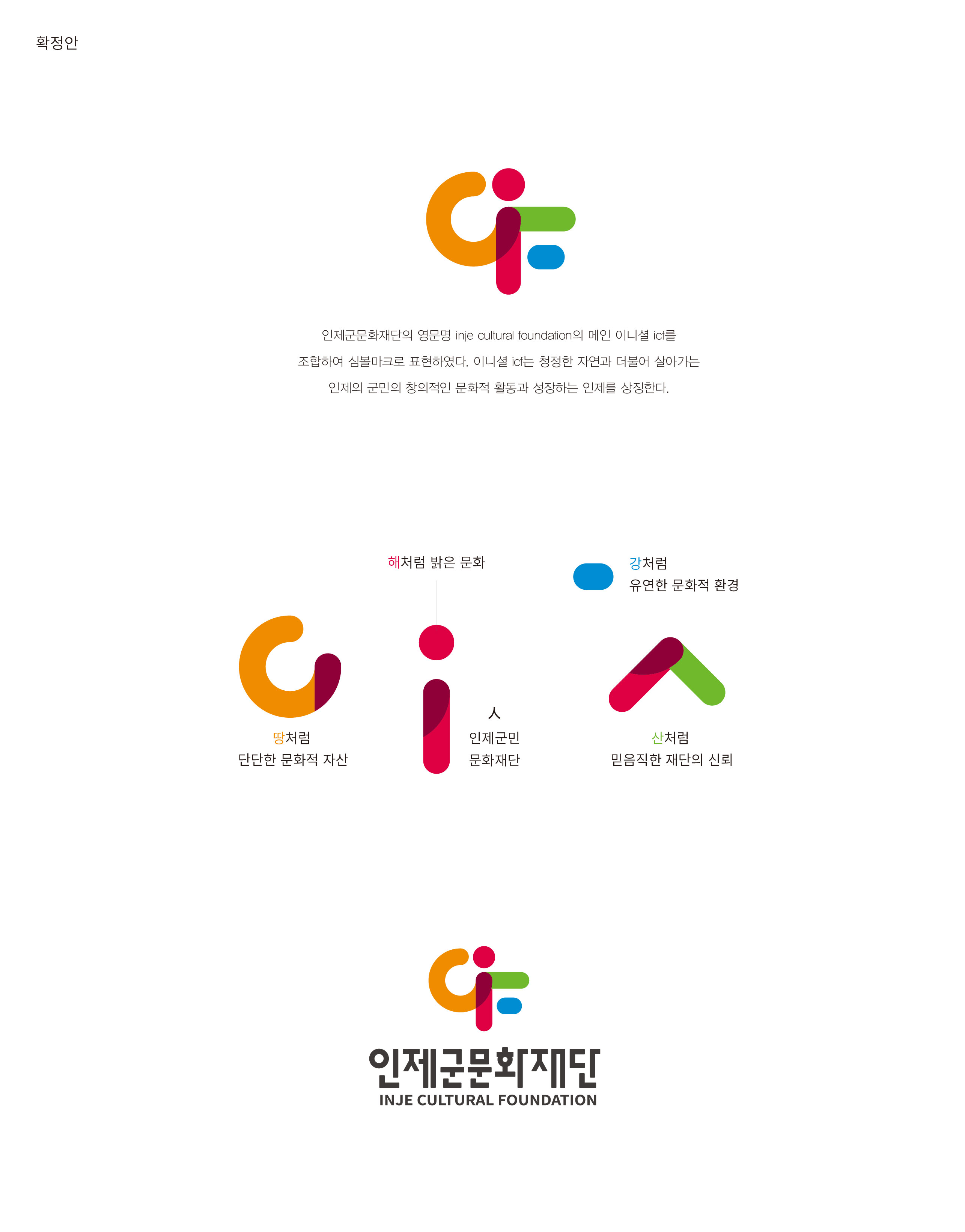 인제군문화재단 CI 리뉴얼 문화로 소통하고 교류로 확장하다 인제군문화재단은 인구 감소와 고령화라는 지역 사회의 구조적 변화 속에서 문화의 역할을 재정립해야 하는 시점에 놓여 있다. 교통과 정보통신의 발달로 공간의 경계가 허물어지는 시대적 흐름 속에서, 지역 문화기관 역시 보다 개방적이고 확장된 역할 수행이 요구되고 있다. 기존의 브랜드는 매뉴얼 중심의 형식적 아이덴티티에 머물러 있어, 변화하는 사업 방향과 재단의 비전을 충분히 담아내지 못한 한계가 있었다. 특히 문화시설 중심의 운영에서 벗어나 다양한 문화사업과 교류 프로그램으로 확대되는 흐름에 맞춰, 사업 중심의 새로운 비전과 통합된 시각 체계 구축이 절실히 필요하였다. 인제의 지역성을 강화하면서도 인근 도시 및 수도권과의 문화적 교류를 확장해 나가기 위해서는, 정체성과 확장성을 동시에 담을 수 있는 브랜드 전략이 요구된다. 군민을 위한 직접적이고 효과적인 문화 서비스 제공과 지역 문화의 가치 확산이라는 이중 목표를 명확히 전달할 수 있는 브랜드 재정립이 중요한 과제로 부각되었다. 이에 따라 인제군문화재단은 문화시설·문화사업·지역 중심의 축을 아우르는 새로운 시각 아이덴티티를 수립하고, 지역에 머무르지 않고 주변 도시 및 대도시와 활발히 교류하는 문화 플랫폼으로의 도약을 목표로 브랜드 개발을 추진하게 되었다. | ||||