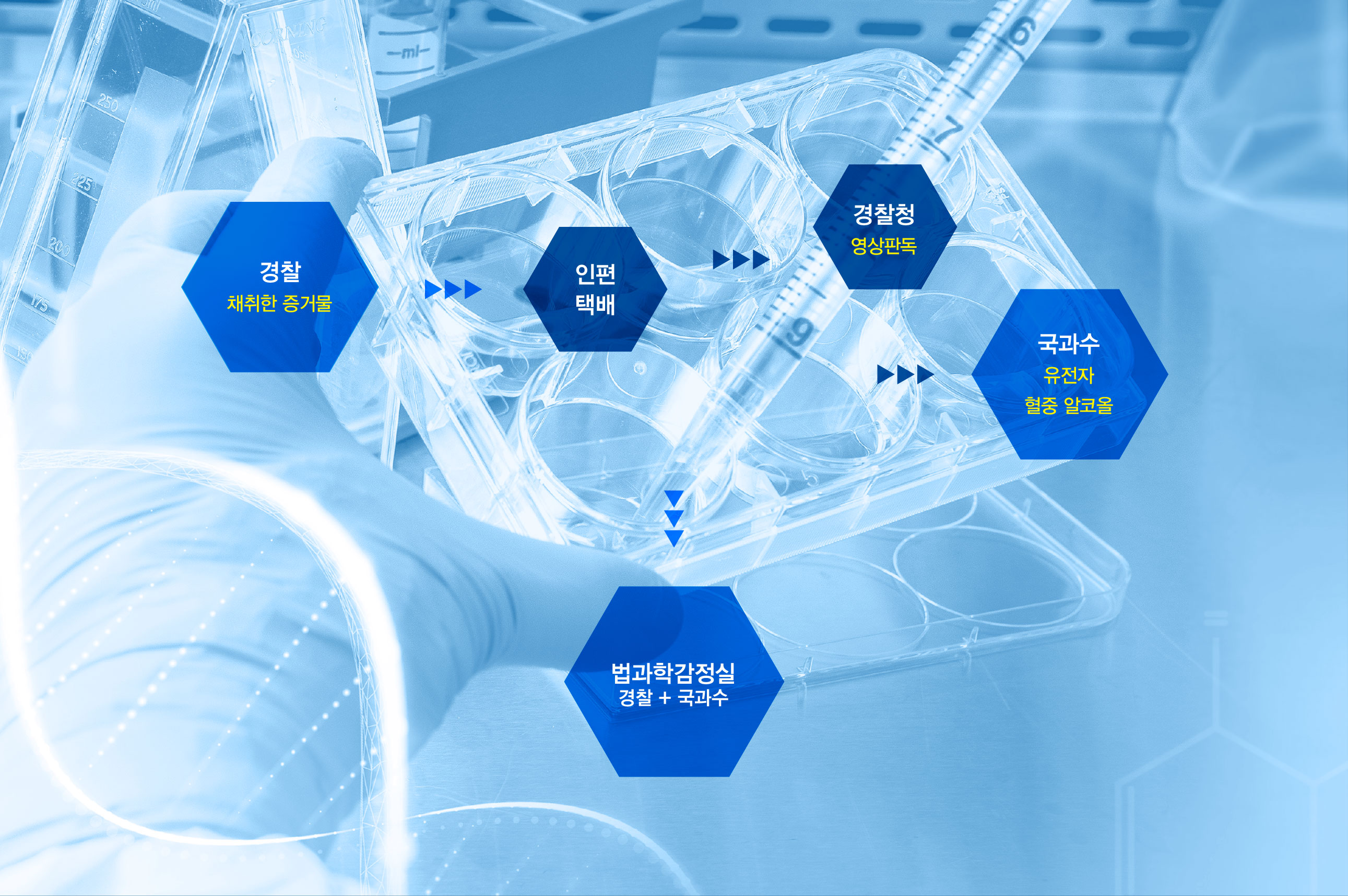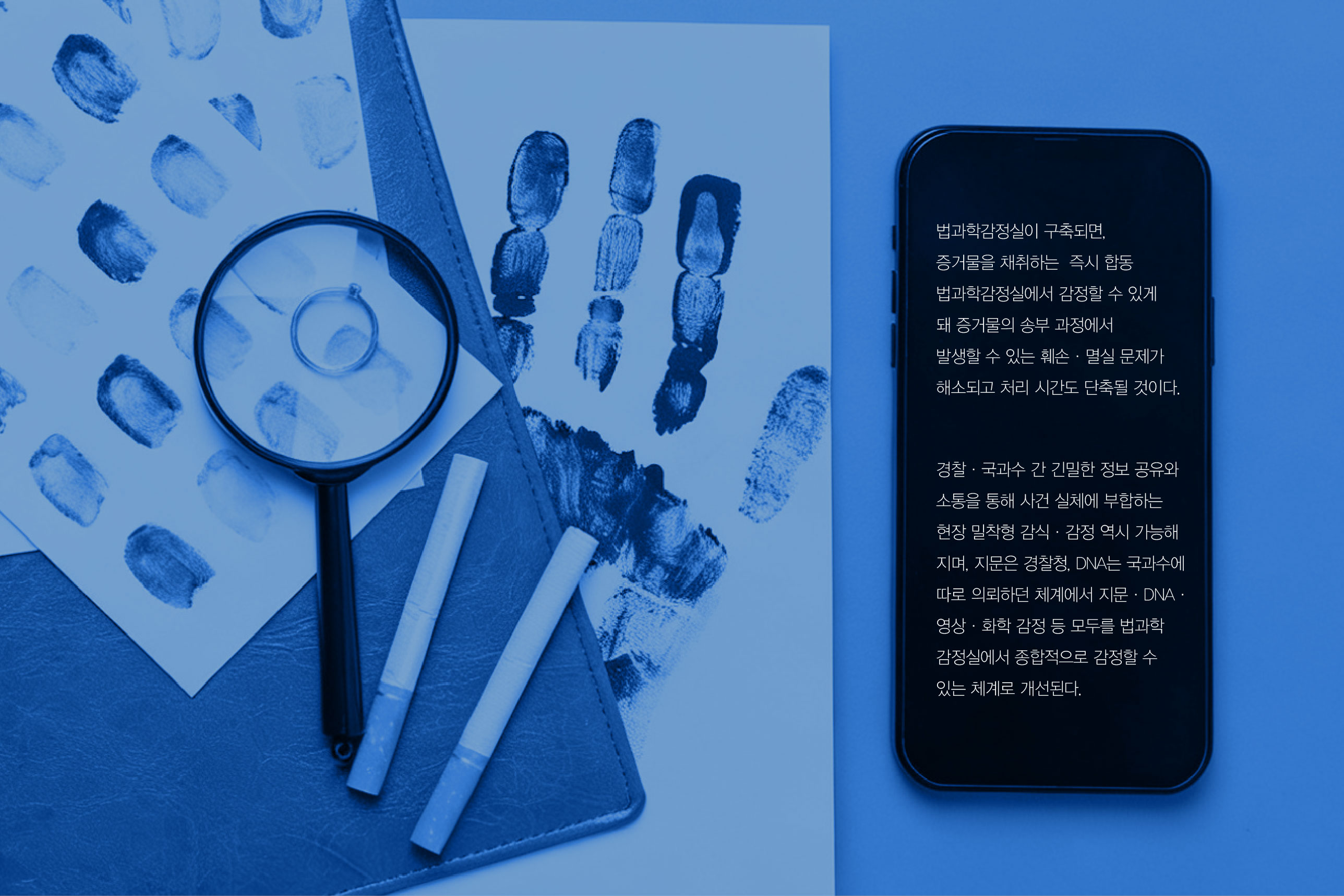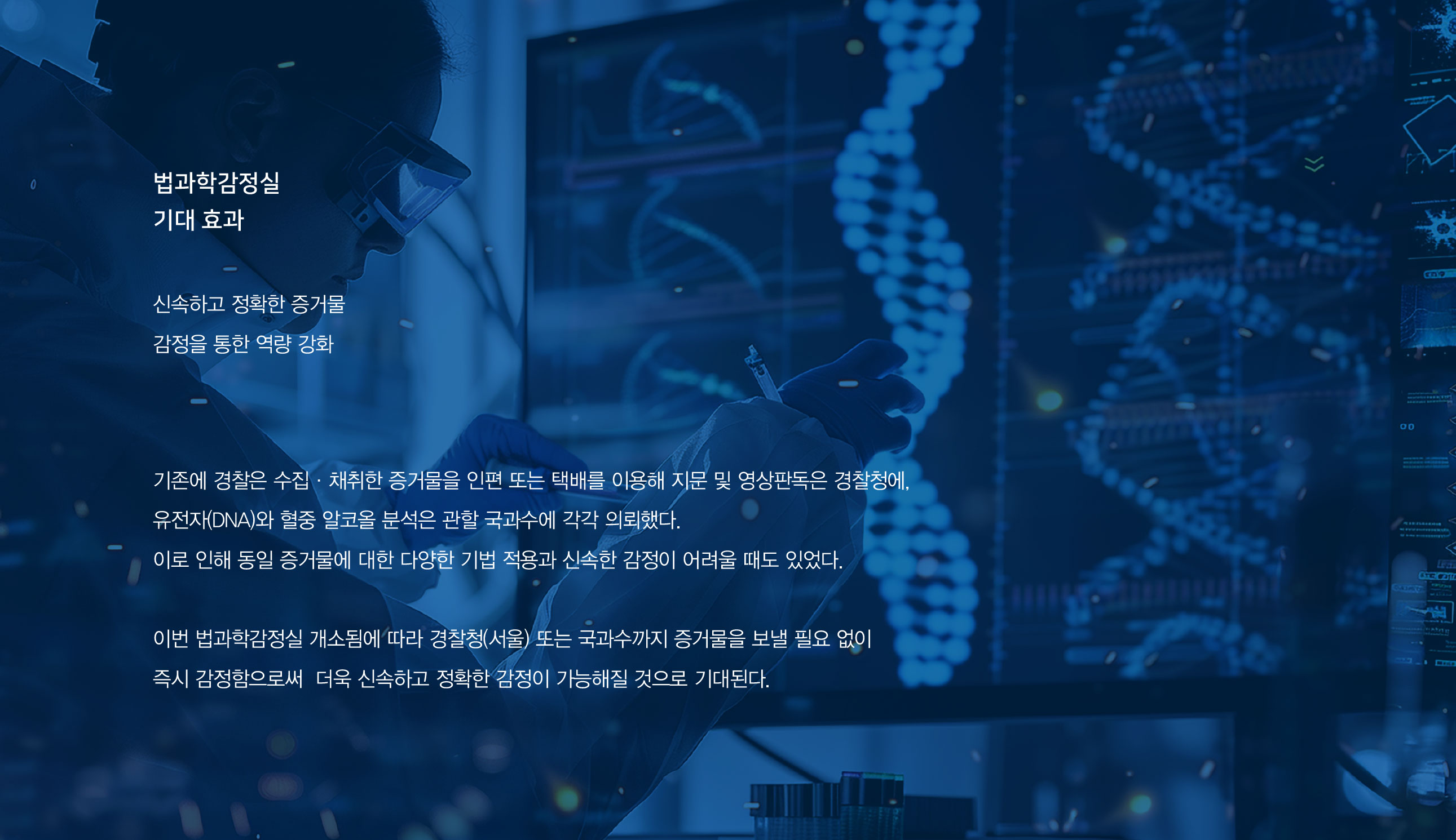 FL법과학감정실 BI 신속과 정확을 완성하는 통합 과학수사 기존 경찰의 수집·채취 증거물은 인편 또는 택배를 통해 경찰청, 유전자(DNA) 협조 기관 등으로 전달되는 방식으로 운영되어 왔다. 이 과정에서 동일 증거물에 대한 다양한 감정 기법 적용과 신속한 결과 도출에 한계가 발생하기도 했다. 특히 사건 대응의 골든타임 확보가 중요해지는 환경 속에서 보다 효율적이고 통합적인 감정 체계의 필요성이 지속적으로 제기되어 왔다. 이번 법과학감정실 개선 사업은 이러한 구조적 한계를 보완하고, 경찰청과 국과수 간 협업 기반의 신속·정확 감정 체계 구축을 핵심 목표로 추진되었다. 증거물 이동 과정에서 발생하는 시간 지연과 행정 비효율을 최소화하고, 현장 대응 중심의 과학수사 역량을 강화하는 것이 중요한 과제로 부각되었다. 이에 따라 본 프로젝트는 단순한 시설 개선을 넘어, 통합 감정 프로세스를 직관적으로 전달할 수 있는 브랜드 및 시각 아이덴티티 구축에 중점을 두었다. 복잡한 법과학 절차를 명확한 정보 구조와 시각 언어로 체계화함으로써, 내부 구성원의 업무 이해도와 대외 신뢰도를 동시에 높이고자 하였다. 또한 공공 치안 서비스의 특성을 고려하여 신뢰·정확·신속의 브랜드 핵심 가치가 일관되게 전달되는 디자인 시스템을 구축하고, 향후 확장 가능한 모듈형 아이덴티티 방향을 설정하였다. 이를 통해 법과학감정실이 첨단 과학수사의 컨트롤타워로서 갖는 위상을 시각적으로 강화하고, 국민에게는 더욱 믿을 수 있는 치안 이미지를 전달하는 것을 목표로 하였다. | ||||