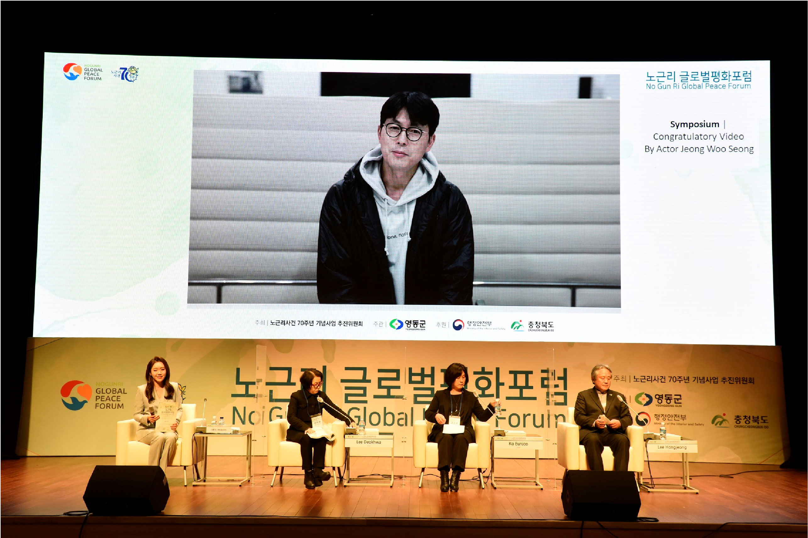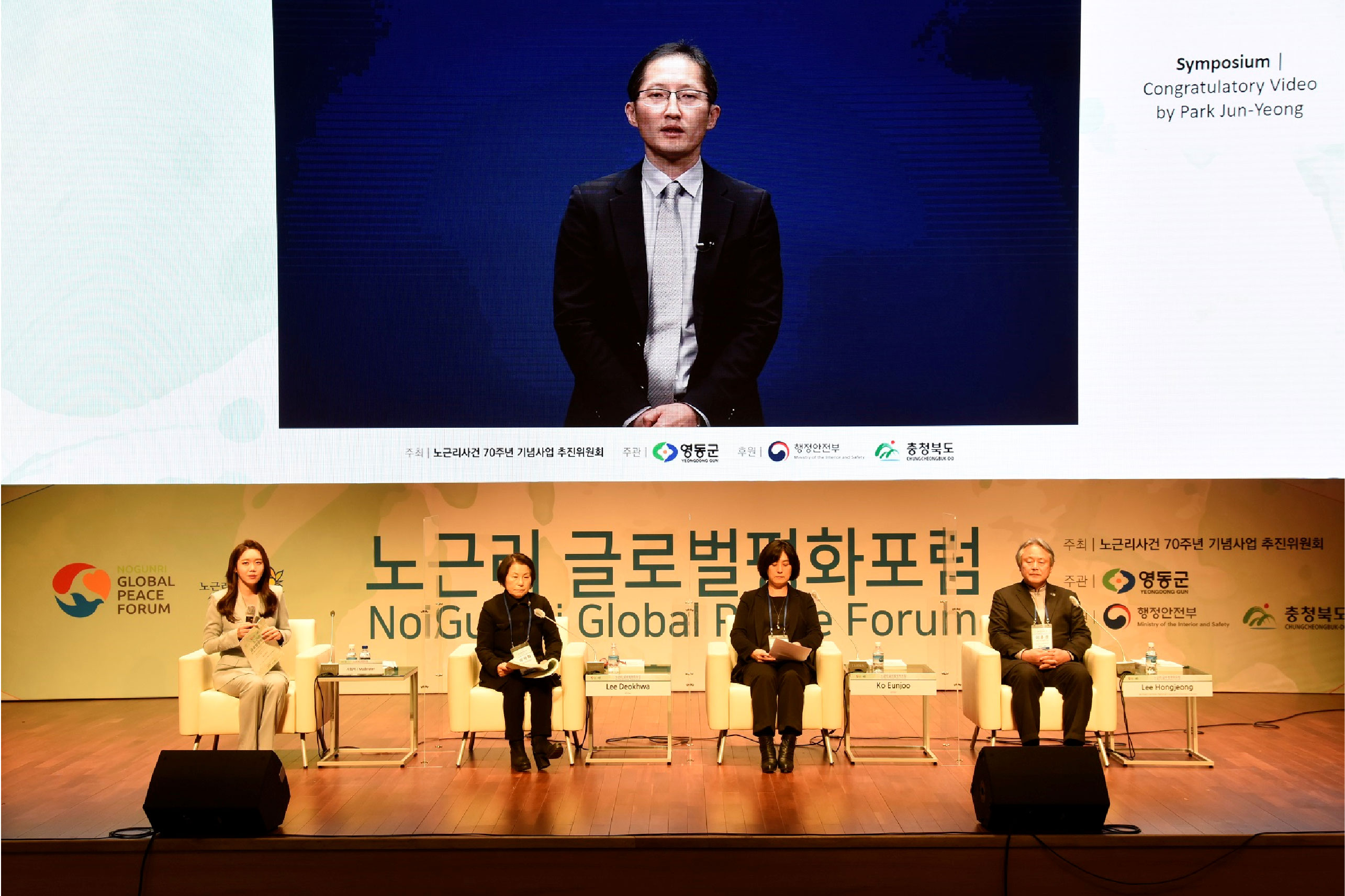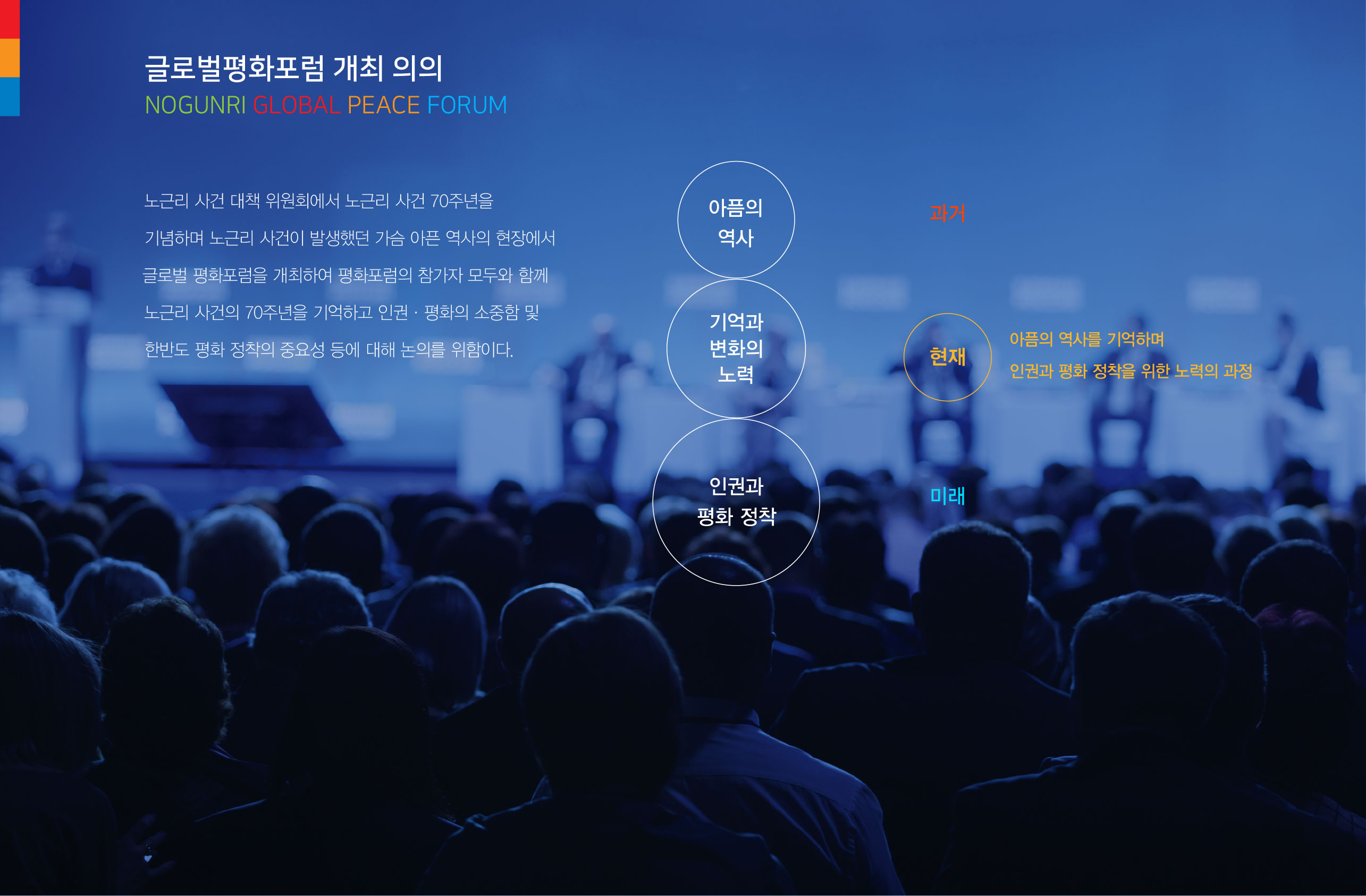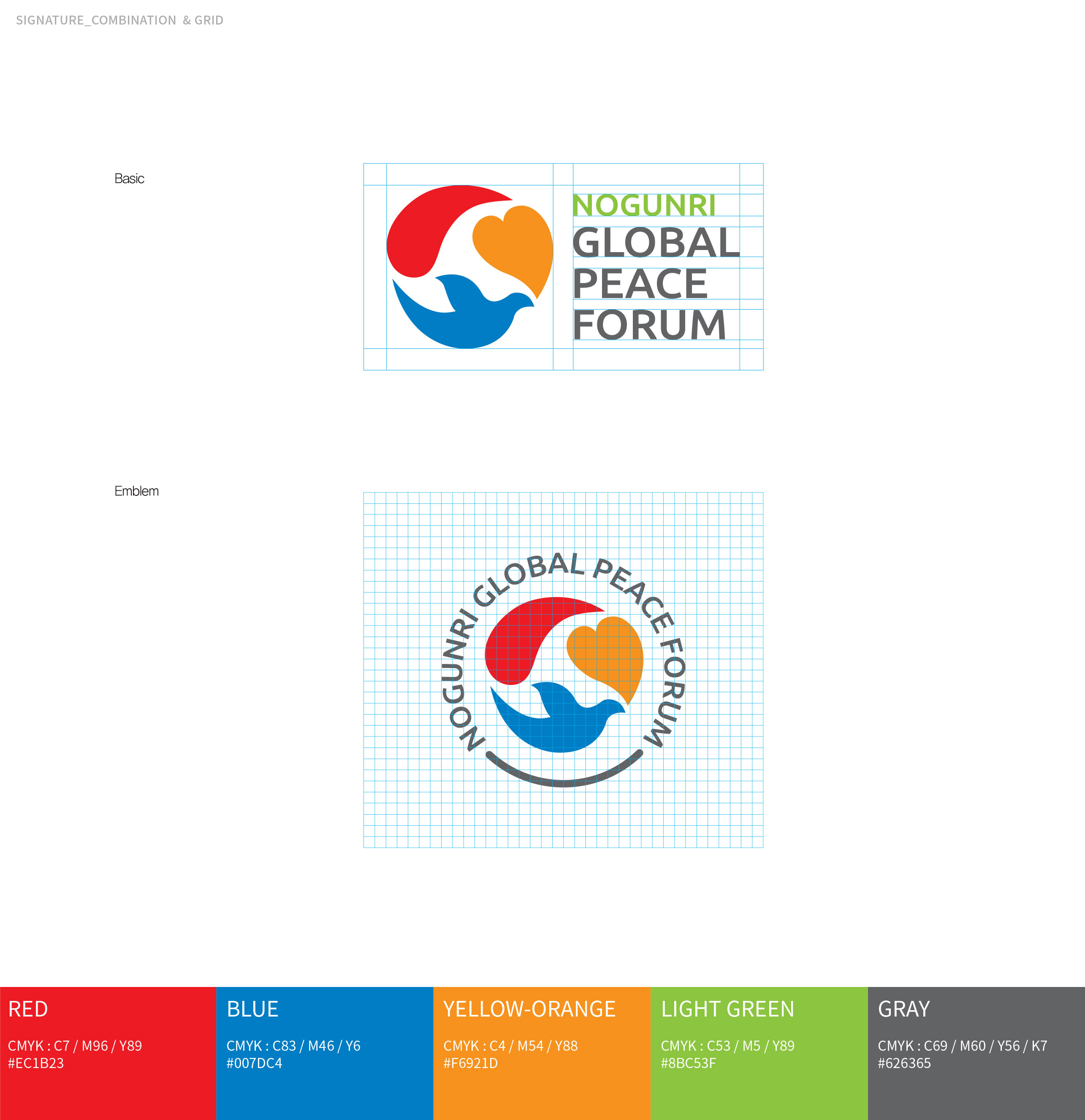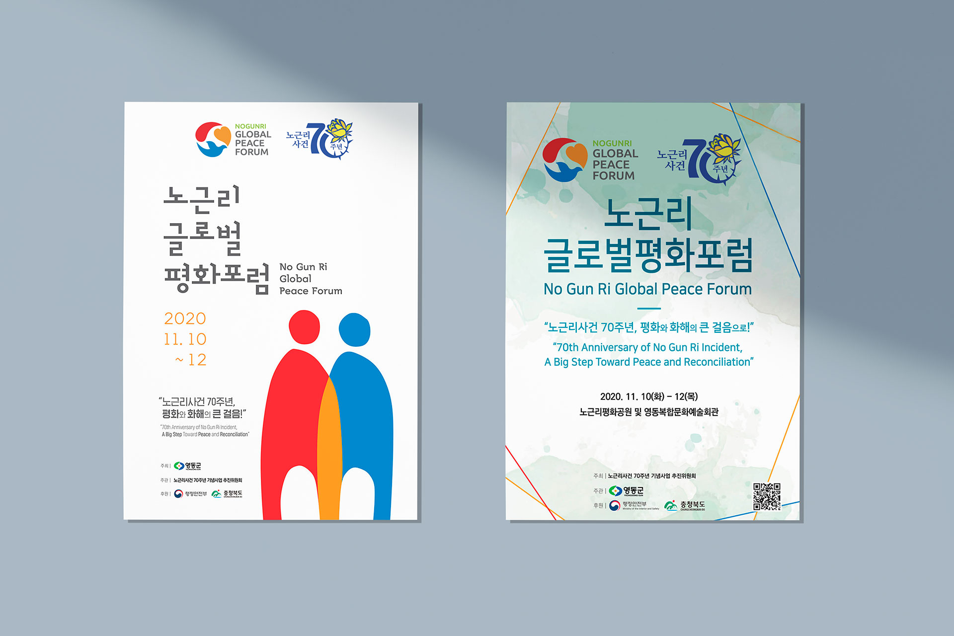 노근리글로벌평화포럼 BI 아픔의 역사를 넘어 인권의 가치로 노근리글로벌평화포럼은 노근리 사건 70주년을 계기로, 아픔의 역사를 국제적 평화 담론으로 확장하기 위해 기획된 작업이었다. 역사적 기억을 현재적 가치로 재해석하고, 이를 하나의 일관된 브랜드 디자인 시스템으로 정립하는 데 목적이 있었다. 브랜드 디자인은 과거–현재–미래라는 시간의 흐름을 중심 개념으로 설정하였다. ‘아픔의 역사’에서 출발해 ‘기억과 변화의 노력’을 거쳐 ‘인권과 평화의 정착’으로 이어지는 서사를 구조적으로 정리함으로써, 사건의 의미가 미래 가치로 확장되는 과정을 시각적으로 담아내고자 하였다. 기억을 단순한 기록이 아닌 지속적인 실천의 출발점으로 제시하는 것이 핵심 방향이었다. 전체 디자인은 감성적 접근과 공공적 메시지의 균형을 유지하며, 국제 포럼의 성격에 부합하는 신뢰감과 보편성을 확보하는 데 중점을 두었다. 또한 단발성 행사가 아닌 지속 가능한 담론 플랫폼으로 확장될 수 있도록 구조적 일관성과 적용 가능성을 고려하여 설계된 프로젝트였다. | ||||