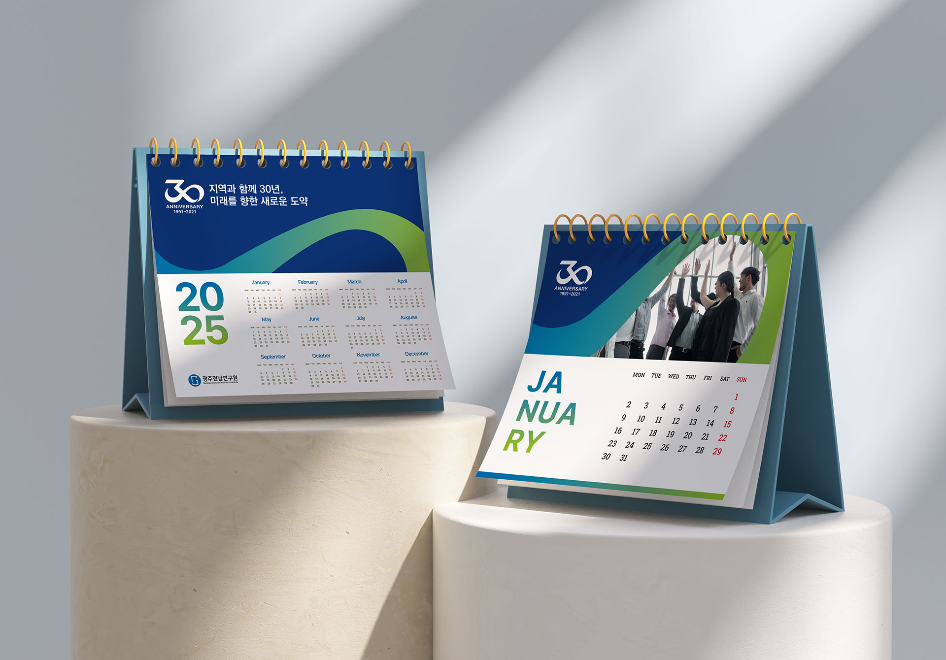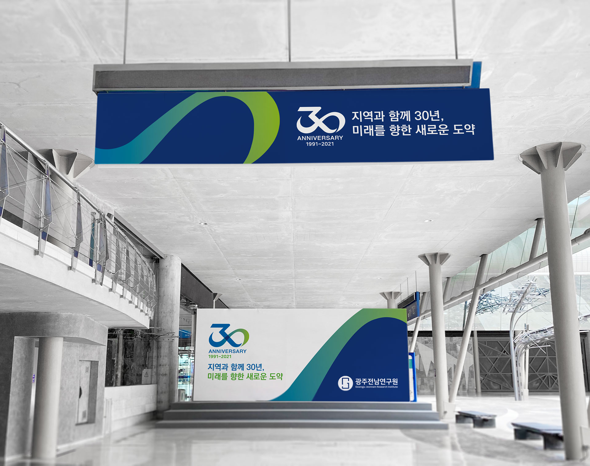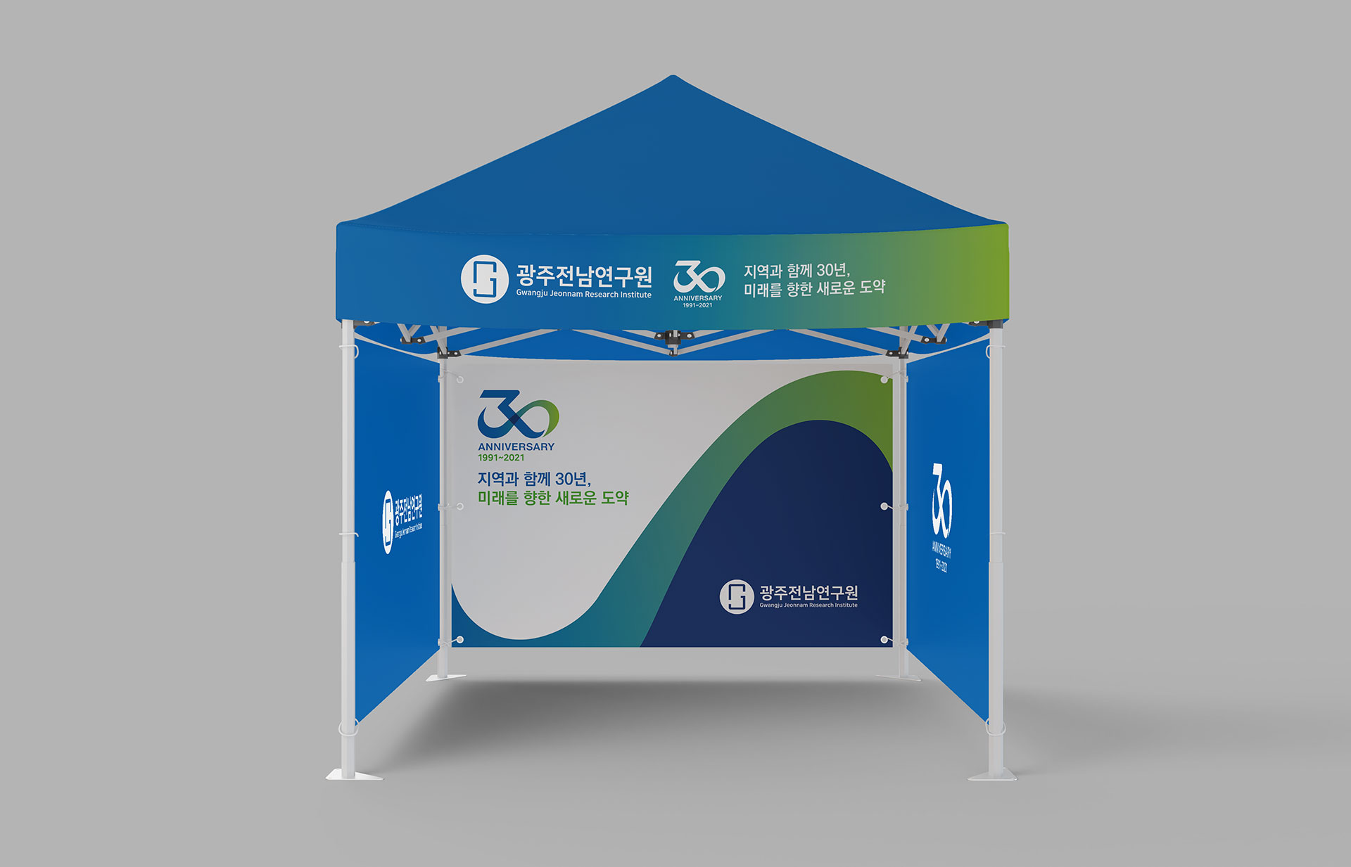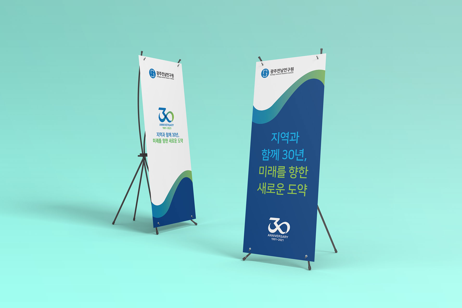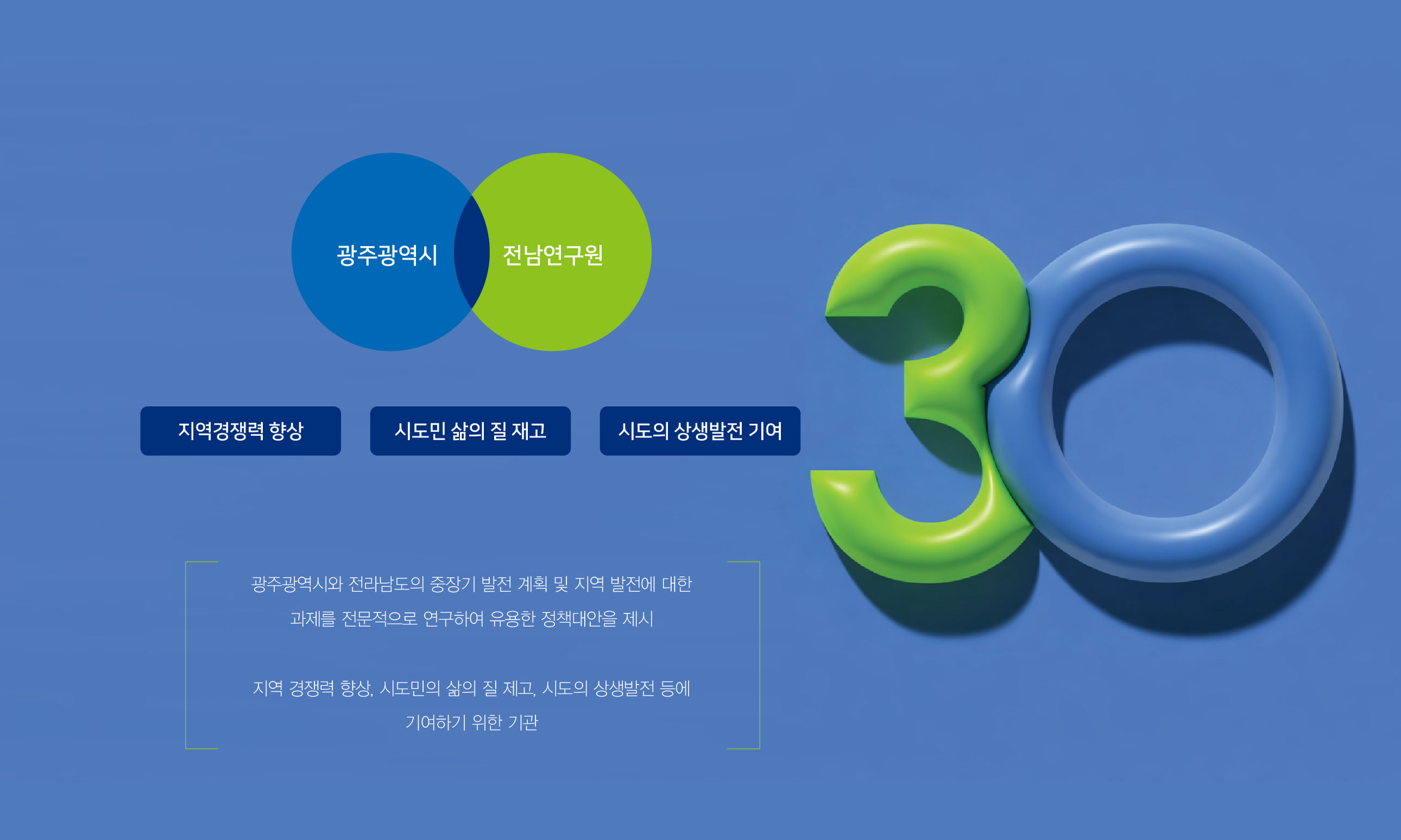 광주전남연구원 30주년 엠블럼 30년의 연구, 지역의 미래를 설계하다 광주전남연구원 30주년 엠블럼 개발은 단순한 기념 표식 제작이 아닌, 기관의 정체성과 30년의 축적된 성과를 상징적으로 재정립하는 작업이었다. 광주광역시와 전라남도의 공동 발전 전략을 연구해 온 기관으로서, 이번 30주년은 지난 성과를 돌아보고 미래 비전을 재확인하는 전환점의 의미를 지니고 있었다. 광주전남연구원은 지역 경쟁력 향상, 시도민 삶의 질 제고, 도시의 상생발전 기여라는 설립 목적 아래 정책 연구를 수행해 온 공공 연구기관이다. 이에 따라 엠블럼 개발은 단순한 연차 표기가 아닌, 광주광역시와 전라남도의 협력 구조와 공동 비전을 상징적으로 담아내는 브랜드 전략 수립 과정이었다. 특히 두 지역의 연결성과 통합적 연구 기능을 강조하며, 상호 협력과 균형 발전이라는 핵심 가치를 시각적 구조 안에 반영하였다. 이는 지역 단위 연구기관을 넘어, 광역권 정책 싱크탱크로서의 위상을 명확히 드러내기 위한 방향 설정이었다. 본 브랜드 개발은 30년의 축적된 정책 연구 경험을 기반으로, 앞으로의 미래 전략을 제시하는 기관의 역할을 재정의하는 데 초점을 두었다. 과거의 성과를 기념하는 동시에, 미래 30년을 향한 비전과 책임을 담아내는 상징 체계를 구축하는 것이 핵심이었다. | ||||