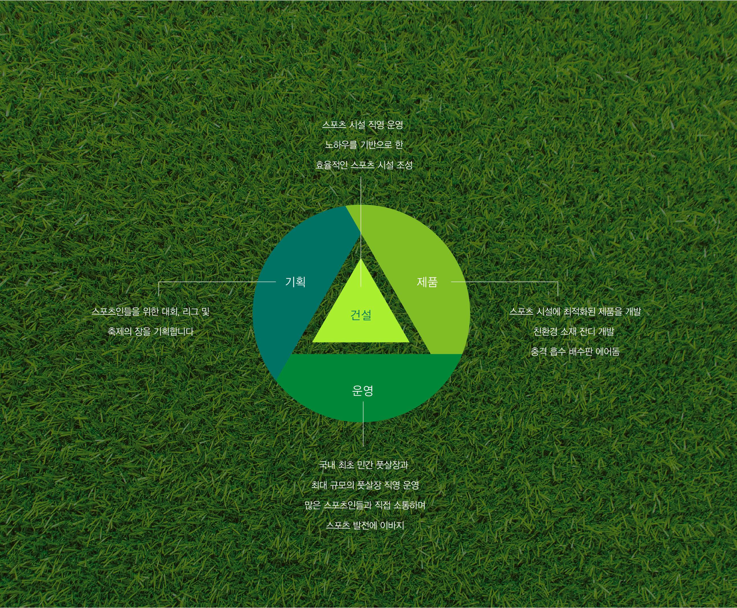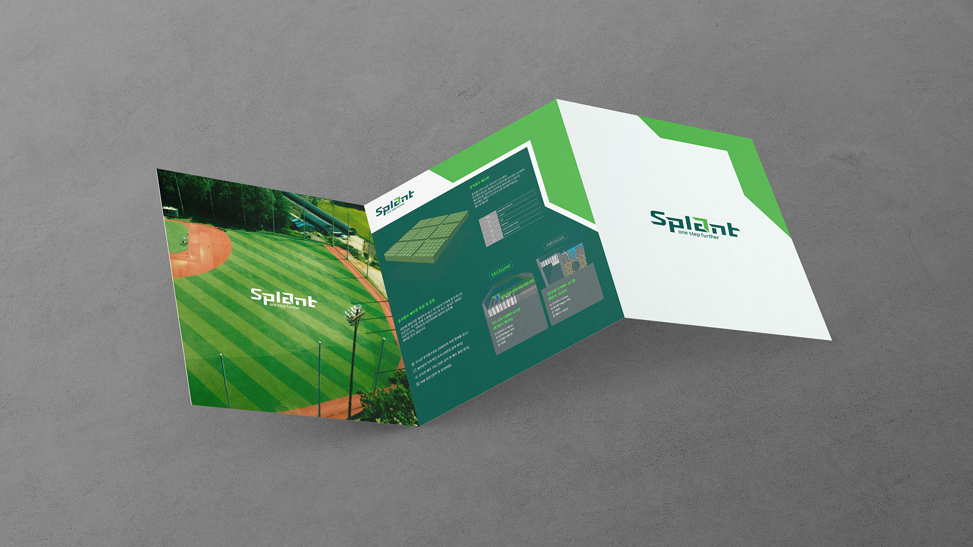 스플랜트 CI 친환경 스포츠 인프라의 새로운 기준 스플랜트는 국내 스포츠 기반 시설 산업의 확장 흐름 속에서, 기존 사업 영역을 재정비하고 미래 지향적 기업 이미지를 구축하기 위한 전략적 작업이었다. 국내 최초로 민간 풋살구장을 도입·운영하며 스포츠 시설 민간투자사업(BTO)을 통해 대규모 구장을 직접 건설·운영해 온 기업으로서, 단순 시설 운영 기업을 넘어 스포츠 문화를 선도하는 전문 브랜드로의 전환이 필요한 시점이었다. 스플랜트는 스포츠 기반 시설의 건설과 운영을 넘어, R&D, 제품 개발, 컨설팅, 스포츠 마케팅까지 사업 영역을 확장하며 산업 전반을 아우르는 구조로 성장하고 있었다. 이에 따라 브랜드는 기존 모기업의 일부 사업이 아닌, 독립적이고 혁신적인 전문 기업으로서의 정체성을 명확히 정립할 필요가 있었다. 기존 R&D 센터와 제품 부문을 분리해 자회사로 설립한 것은 친환경·혁신 중심 기업으로 도약하기 위한 전략적 결정이었다. 브랜드 방향성은 ‘한 걸음 더(ONE STEP FURTHER)’라는 메시지 아래, 스포츠 시설 산업의 기준을 한 단계 끌어올리는 기업이라는 이미지를 구축하는 데 초점을 두었다. 이는 단순한 시설 공급이 아니라, 스포츠 환경의 질적 향상과 참여 문화 확산에 기여하는 플랫폼 기업으로 자리매김하기 위한 선언적 의미를 담고 있다. 스플랜트는 스포츠 공간을 설계하는 기업을 넘어, 스포츠 산업의 미래를 설계하는 브랜드로 재정의되었다. | ||||