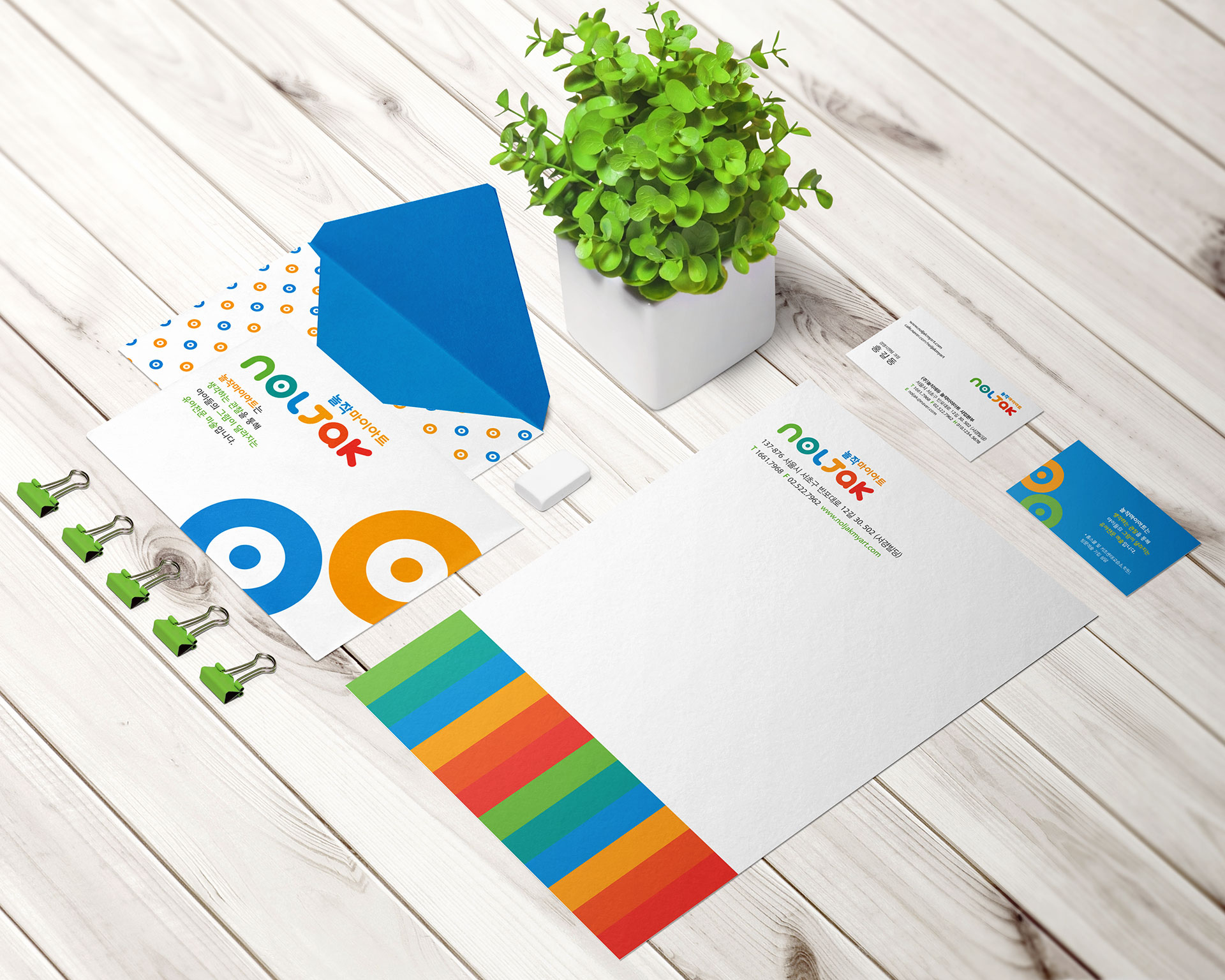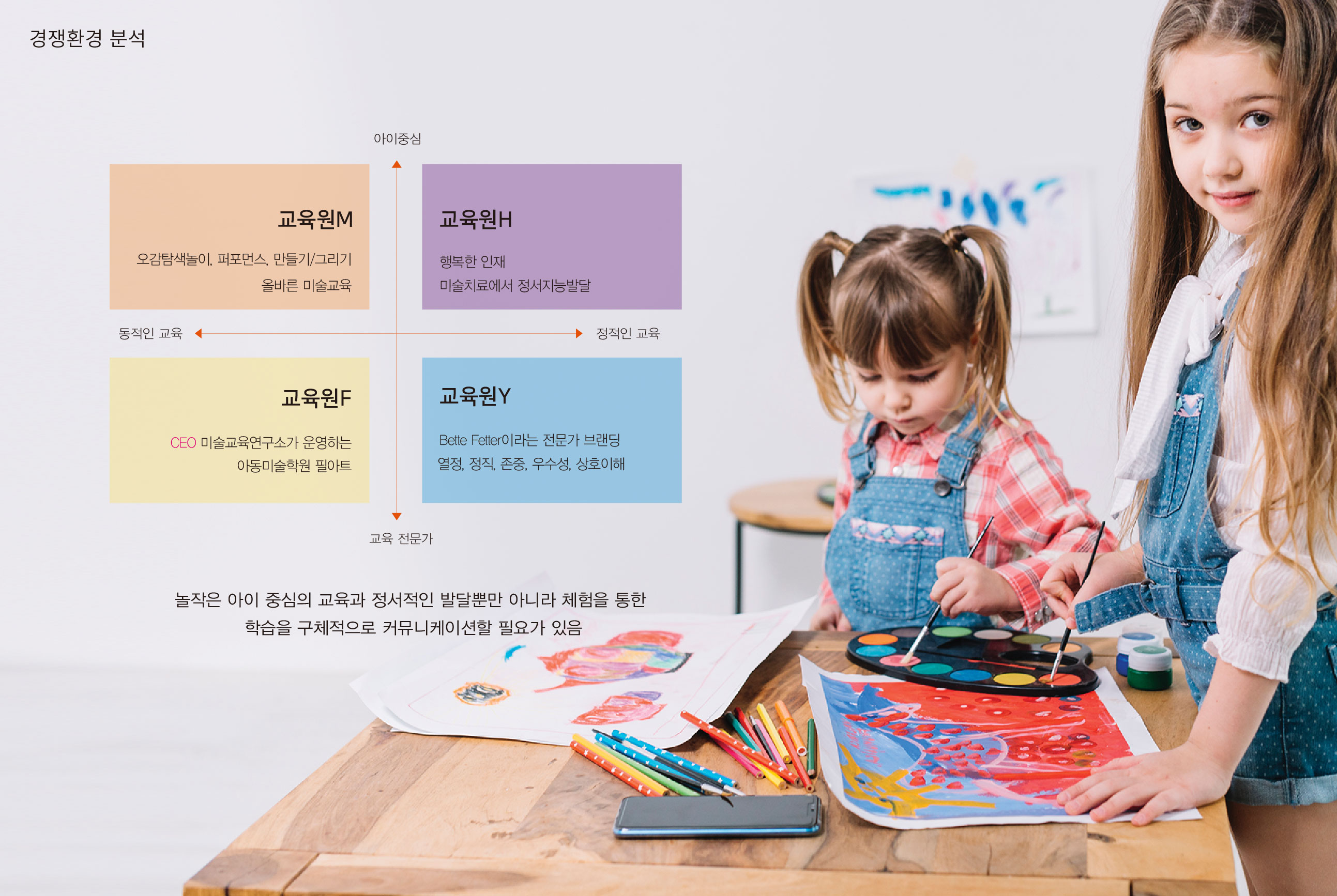 놀작마이아트 관찰에서 시작되는 창의 성장 플랫폼 놀작마이아트는 유아미술 교육 시장에서 후발주자로 출발해 단기간 내 국내 최대 교육원을 운영하는 기업으로 성장한 배경 속에서, 기업 차원의 브랜드 체계를 정립이 필요한 상황이었다. 단순 교육 프로그램 브랜드를 넘어, 글로벌 교육 기업으로 도약하기 위한 통합 브랜드 플랫폼 구축이 핵심 과제였다. 미국과 독일을 포함한 11개국으로 확장된 교육 네트워크는 브랜드의 국제적 정체성 확립을 요구하고 있었으며, 한국과 동일한 교육 운영 마인드와 경영 원칙을 유지하는 일관된 브랜드 메시지가 필요했다. 이에 따라 브랜드는 ‘생각하는 관찰, 창의적인 표현’이라는 교육 철학을 중심 가치로 설정하고, 제품 중심 인식에서 기업 비전 중심 구조로 재정비되었다. 2014년을 기점으로 지속적인 기업 성장과 함께 브랜드 전략 관리의 중요성이 부각되었고, 기존 제품 브랜드의 시각적 아이덴티티 정비를 넘어 기업 브랜드의 방향성과 사업 정의를 새롭게 설정하였다. 패밀리 브랜드의 인지도를 기반으로 개별 브랜드를 체계적으로 확장하고, 명확한 메시지 구조를 수립하는 것이 브랜드 전환의 핵심 전략이었다. | ||||