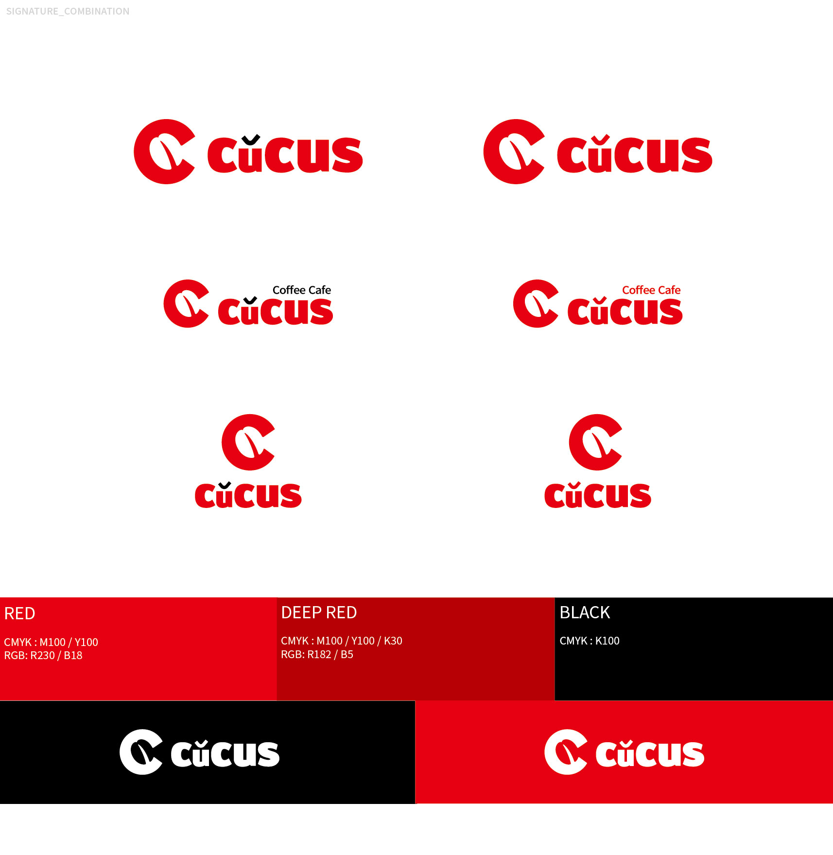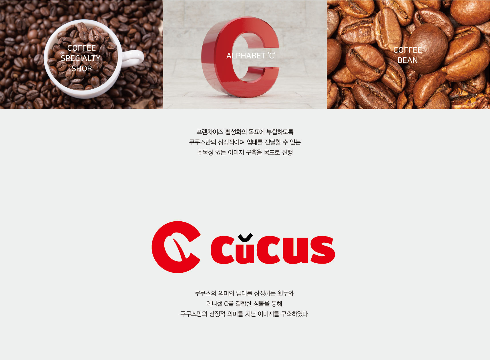 쿠쿠스커피 BI 원두부터 다르게, 커피의 가치를 높이다 쿠쿠스는 라틴어로 프랑스식 원두커피를 상징하는 이름으로, 커피 전문 브랜드로서의 정체성을 분명히 하기 위한 출발점에서 브랜드 개발이 시작되었다. 기존 저가 커피 시장의 한계를 넘어, 보다 차별화된 품질과 경험을 제공하는 커피 전문점으로 자리매김하는 것을 목표로 설정하였다. 커피의 전문성과 원두의 경쟁력을 핵심 가치로 삼아, 매장 방문 순간부터 브랜드의 철학과 품질이 자연스럽게 전달될 수 있는 통합적인 브랜드 구조가 요구되었다. 특히 프랜차이즈 확장을 고려한 명확하고 일관된 브랜드 인식 구축이 중요한 과제로 설정되었다. 이에 따라 CUCUS COFFEE의 브랜드 개발은 ‘커피 전문성·원두·차별성’이라는 핵심 요소를 중심으로, 소비자가 한눈에 인식할 수 있는 강력한 시각적 아이덴티티를 구축하는 방향으로 진행되었으며, 향후 가맹 확장과 시장 경쟁력 강화를 위한 기반을 마련하는 데 초점을 두었다. | ||||