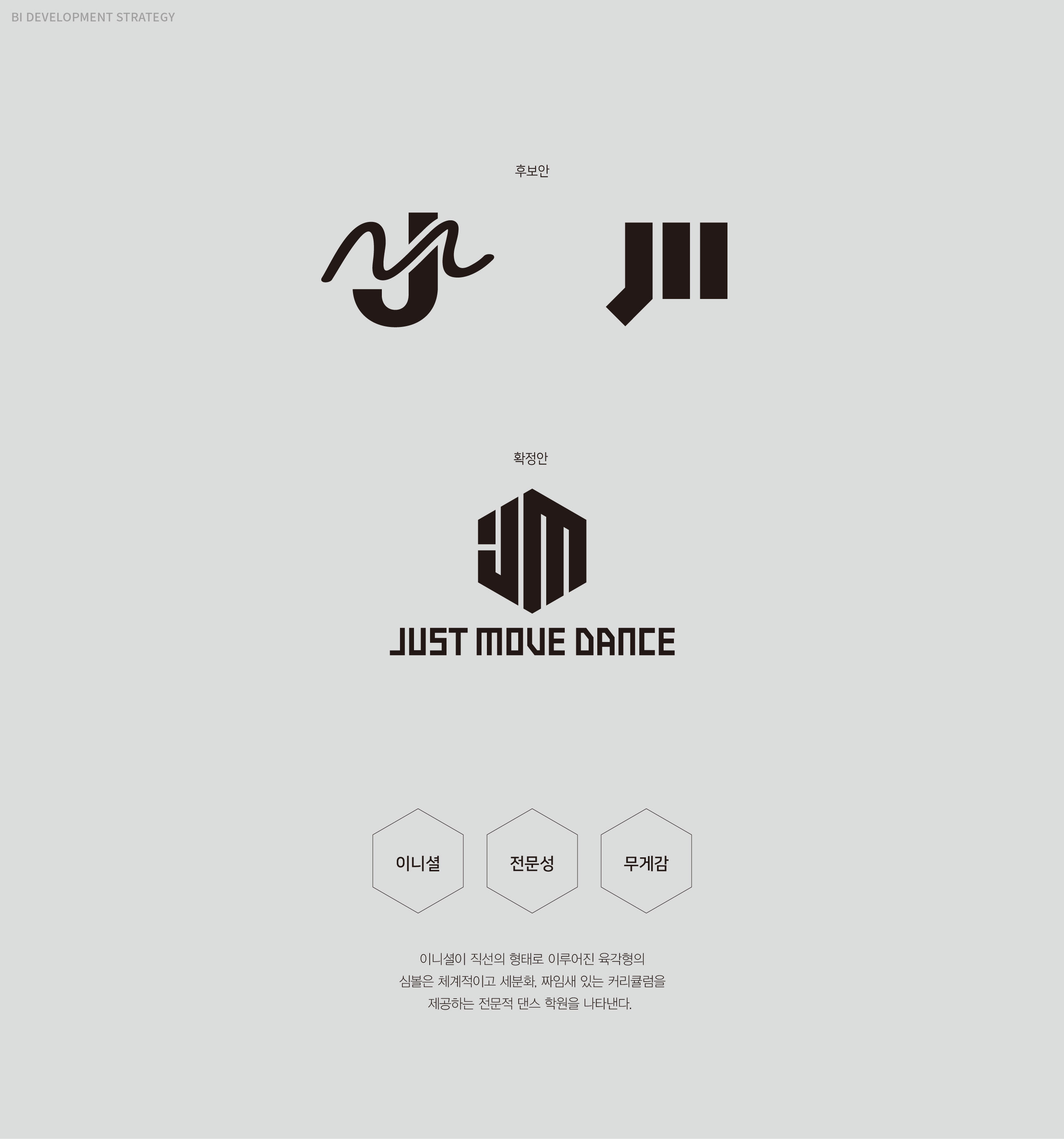 저스트무브댄스학원 CI 취미부터 전문가까지 성장하는 댄스 아카데미 저스트무브댄스학원은 세분화된 클래스 운영과 체계적인 교육 시스템을 기반으로 다양한 수준의 수강생이 전문적인 댄스 교육을 받을 수 있는 교육 환경 구축을 목표로 하였다. 최근 댄스 문화의 대중화와 함께 취미 활동에서 전문 진로 준비까지 교육 수요가 빠르게 확대되면서, 수강 목적과 실력 단계에 맞춘 맞춤형 교육 체계의 필요성이 더욱 강조되었다. 이에 따라 단순한 취미 교육을 넘어 개인의 성장과 목표 달성을 지원하는 전문 교육기관으로서의 역할이 중요해졌다. 이러한 변화에 대응하기 위해 학원의 전문성과 교육 신뢰도를 효과적으로 전달할 수 있도록 통합된 브랜드 이미지와 체계적인 교육 기관으로서의 상징적 아이덴티티 구축을 핵심 과제로 설정하였다. 또한 교육 프로그램, 강사진, 운영 시스템의 강점을 시각적으로 일관되게 전달하여 학원이 지향하는 교육 철학과 차별성을 명확하게 인식시키고자 하였다. 더불어 다양한 연령층과 교육 목적을 포괄할 수 있도록 즐거움과 전문성을 동시에 전달하는 교육 브랜드 이미지를 강화하고, 누구나 자신의 가능성을 발견하고 성장의 즐거움을 경험할 수 있는 공간이라는 메시지를 담아 브랜드 개발을 진행하였다. 이를 통해 신뢰와 전문성을 기반으로 지속적으로 성장하는 댄스 교육 브랜드로 자리매김하고자 하였다. | ||||