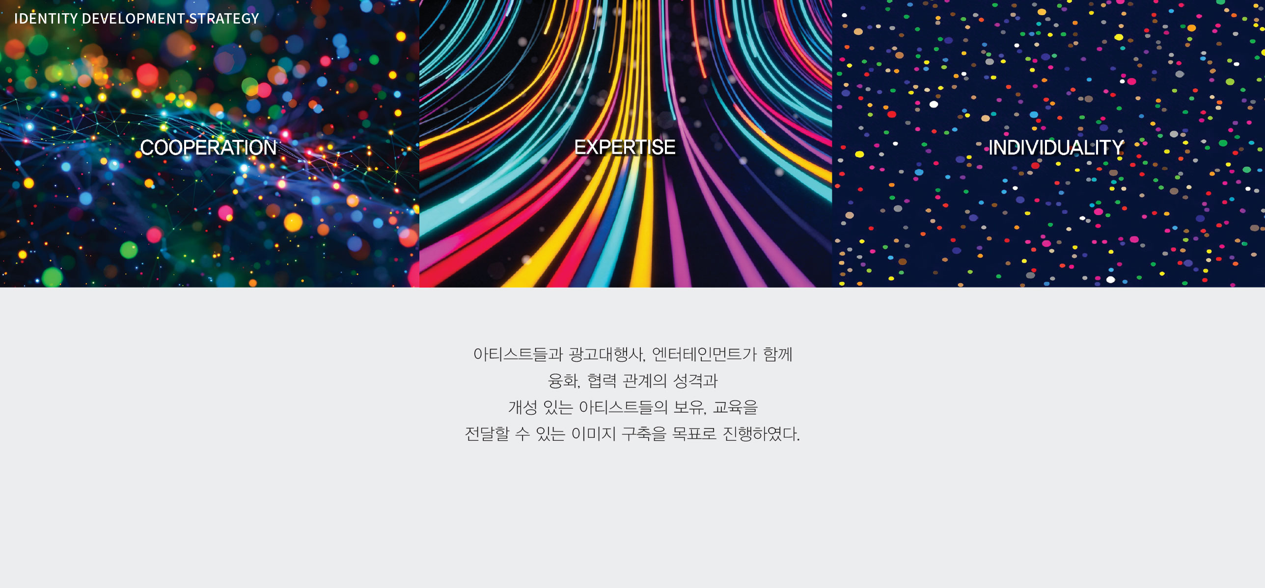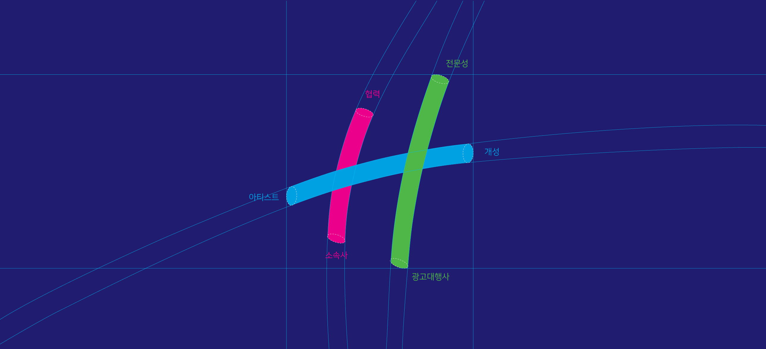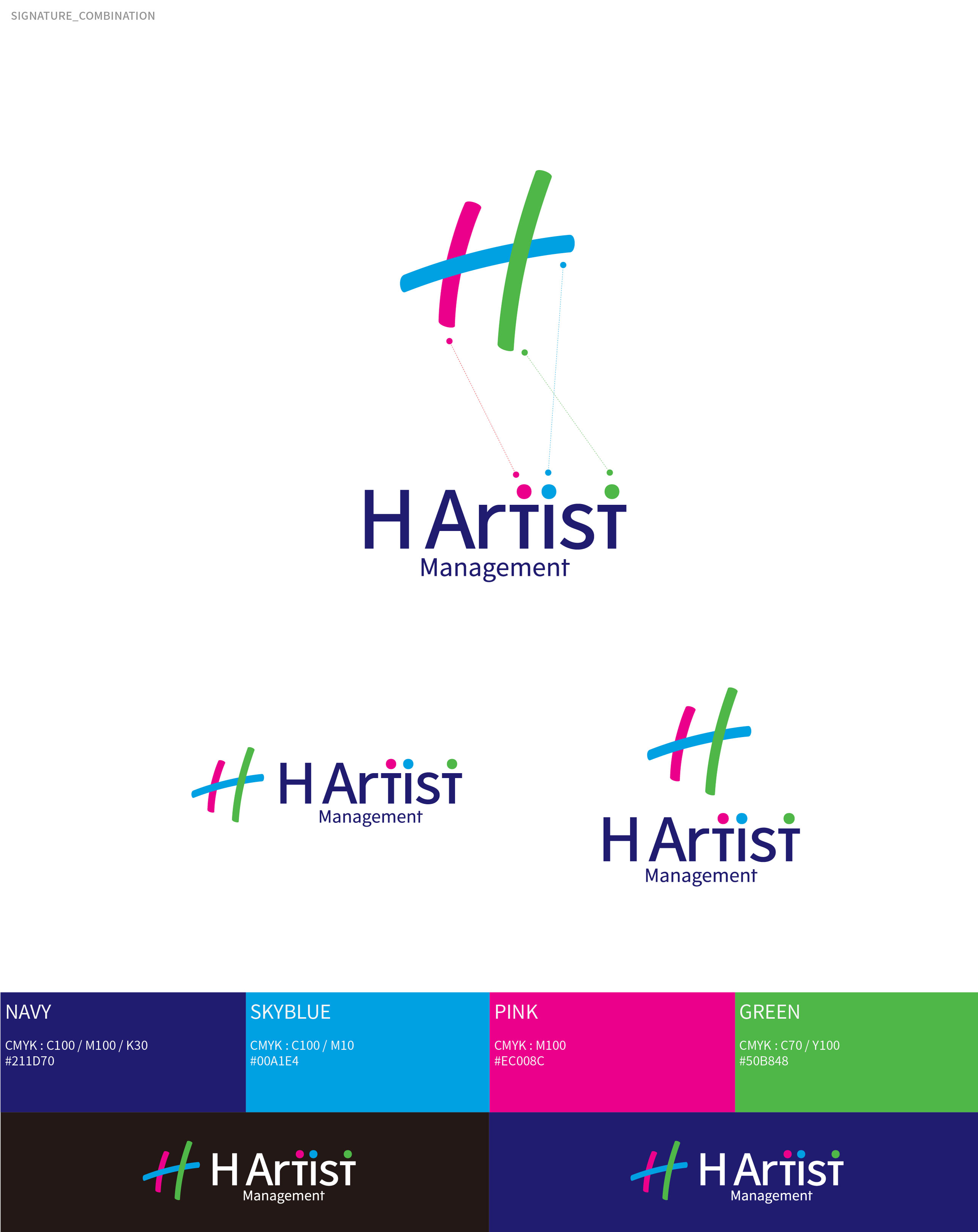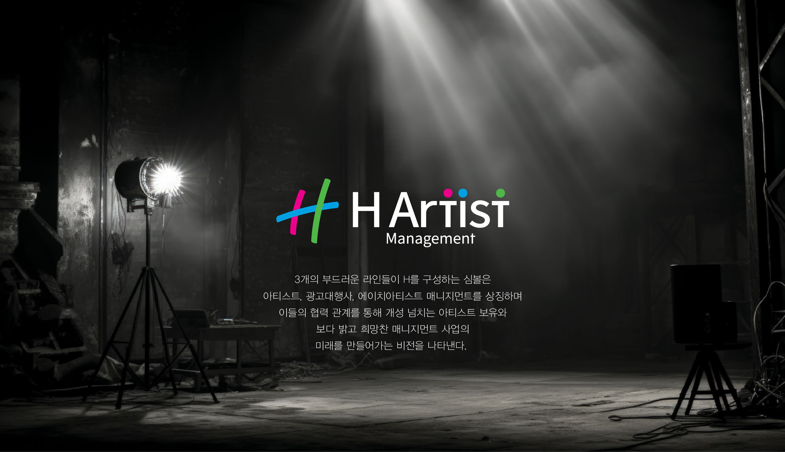 에이치아티스트 CI 아티스트의 성장과 가치를 함께하는 통합 매니지먼트 에이치아티스트 매니지먼트는 엔터테인먼트 산업의 빠른 성장과 함께 아티스트·소속사·광고대행 기능이 통합된 전문 매니지먼트 시스템의 필요성이 확대되면서 브랜드 아이덴티티 개발이 요구되었다. 다양한 미디어 플랫폼과 콘텐츠 시장의 확장으로 인해 아티스트의 활동 영역이 방송, 광고, 디지털 콘텐츠 등으로 다변화되면서, 체계적인 관리와 전문적인 매니지먼트 역량을 갖춘 브랜드 이미지 구축이 중요한 과제로 부각되었다. 또한 실력 있는 아티스트 발굴과 체계적인 교육·관리 시스템을 기반으로 한 차별화된 매니지먼트 경쟁력을 효과적으로 전달하기 위해, 협력과 개성, 전문성을 핵심 가치로 한 통합된 브랜드 이미지를 구축하고자 하였다. 광고주와 콘텐츠 제작사, 아티스트 간의 원활한 협업 구조를 상징적으로 표현하여 신뢰성과 비즈니스 확장성을 동시에 전달할 수 있는 브랜드 방향이 설정되었다. 이에 따라 에이치아티스트 매니지먼트는 아티스트의 성장과 브랜드 가치 상승을 함께 만들어가는 파트너형 엔터테인먼트 기업 이미지를 강화하고, 다양한 콘텐츠 환경에서도 일관되게 적용될 수 있는 전문적이고 현대적인 브랜드 아이덴티티 개발을 목표로 프로젝트가 진행되었다. | ||||