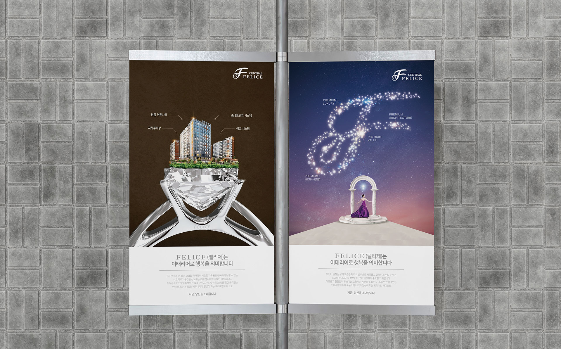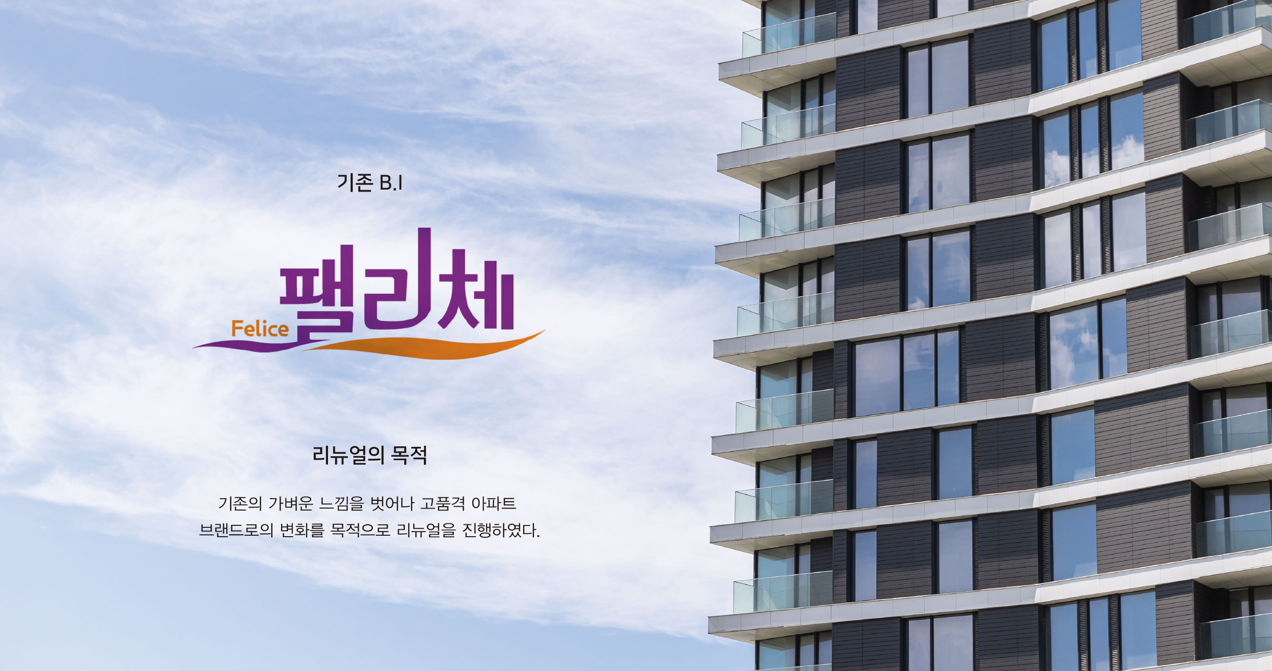 센트럴 팰리체 BI 리뉴얼 품격 있는 일상을 완성하는 프리미엄 주거 센트럴 펠리체는 기존 브랜드가 지니고 있던 가벼운 이미지에서 벗어나 프리미엄 주거 브랜드로의 위상 강화를 필요로 하는 시점에 브랜드 리뉴얼이 추진되었다. 주거 공간에 대한 소비자의 기대 수준이 높아지면서 단순한 아파트 브랜드를 넘어, 품격 있는 라이프스타일을 상징할 수 있는 브랜드 아이덴티티 구축이 중요한 과제로 대두되었다. 특히 신규 주거 단지와의 경쟁이 심화되는 시장 환경 속에서 고급감과 차별화된 주거 가치, 안정감 있는 브랜드 신뢰도를 동시에 전달할 수 있는 시각적 이미지 개선이 요구되었다. 이에 따라 브랜드의 명칭이 지닌 의미와 프리미엄 주거 환경의 가치를 시각적으로 강화하고, 다양한 매체와 공간 환경에서도 일관되게 적용될 수 있는 통합 디자인 시스템을 구축하는 것을 목표로 리뉴얼이 진행되었다. 또한 고급·우아함·품격이라는 핵심 가치를 중심으로 한 브랜드 정체성 재정립을 통해, 입주민에게는 자부심을, 외부 고객에게는 신뢰와 선호도를 높일 수 있는 프리미엄 아파트 브랜드 이미지를 형성하고자 하였다. | ||||