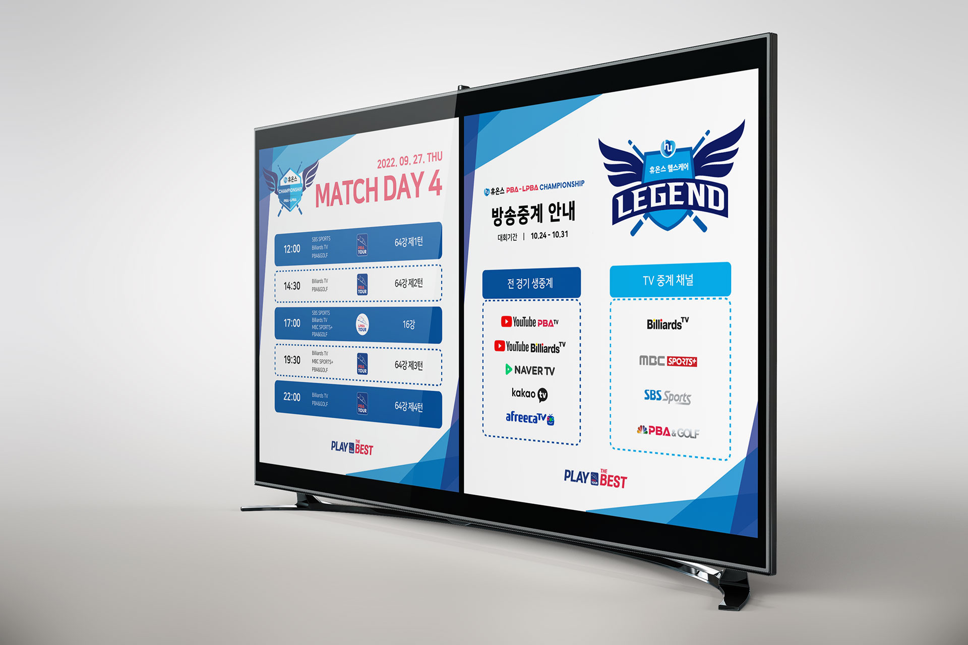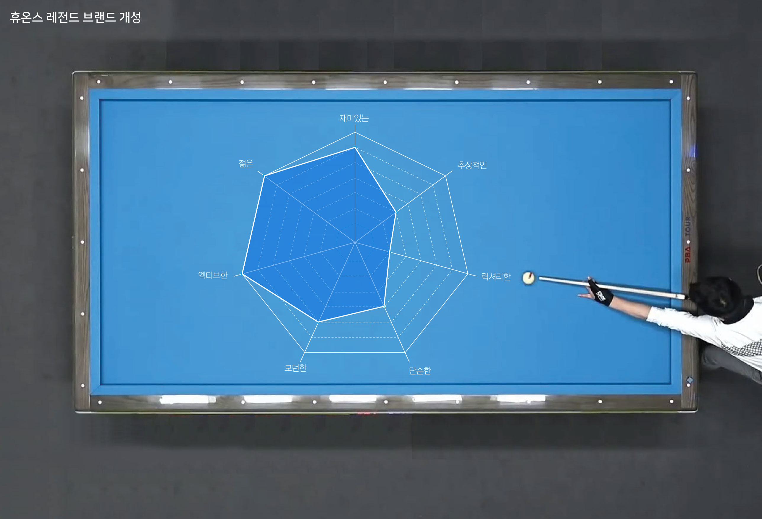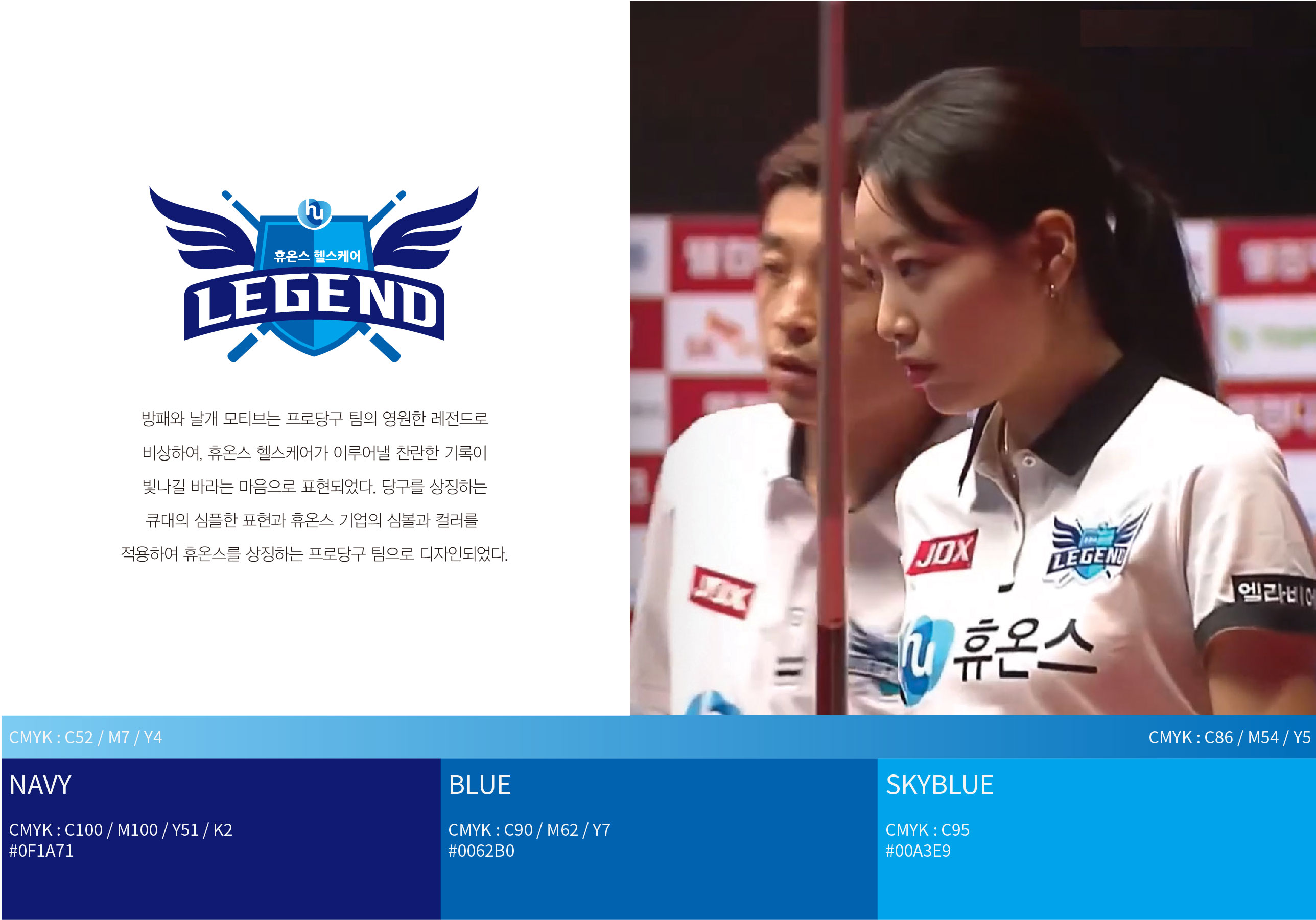 휴온스 헬스케어 레전드 BI 휴온스 프로당구단 창단 휴온스는 ‘인류 건강을 위한 의학적 해결책 제시’라는 기업 미션을 기반으로 다양한 사회공헌 활동을 추진해 왔으며, 스포츠 분야 후원을 통해 기업의 건강 철학과 사회적 가치를 더욱 적극적으로 전달하고자 하였다. 특히 프로당구단 창단은 단순한 스포츠 후원을 넘어, 건강·도전·성장이라는 기업 핵심 가치를 대중에게 효과적으로 전달할 수 있는 커뮤니케이션 플랫폼을 구축하기 위한 전략적 활동으로 추진되었다. 프로당구 리그의 성장과 함께 팀의 대외 활동과 미디어 노출이 확대되면서, 구단의 정체성과 기업 이미지를 동시에 전달할 수 있는 차별화된 팀 브랜드 아이덴티티의 필요성이 크게 증가하였다. 이에 따라 휴온스가 지향하는 신뢰, 전문성, 도전 정신을 시각적으로 표현하고, 팬과 대중이 쉽게 인식하고 공감할 수 있는 통합된 브랜드 이미지를 구축하고자 브랜드 개발이 진행되었다. 또한 선수단의 팀워크와 경쟁력을 강조하고, 스포츠를 통한 건강한 라이프스타일과 기업의 사회적 책임 이미지를 강화할 수 있는 장기적인 브랜드 자산 구축을 목표로 아이덴티티 개발 방향이 설정되었다. | ||||