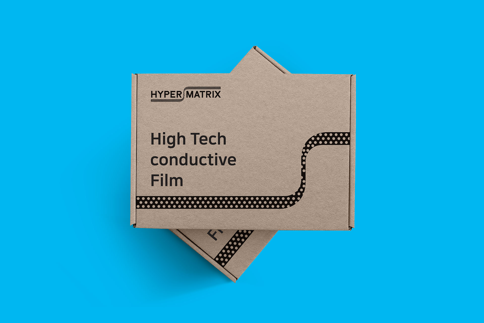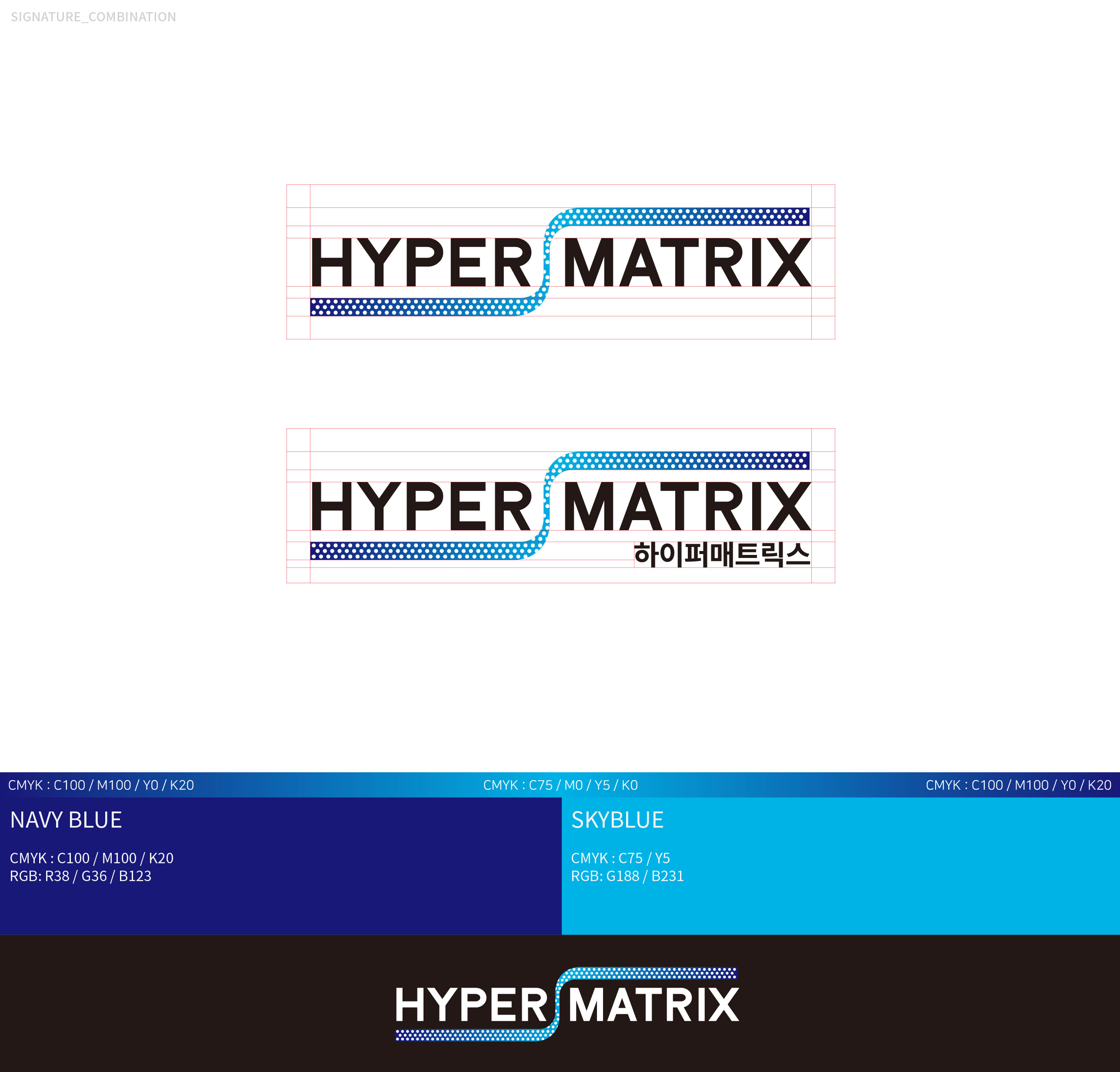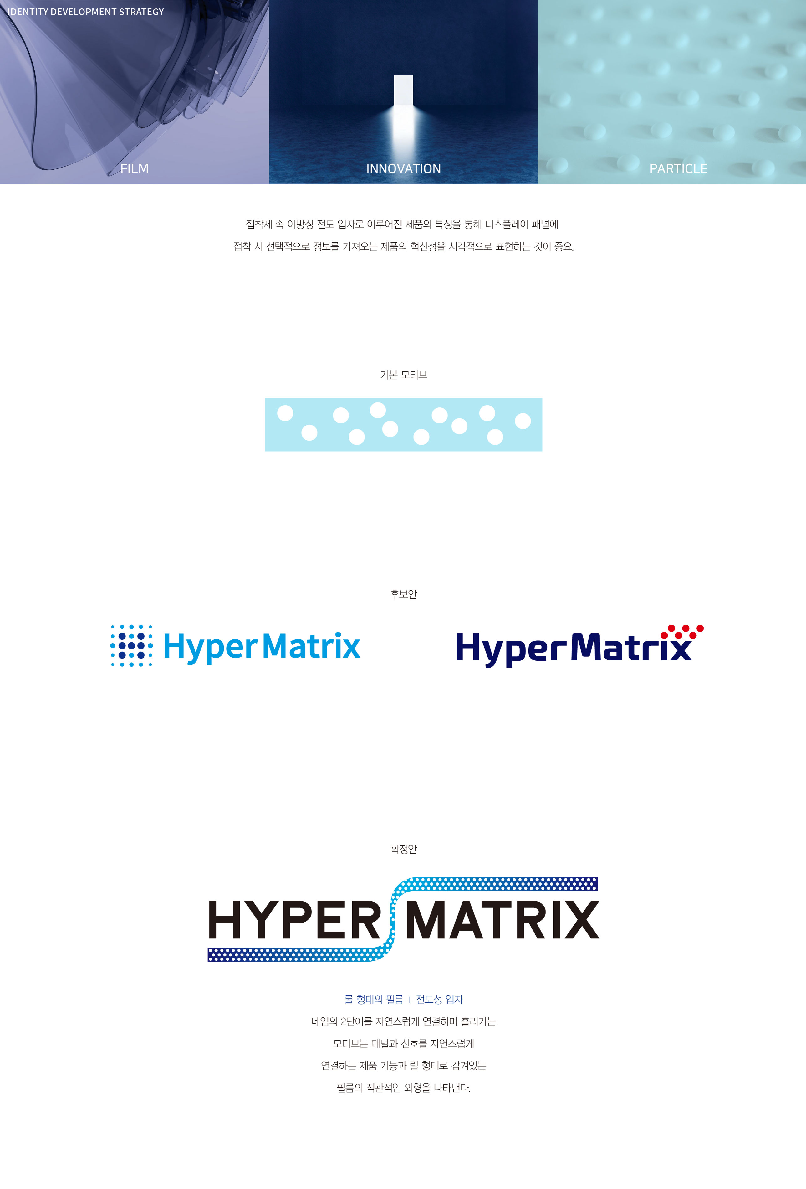 하이퍼 매트릭스 BI 혁신 소재 기술이 만드는 미래형 기능성 필름 국도화학의 첨단 소재 기술을 기반으로 개발된 하이퍼매트릭스는 디스플레이 산업의 고도화와 함께 요구되는 차세대 기능성 필름 시장의 확대에 대응하기 위해 기획되었다. 특히 디스플레이 패널의 초고해상도화, 경량화, 슬림화가 빠르게 진행되면서 단순한 보호 필름을 넘어 전도성과 기능성을 동시에 구현할 수 있는 혁신 소재의 필요성이 더욱 커지고 있었다. 이에 따라 하이퍼매트릭스는 국도화학이 보유한 화학 소재 연구 역량과 글로벌 생산 기술을 기반으로 이방성 전도 입자 기술을 적용한 차별화된 필름 브랜드로 개발되었으며, 제품의 성능뿐 아니라 혁신성과 신뢰성을 동시에 전달할 수 있는 브랜드 아이덴티티 구축이 요구되었다. 또한 글로벌 전자·디스플레이 제조사와의 협력 확대를 고려하여 기술 전문성과 미래지향적 이미지를 동시에 표현할 수 있는 브랜드 전략이 필요하였으며, 이를 통해 첨단 소재 기업으로서의 기술 리더십과 글로벌 경쟁력을 강화하는 것을 핵심 목표로 브랜드 개발이 진행되었다. | ||||