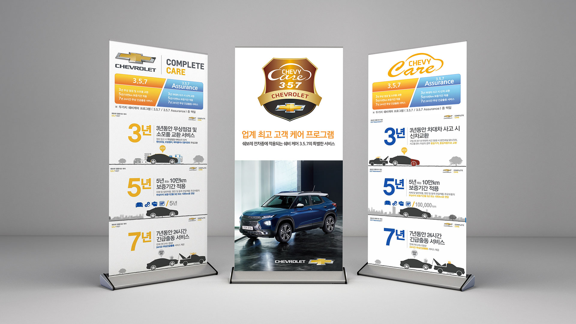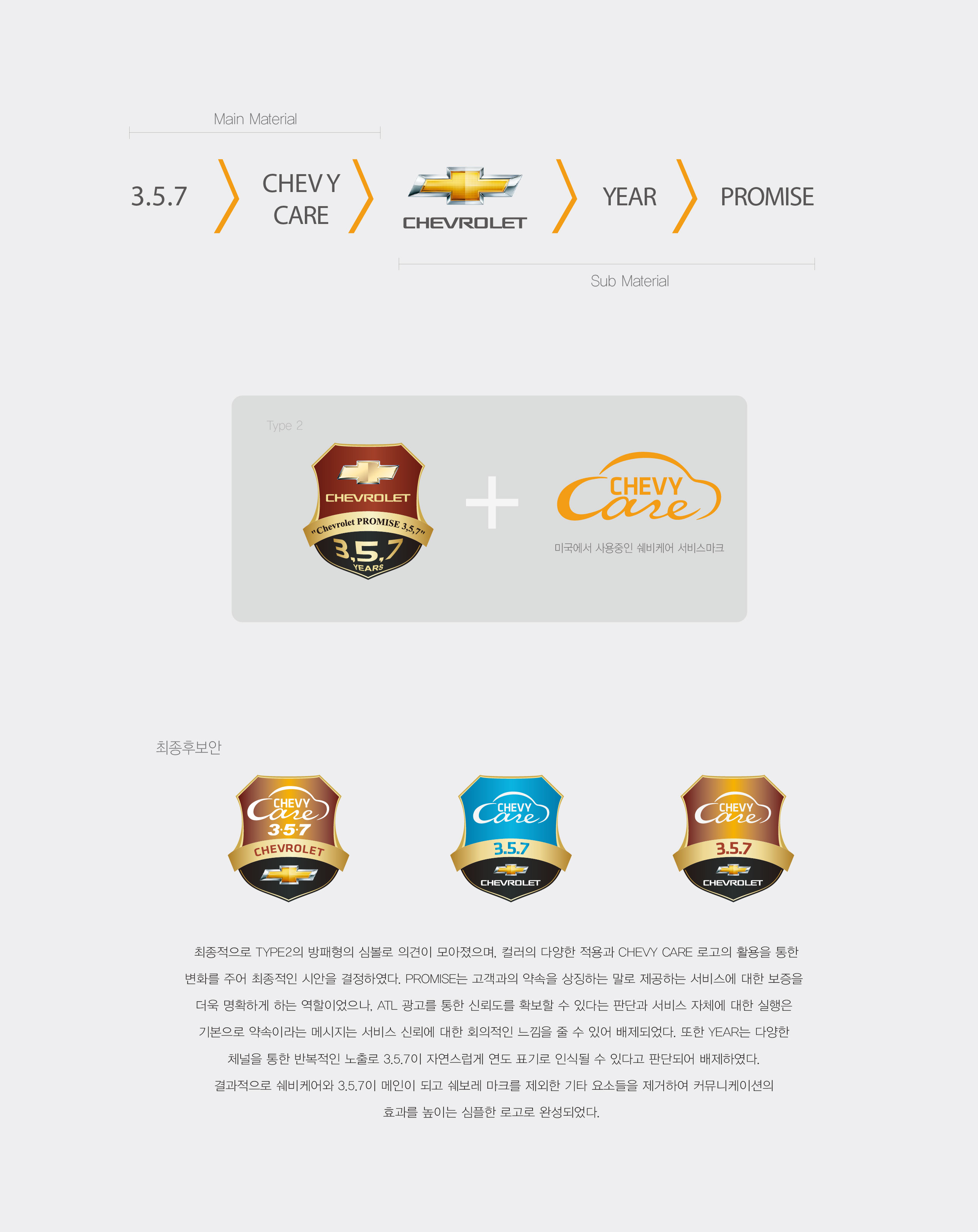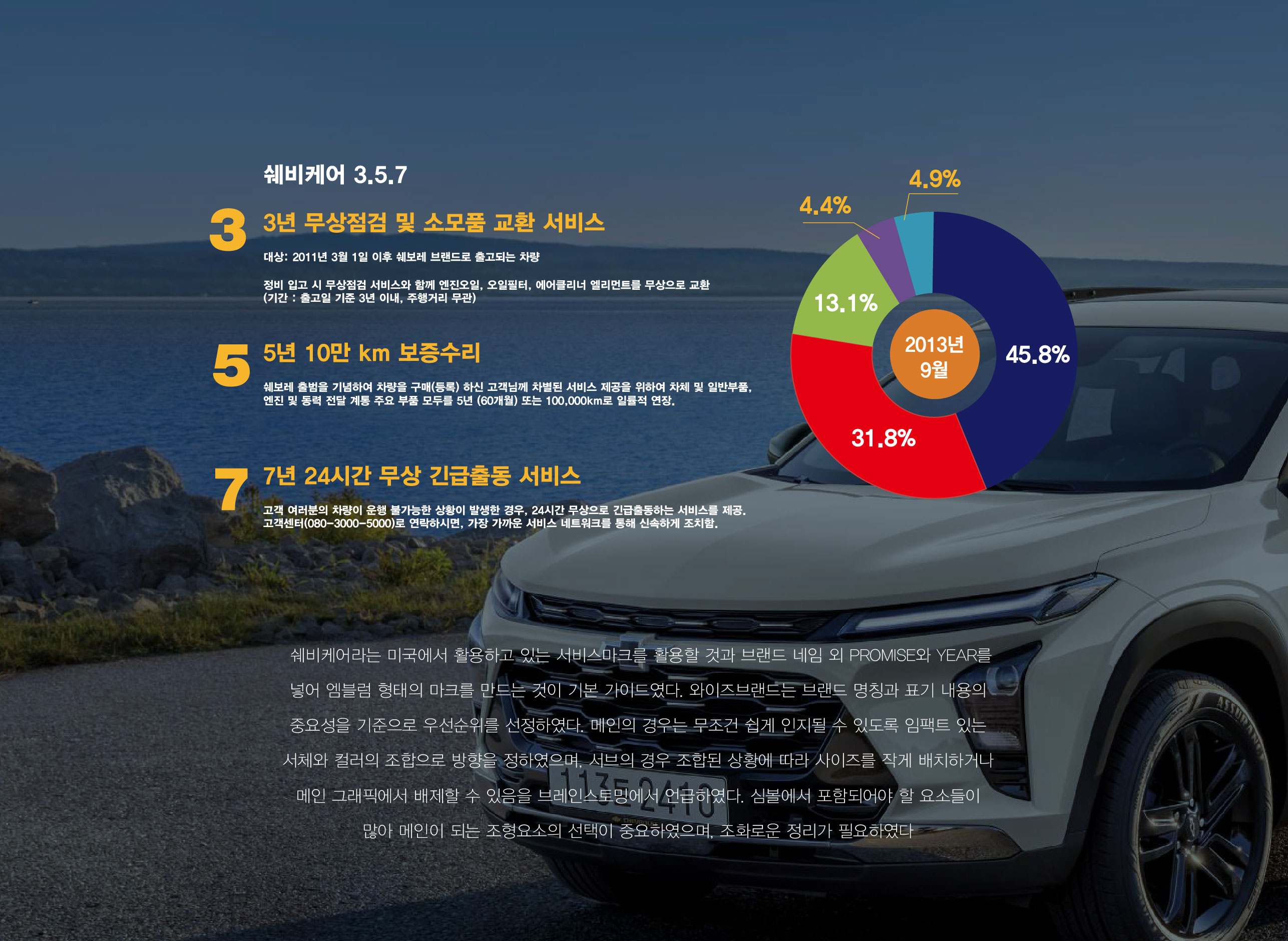 쉐비케어 357 BI 한국GM / 구매 후 서비스 프로모션 차량 구매자의 브랜드 선택 기준은 제품 성능뿐 아니라 구매 이후 제공되는 서비스 만족도까지 중요한 요소로 작용하고 있다. 특히 수입차 시장에서는 사후 서비스 문제로 인해 제조사와 소비자 간 신뢰도가 크게 영향을 받는 사례가 늘어나면서, 체계적인 사후 관리 서비스의 중요성이 더욱 강조되고 있다. 국내 시장에서도 서비스 품질에 대한 소비자의 기대 수준이 높아지면서 브랜드 경쟁력 확보를 위해 차별화된 애프터서비스 전략이 필요한 상황이었다. 쉐비케어는 구매 이후 일정 기간 동안 체계적인 점검과 보증 서비스를 제공하여 고객의 신뢰를 강화하고 브랜드 만족도를 높이기 위한 프로그램으로 기획되었다. 사후 관리 서비스의 가치를 명확히 전달하여 고객 경험을 강화하고 장기적인 브랜드 신뢰를 구축하는 것이 본 프로젝트의 핵심 방향이다. | ||||