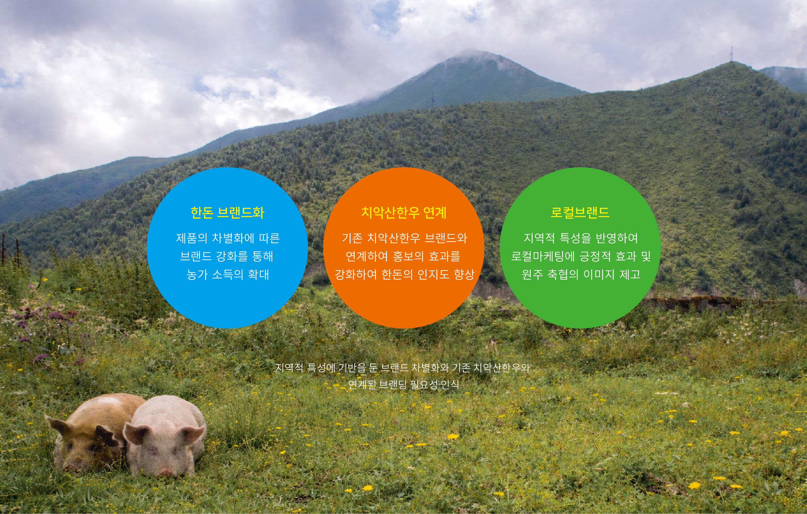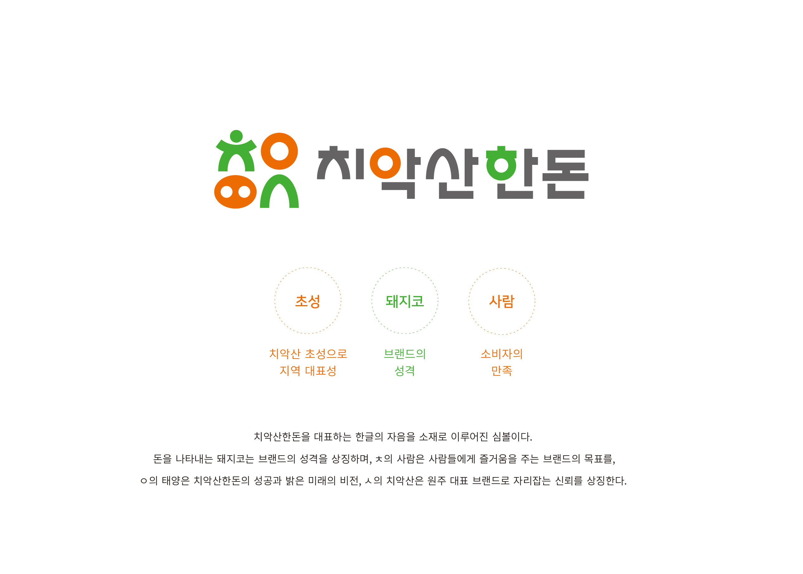 치악산한돈 BI 유황먹인 우리고장 우리돼지 기존 치악산한돈 브랜드의 시각적 아이덴티티는 상징성과 인지도 측면에서 차별성이 부족하여 소비자에게 대표 브랜드로 강하게 인식되지 못하는 한계가 있었다. 또한 일반 식육 브랜드와 구분되는 지역 특화 브랜드 이미지를 전달하지 못해, 치악산 지역을 대표하는 축산 브랜드로서의 경쟁력 확보가 필요한 상황이었다. 이에 따라 치악산한돈의 상징성과 지역성을 동시에 강화할 수 있는 시각적 리뉴얼을 통해 브랜드 인지도를 높이고, 치악산한우 브랜드와의 연계성을 강화하여 지역 통합 축산 브랜드 이미지를 구축하고자 하였다. 지역을 대표하는 프리미엄 축산 브랜드로 자리매김하여 소비자 신뢰와 브랜드 가치를 동시에 높이는 것이 본 프로젝트의 핵심 방향이었다. | ||||