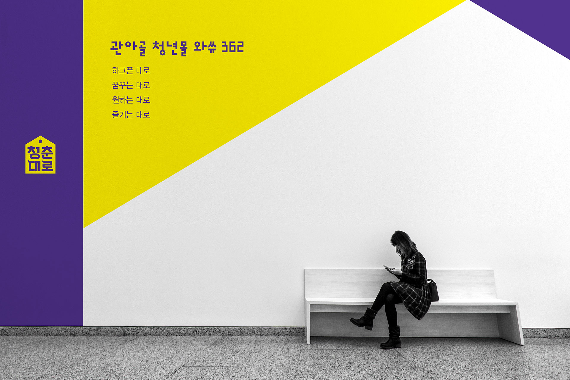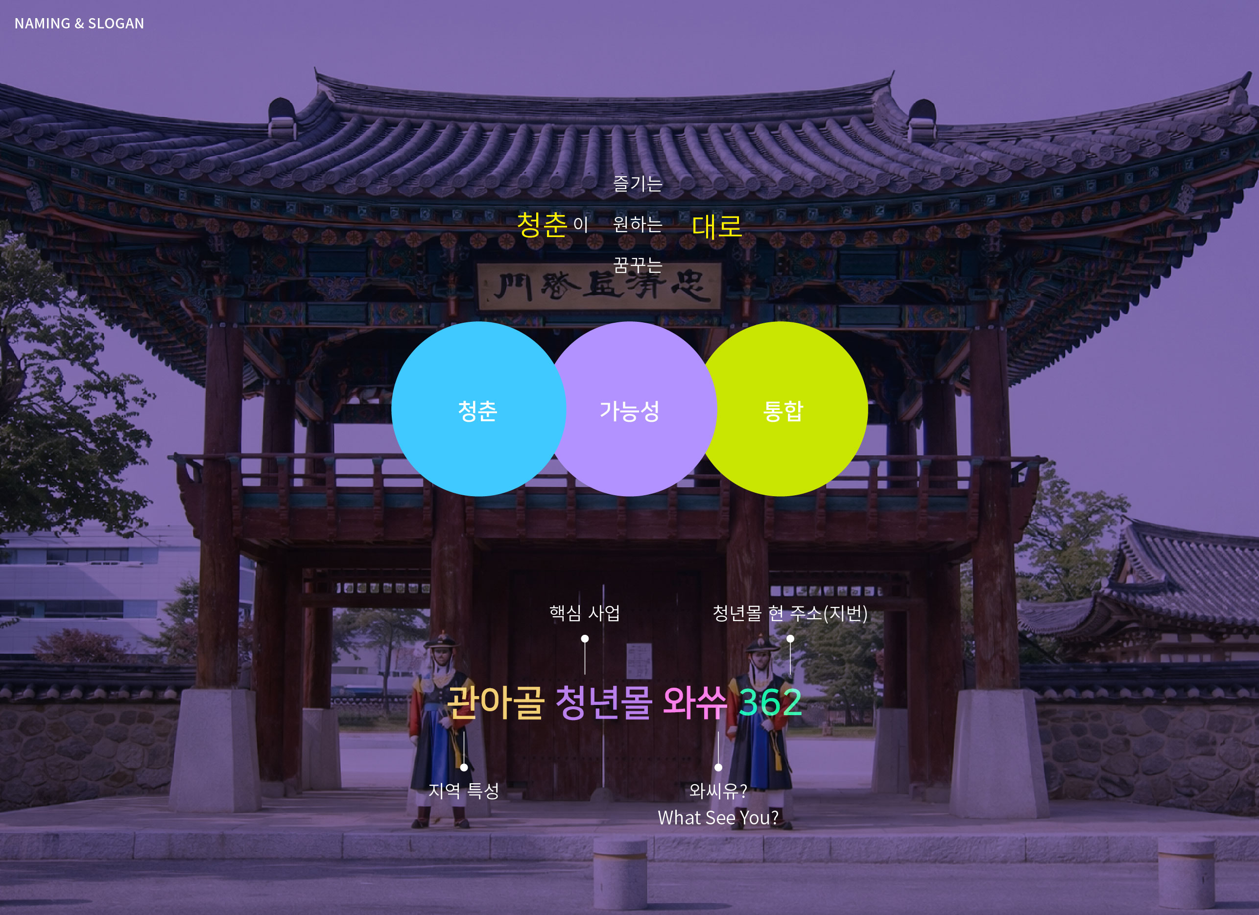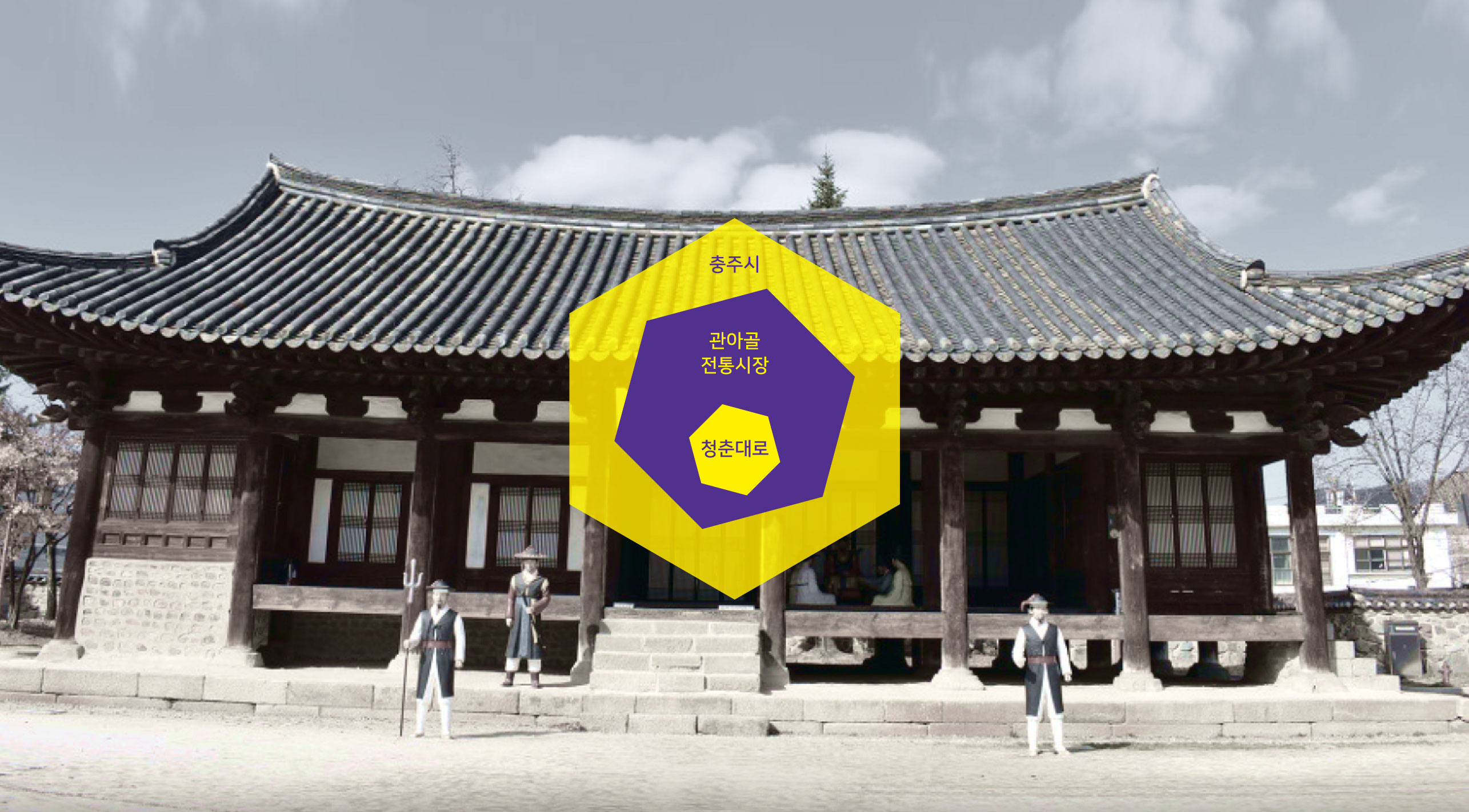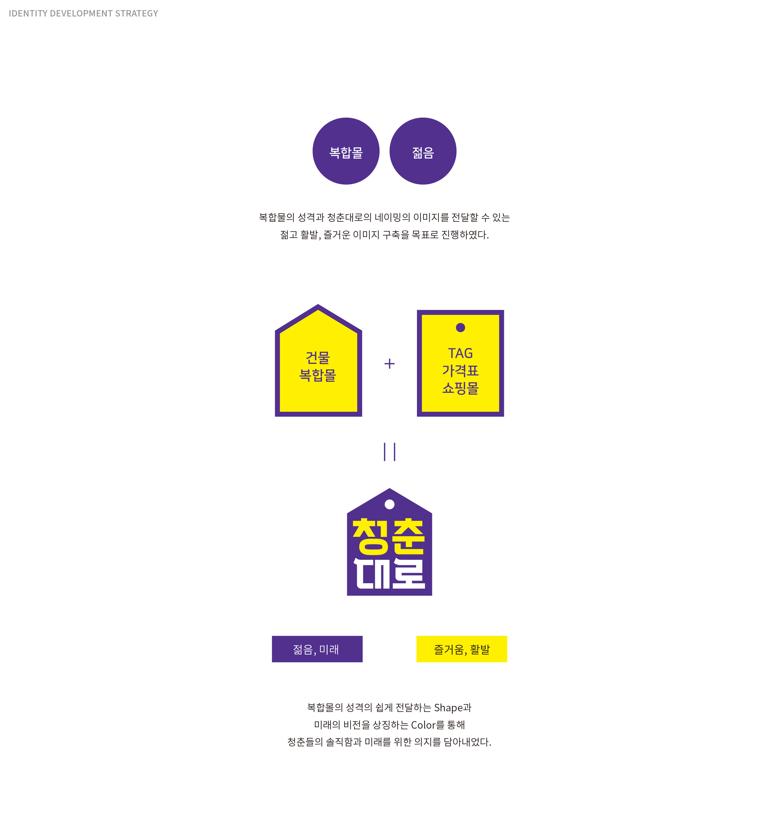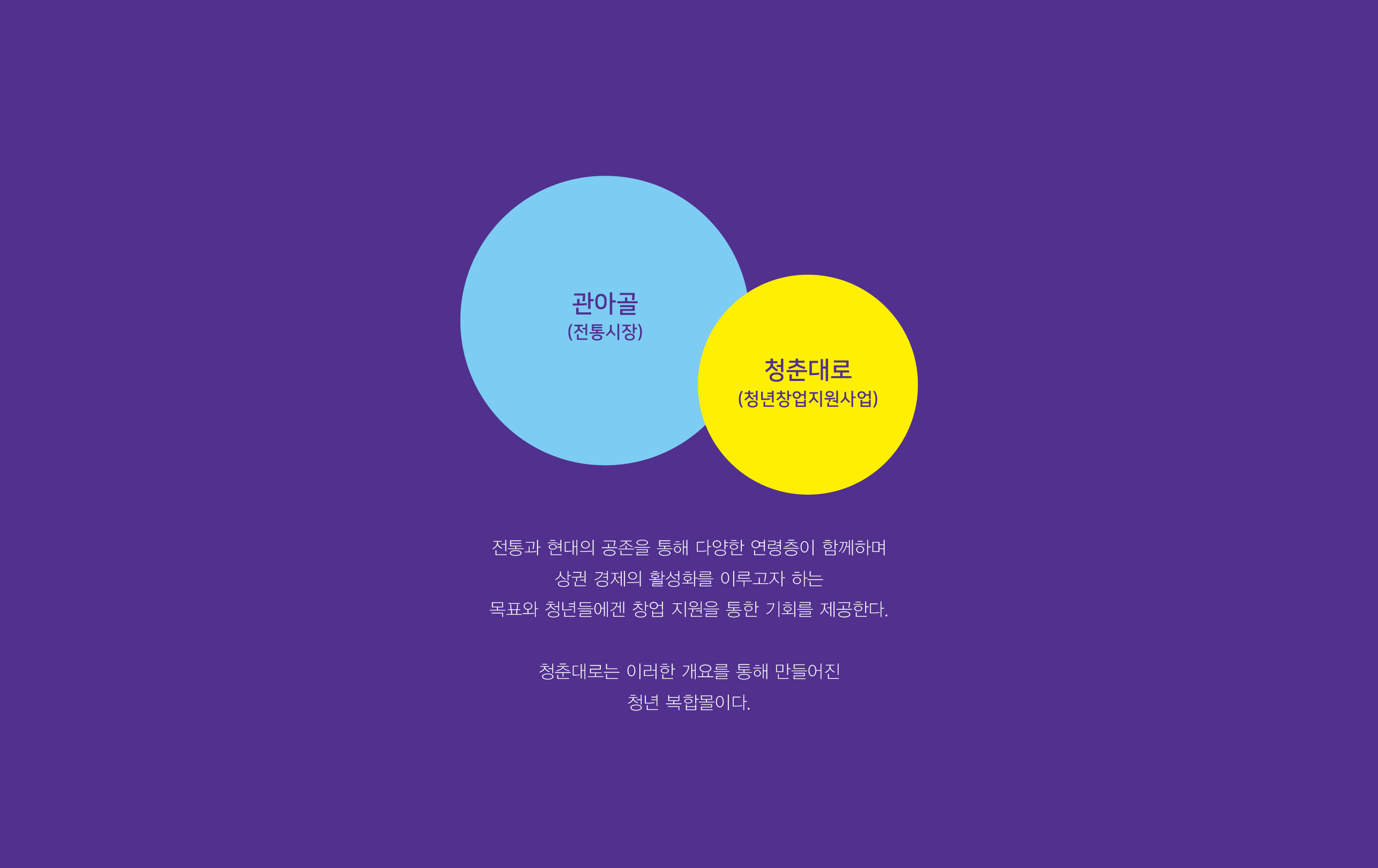 청춘대로 BI 전통과 청년이 만나는 새로운 상권 충주시의 관아골 전통시장과 청년창업 지원 사업이 결합된 본 프로젝트는 전통시장 활성화와 청년 창업 지원을 동시에 이루기 위한 청년 복합몰 사업이다. 기존 전통시장은 세대 간 유입이 줄어들며 활력이 약화되고 있었고, 청년 창업 역시 안정적인 상권과 지속 가능한 운영 기반이 필요한 상황이었다. 이에 전통시장이라는 지역 자산과 청년 창업 지원 정책을 결합하여 상권 활성화와 청년 일자리 창출을 동시에 이루는 상생 모델을 구축하고자 하였다. 청춘대로는 단순한 상업 공간이 아닌, 지역 경제에 새로운 활력을 불어넣는 청년 중심 복합 플랫폼으로 기획되었다. | ||||