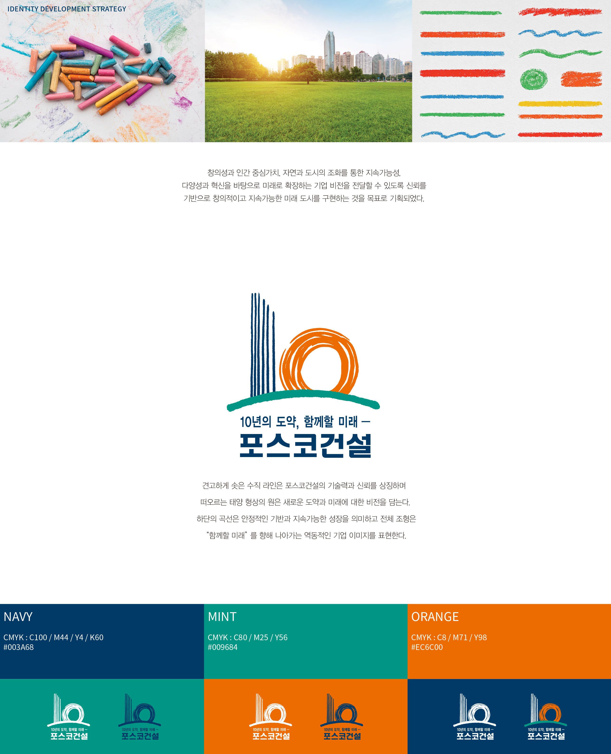 포스코건설 10주년 엠블럼 10년의 도약, 함께할 미래 포스코건설은 설립 10주년을 맞아 SMART Global E&C Company라는 새로운 비전을 선포하며, 기업의 정체성과 미래 전략을 재정립하고자 하였다. 기존의 관행과 인식, 생산 방식에서 탈피하여 전문성과 도덕성, 적극성을 기반으로 한 혁신 기업으로 도약하는 전환점이 필요하였다. 지속적인 혁신을 통해 최고의 성과를 창출하고, 고객이 먼저 찾는 기업으로 성장하는 것을 핵심 목표로 설정하였으며, 이는 단순한 슬로건을 넘어 기업 문화 전반을 변화시키는 방향성이었다. 2015년 수주 7조 원과 경제적 부가가치 4천억 원 달성, 세계 30위권 건설사로의 성장을 목표로 삼으며 글로벌 경쟁력을 강화하고자 하였다. 이를 위해 ‘최적의 사업구조 확립’과 ‘글로벌 수준의 핵심 역량 확보’를 전략 방향으로 설정하고, 기업 가치 극대화를 추진하였다. 이러한 변화와 성장의 의지를 상징적으로 담아내기 위해, 10년의 성과를 기념함과 동시에 새로운 도약을 선언하는 10주년 엠블럼 개발이 진행되었다. 10년의 도전과 성과를 기반으로, 앞으로의 미래를 함께 만들어가겠다는 의지를 시각적으로 구현하는 것이 이번 엠블럼 개발의 핵심 목적이었다. | ||||