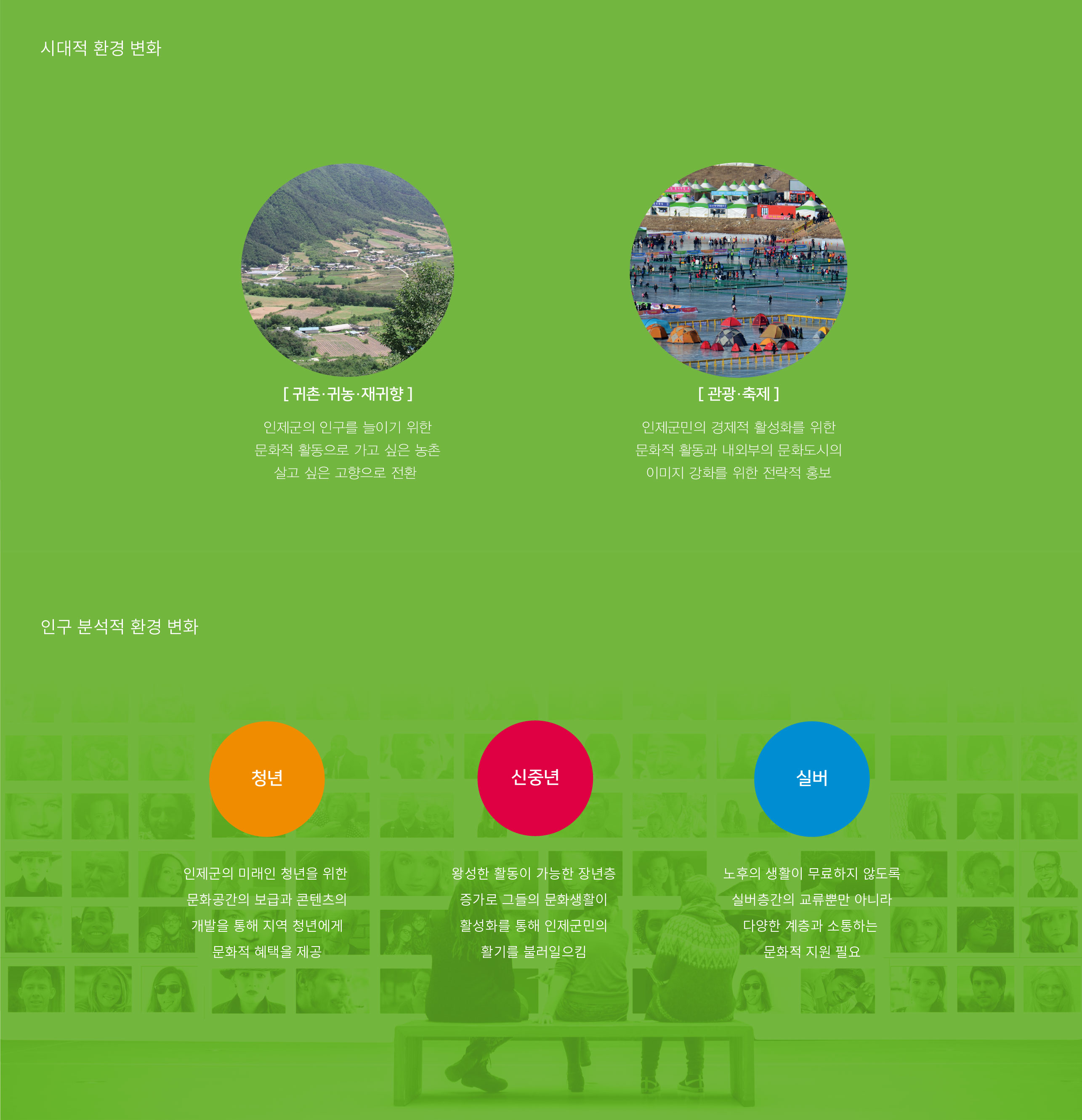 인제군문화재단 CI 리뉴얼 문화로 소통하고 교류로 확장하다 인제군문화재단은 인구 감소와 고령화라는 지역 사회의 구조적 변화 속에서 문화의 역할을 재정립해야 하는 시점에 놓여 있다. 교통과 정보통신의 발달로 공간의 경계가 허물어지는 시대적 흐름 속에서, 지역 문화기관 역시 보다 개방적이고 확장된 역할 수행이 요구되고 있다. 기존의 브랜드는 매뉴얼 중심의 형식적 아이덴티티에 머물러 있어, 변화하는 사업 방향과 재단의 비전을 충분히 담아내지 못한 한계가 있었다. 특히 문화시설 중심의 운영에서 벗어나 다양한 문화사업과 교류 프로그램으로 확대되는 흐름에 맞춰, 사업 중심의 새로운 비전과 통합된 시각 체계 구축이 절실히 필요하였다. 인제의 지역성을 강화하면서도 인근 도시 및 수도권과의 문화적 교류를 확장해 나가기 위해서는, 정체성과 확장성을 동시에 담을 수 있는 브랜드 전략이 요구된다. 군민을 위한 직접적이고 효과적인 문화 서비스 제공과 지역 문화의 가치 확산이라는 이중 목표를 명확히 전달할 수 있는 브랜드 재정립이 중요한 과제로 부각되었다. 이에 따라 인제군문화재단은 문화시설·문화사업·지역 중심의 축을 아우르는 새로운 시각 아이덴티티를 수립하고, 지역에 머무르지 않고 주변 도시 및 대도시와 활발히 교류하는 문화 플랫폼으로의 도약을 목표로 브랜드 개발을 추진하게 되었다. | ||||