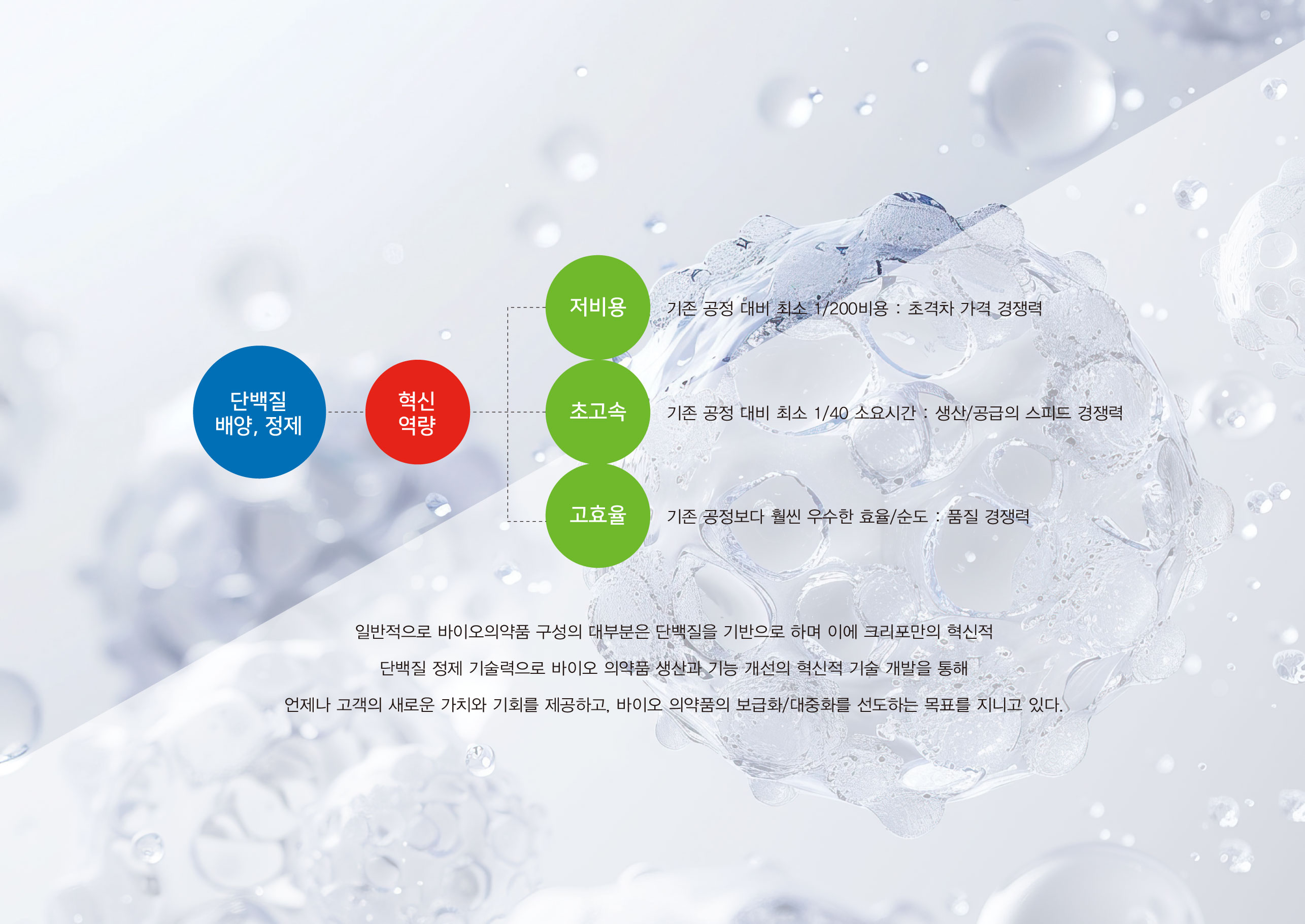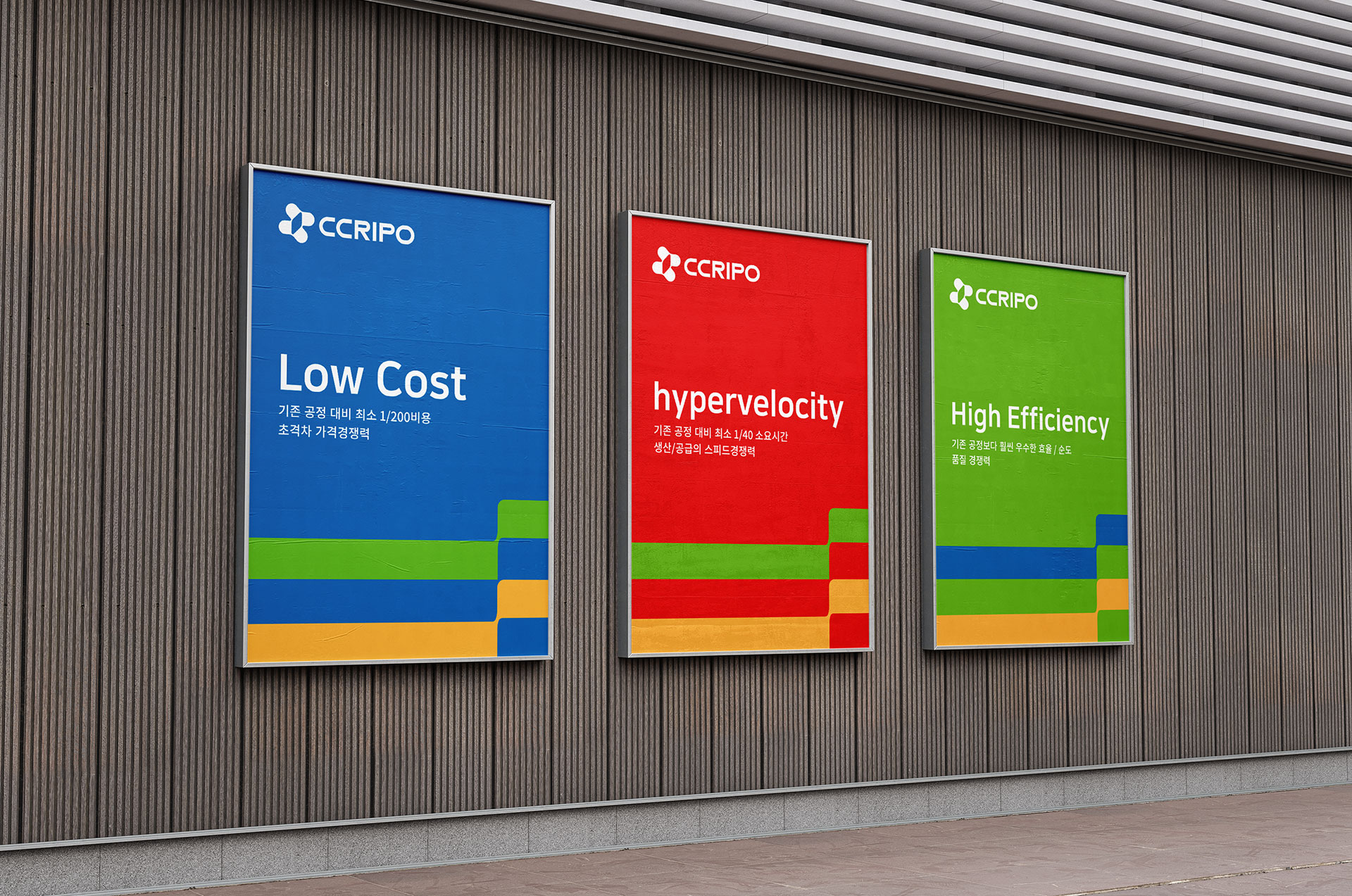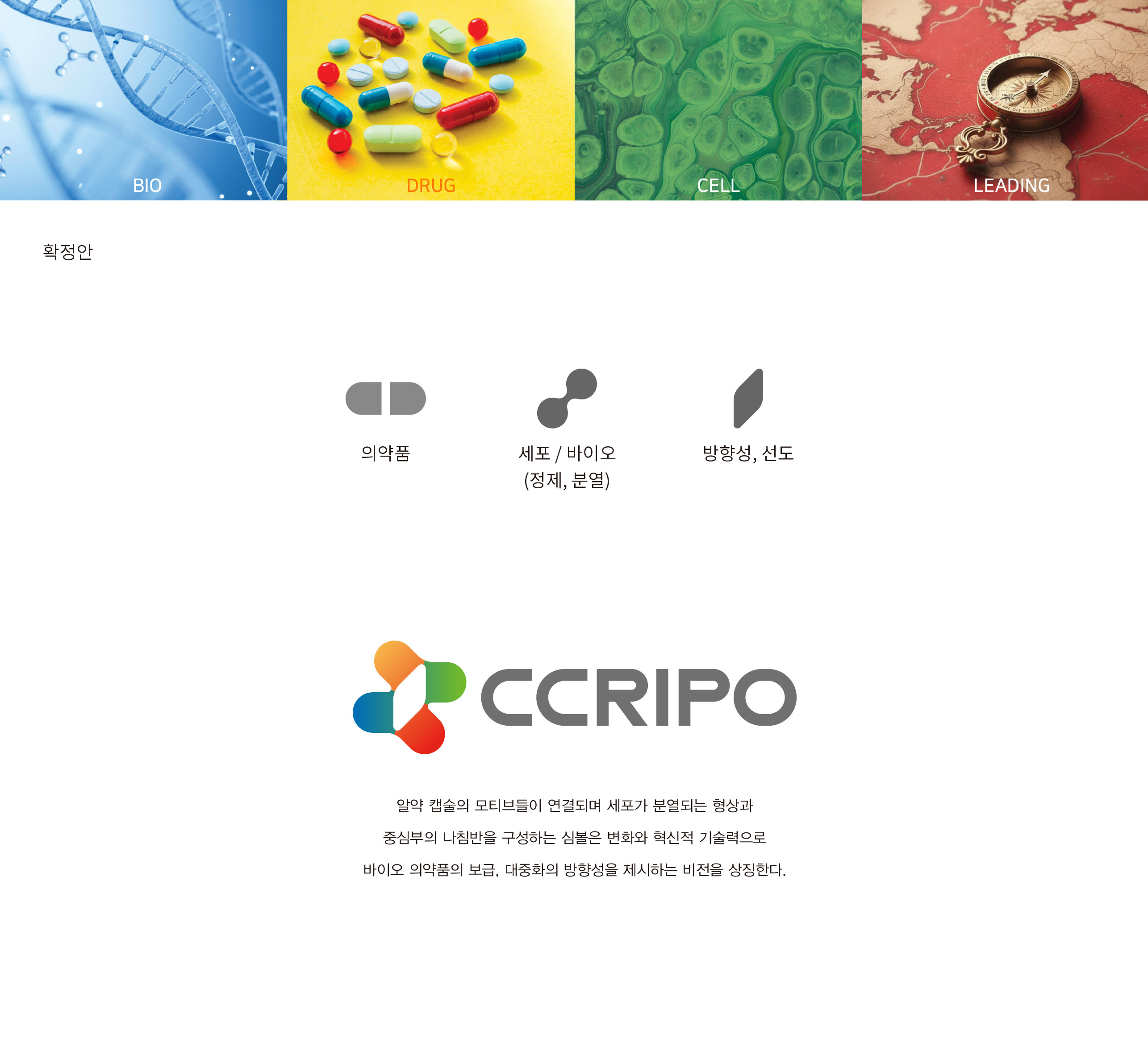 크리포 CI 단백질 배양, 정제의 패러다임을 선도하는 기업 크리포는 저비용·초고속·고효율의 차세대 단백질 정제 기술을 기반으로 바이오의약품 생산 공정의 혁신을 목표로 출발한 기술 중심 기업이다. 바이오의약품 시장이 빠르게 성장하는 가운데, 생산 비용 절감과 공정 단축, 품질 안정성 확보는 글로벌 경쟁력의 핵심 과제로 부각되고 있다. 이에 크리포는 기존 resin/column 기반 정제 방식의 한계를 극복하고자, 차별화된 기업형 유도방식의 resin/column-free 차세대 단백질 정제 플랫폼을 개발하였다. 이는 기존 공정 대비 획기적인 비용 절감과 속도 향상을 가능하게 하며, 생산성과 공급 안정성을 동시에 강화할 수 있는 기반 기술이다. 특히 기존 공정 대비 최소 1/200 비용, 1/40 소요 시간이라는 혁신적 수치를 통해 초격차 가격·스피드 경쟁력을 확보하였으며, 공정 효율과 품질 경쟁력 측면에서도 우수한 성능을 구현하고자 한다. 이러한 기술적 강점을 바탕으로 바이오의약품 생산의 패러다임을 전환하고, 고객사에게 실질적인 부가가치를 제공하는 것을 브랜드의 핵심 방향으로 설정하였다. 크리포는 단순한 기술 보유 기업을 넘어, 바이오의약품의 보급과 대중화를 선도하는 플랫폼 기업으로 성장하고자 하는 비전을 담아 브랜드 개발을 진행하였다. 기술 혁신성과 미래 지향적 이미지를 동시에 전달할 수 있는 아이덴티티 구축이 중요한 과제로 설정되었다. | ||||