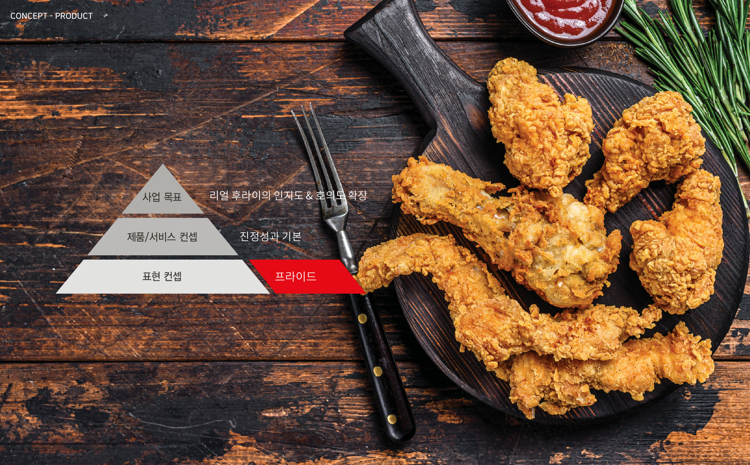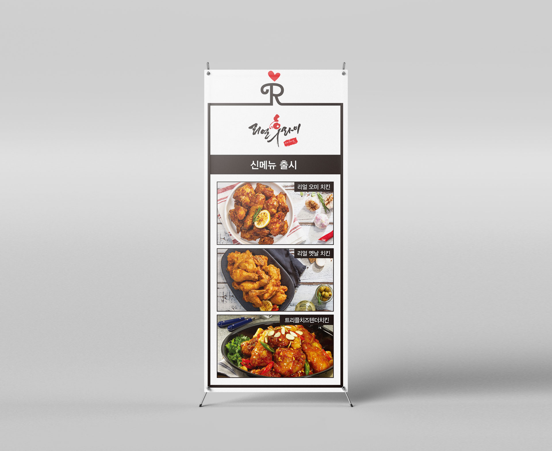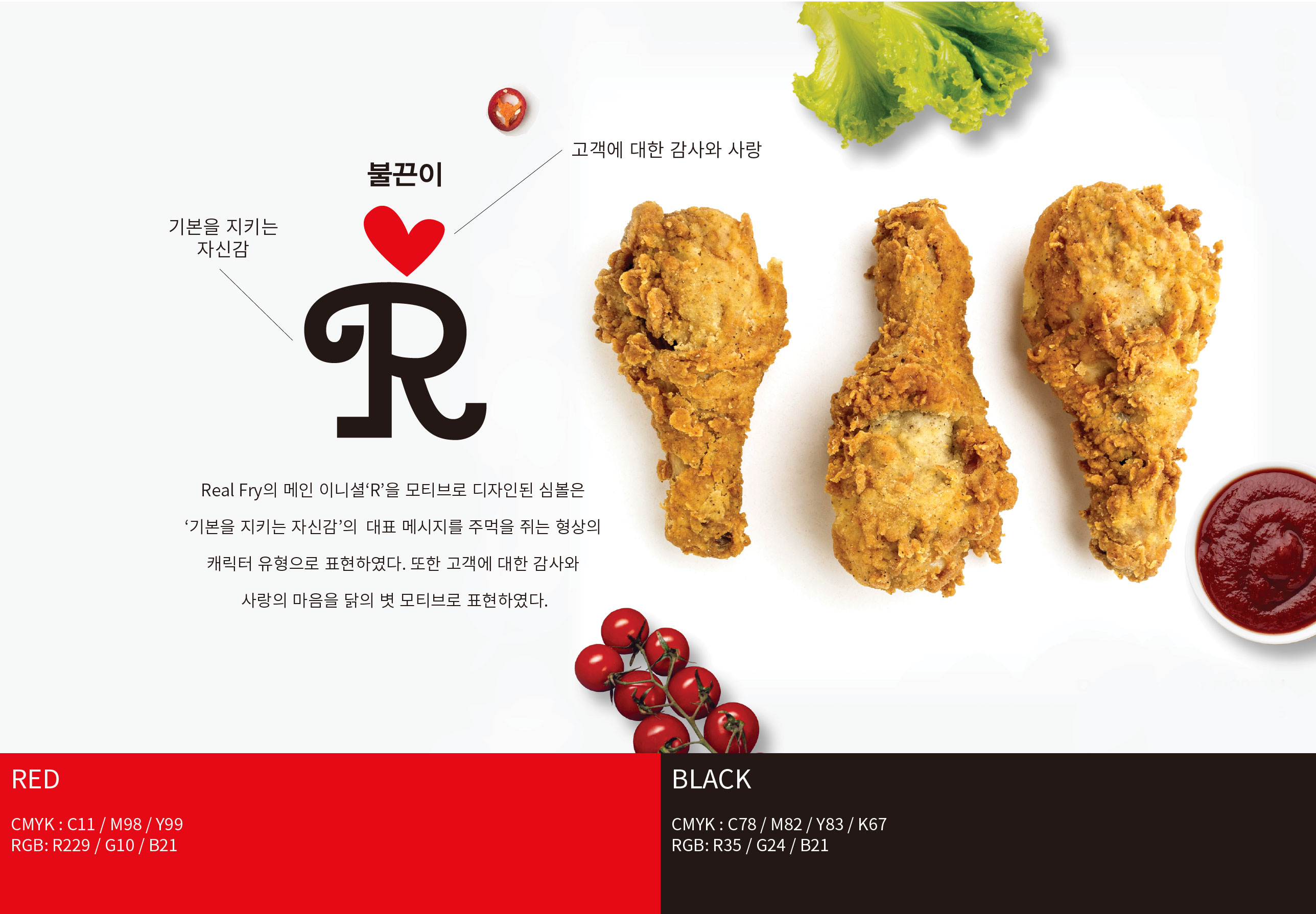 리얼후라이 BI 기본을 지키는 치킨의 자신감 리얼후라이는 서울 흑석동을 중심으로 사업을 확장해 온 치킨 프랜차이즈 브랜드이다. 기존 워드마크는 강렬한 컬러 조합과 자유로운 캘리그래피 터치로 시각적 임팩트를 형성했지만, 개성 중심의 표현 방식이 브랜드 자산으로 체계화되지는 못했다. 젊은 감성을 강조한 기존 캘리그래피는 초기 인지도 형성에는 효과적이었으나, 브랜드 확장과 프랜차이즈 운영 측면에서는 일관된 아이덴티티 구축에 한계가 있었다. 또한 단순한 워드마크 반복 사용으로는 매장, 패키지, 홍보물 등 다양한 접점에서 통합된 브랜드 이미지를 전달하기 어려운 상황이었다. 브랜드 확장과 가맹 사업의 안정적 성장을 위해서는 감각적 이미지를 넘어 체계적인 시각 아이덴티티 시스템 구축이 필요한 시점이었다. 이에 따라 로고 타입을 보완하는 그래픽 모티프 개발과 활용 매뉴얼 정립을 통해 브랜드 자산을 명확히 정리하고자 하였다. 이번 프로젝트는 단순한 리뉴얼을 넘어, ‘기본을 지키는 자신감’이라는 브랜드 철학을 시각적으로 재정립하고, 건강하고 정직한 치킨 브랜드로서의 이미지를 강화하는 방향으로 진행되었다. 나아가 젊은 감성과 전문성, 진정성을 동시에 담아낼 수 있는 브랜드 플랫폼을 구축함으로써 장기적인 브랜드 경쟁력을 확보하고자 하였다. | ||||
