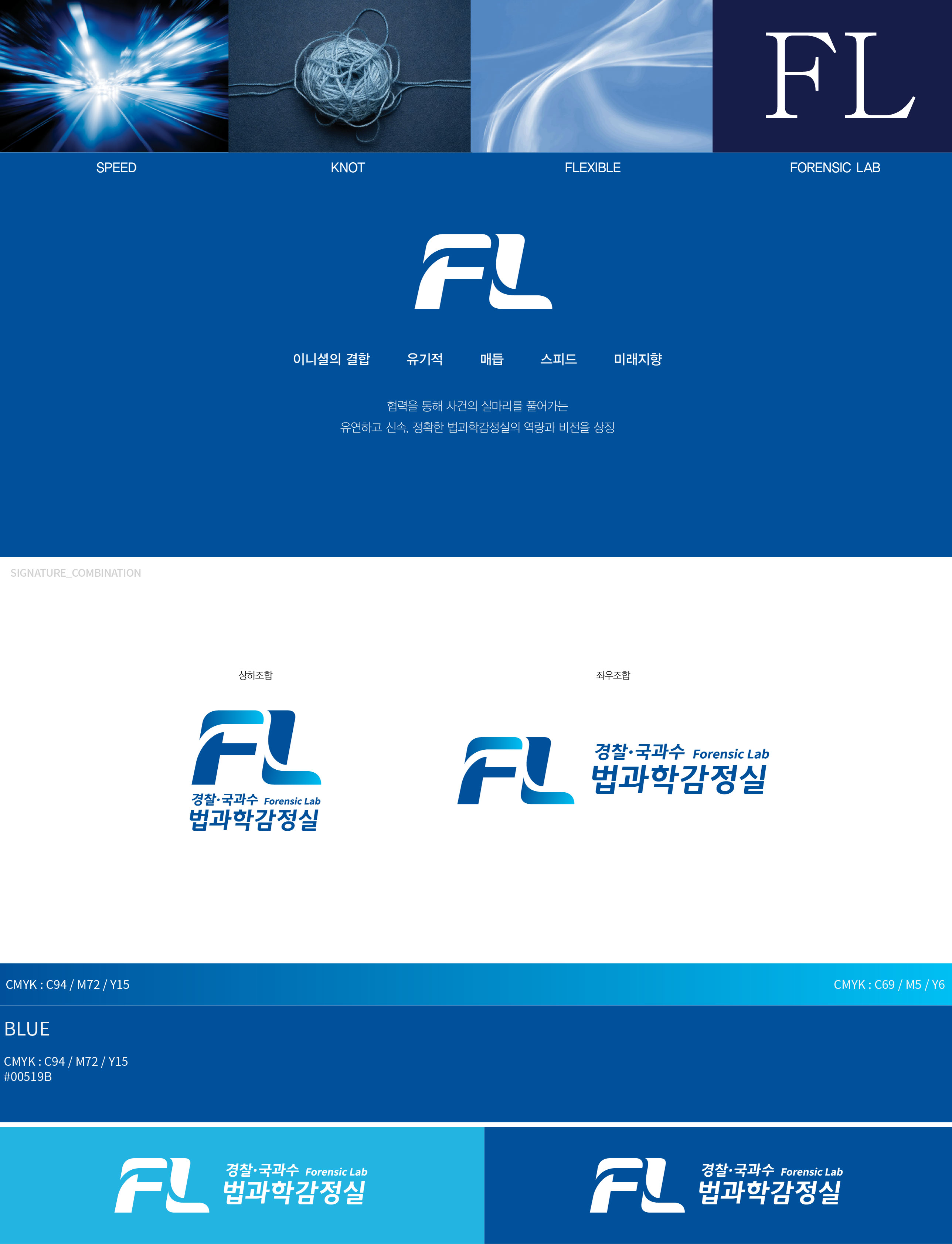 FL법과학감정실 BI 신속과 정확을 완성하는 통합 과학수사 기존 경찰의 수집·채취 증거물은 인편 또는 택배를 통해 경찰청, 유전자(DNA) 협조 기관 등으로 전달되는 방식으로 운영되어 왔다. 이 과정에서 동일 증거물에 대한 다양한 감정 기법 적용과 신속한 결과 도출에 한계가 발생하기도 했다. 특히 사건 대응의 골든타임 확보가 중요해지는 환경 속에서 보다 효율적이고 통합적인 감정 체계의 필요성이 지속적으로 제기되어 왔다. 이번 법과학감정실 개선 사업은 이러한 구조적 한계를 보완하고, 경찰청과 국과수 간 협업 기반의 신속·정확 감정 체계 구축을 핵심 목표로 추진되었다. 증거물 이동 과정에서 발생하는 시간 지연과 행정 비효율을 최소화하고, 현장 대응 중심의 과학수사 역량을 강화하는 것이 중요한 과제로 부각되었다. 이에 따라 본 프로젝트는 단순한 시설 개선을 넘어, 통합 감정 프로세스를 직관적으로 전달할 수 있는 브랜드 및 시각 아이덴티티 구축에 중점을 두었다. 복잡한 법과학 절차를 명확한 정보 구조와 시각 언어로 체계화함으로써, 내부 구성원의 업무 이해도와 대외 신뢰도를 동시에 높이고자 하였다. 또한 공공 치안 서비스의 특성을 고려하여 신뢰·정확·신속의 브랜드 핵심 가치가 일관되게 전달되는 디자인 시스템을 구축하고, 향후 확장 가능한 모듈형 아이덴티티 방향을 설정하였다. 이를 통해 법과학감정실이 첨단 과학수사의 컨트롤타워로서 갖는 위상을 시각적으로 강화하고, 국민에게는 더욱 믿을 수 있는 치안 이미지를 전달하는 것을 목표로 하였다. | ||||