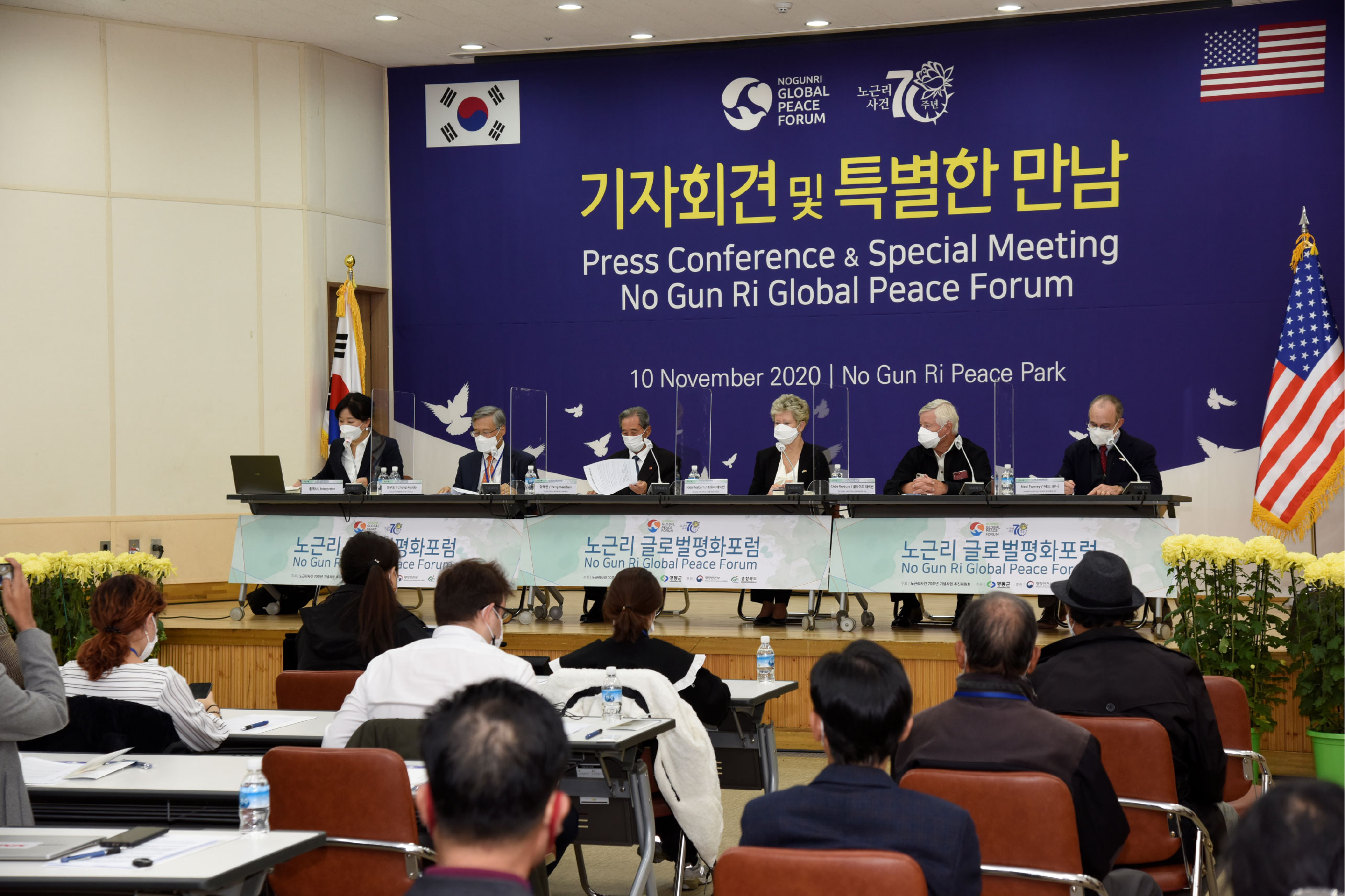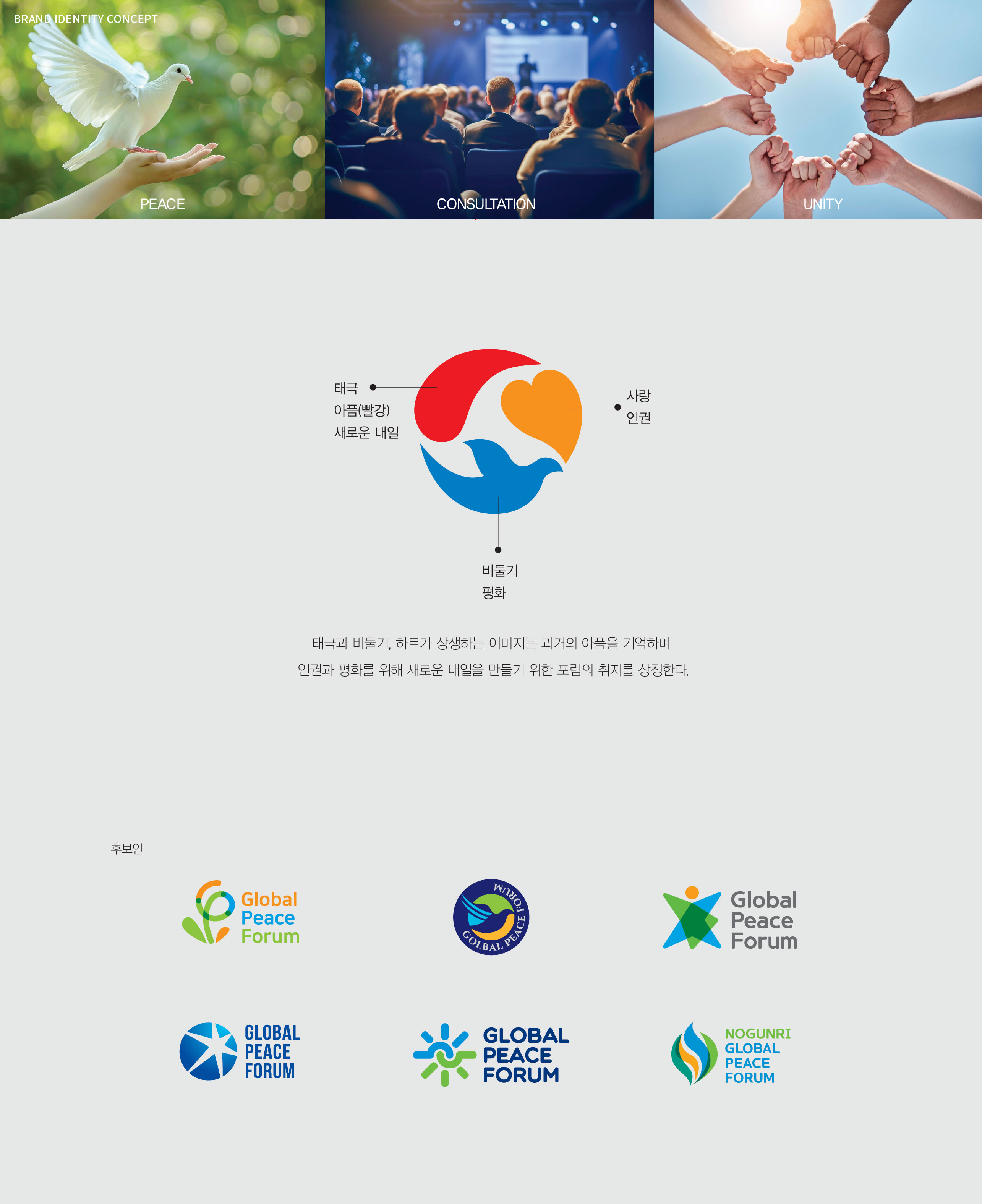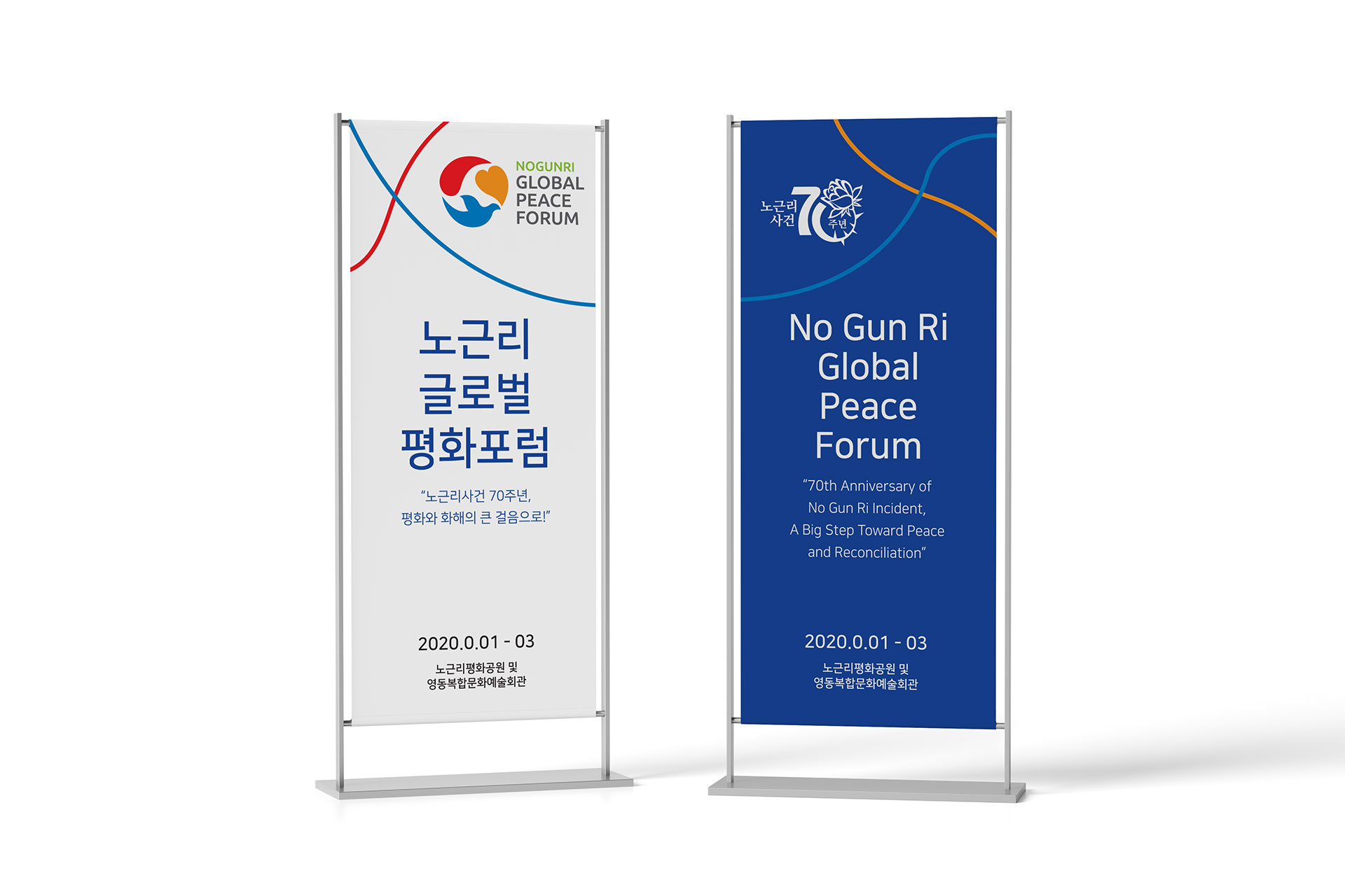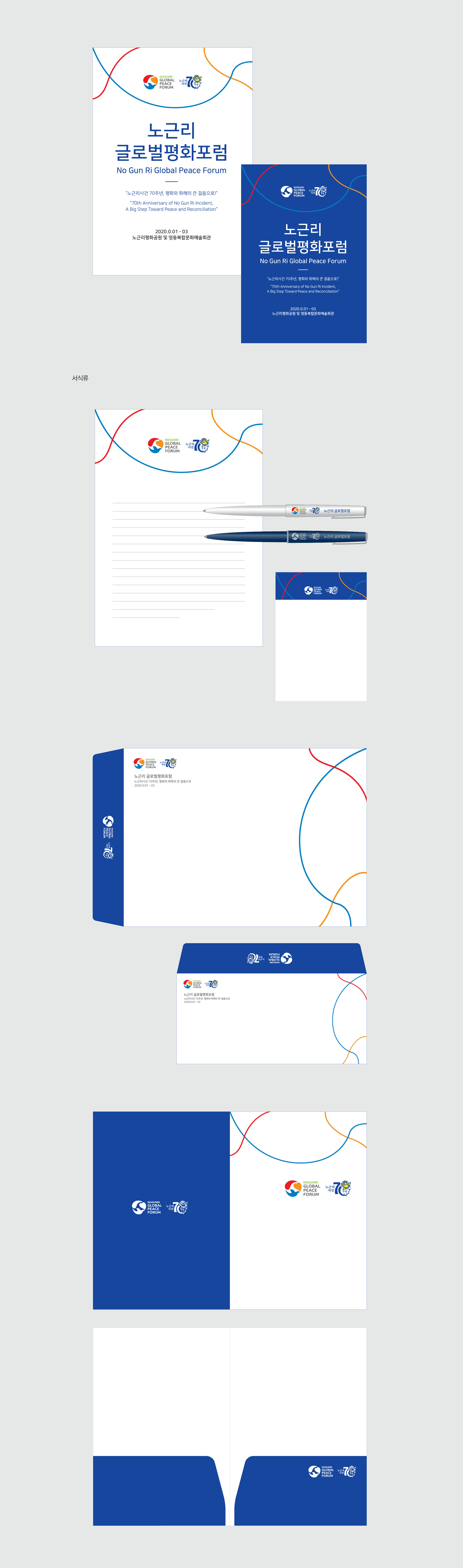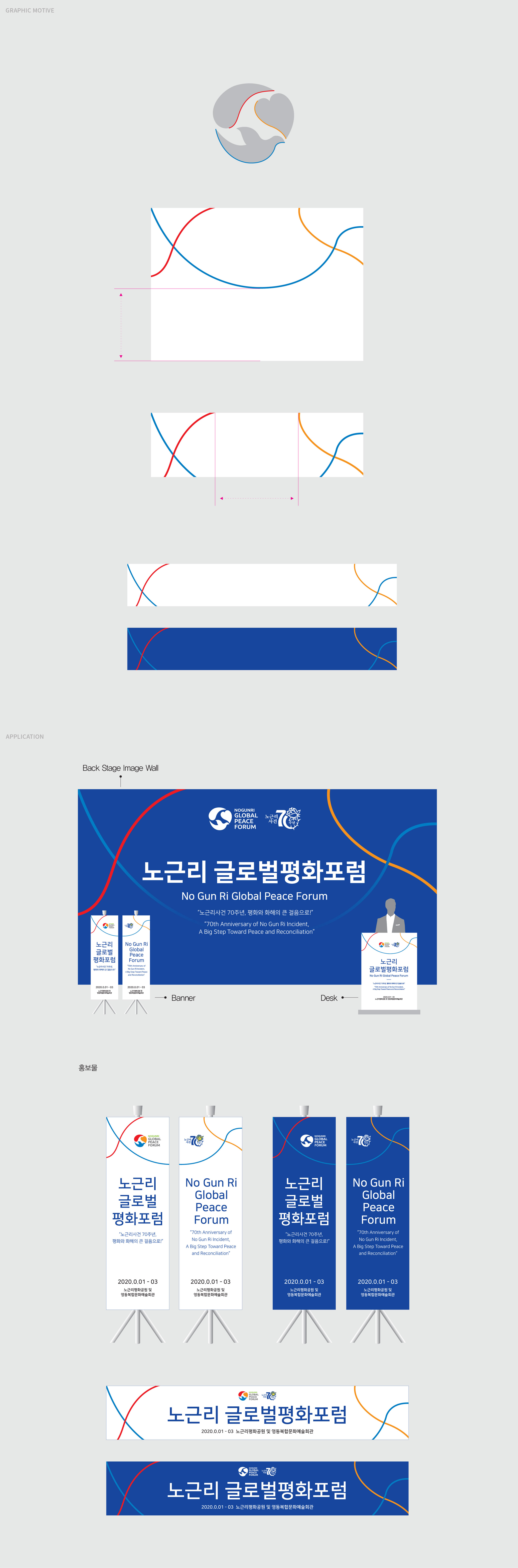 노근리글로벌평화포럼 BI 아픔의 역사를 넘어 인권의 가치로 노근리글로벌평화포럼은 노근리 사건 70주년을 계기로, 아픔의 역사를 국제적 평화 담론으로 확장하기 위해 기획된 작업이었다. 역사적 기억을 현재적 가치로 재해석하고, 이를 하나의 일관된 브랜드 디자인 시스템으로 정립하는 데 목적이 있었다. 브랜드 디자인은 과거–현재–미래라는 시간의 흐름을 중심 개념으로 설정하였다. ‘아픔의 역사’에서 출발해 ‘기억과 변화의 노력’을 거쳐 ‘인권과 평화의 정착’으로 이어지는 서사를 구조적으로 정리함으로써, 사건의 의미가 미래 가치로 확장되는 과정을 시각적으로 담아내고자 하였다. 기억을 단순한 기록이 아닌 지속적인 실천의 출발점으로 제시하는 것이 핵심 방향이었다. 전체 디자인은 감성적 접근과 공공적 메시지의 균형을 유지하며, 국제 포럼의 성격에 부합하는 신뢰감과 보편성을 확보하는 데 중점을 두었다. 또한 단발성 행사가 아닌 지속 가능한 담론 플랫폼으로 확장될 수 있도록 구조적 일관성과 적용 가능성을 고려하여 설계된 프로젝트였다. | ||||