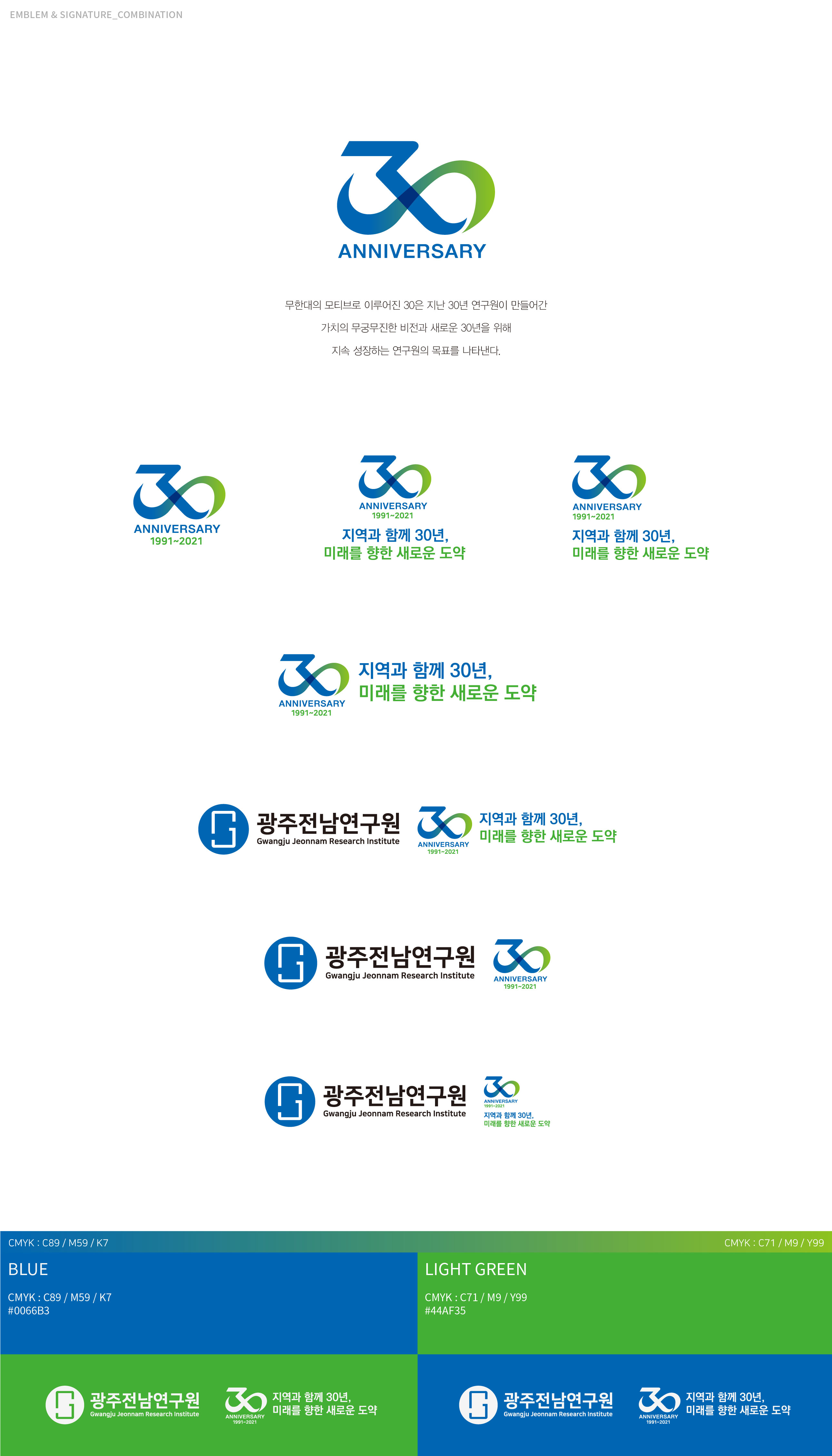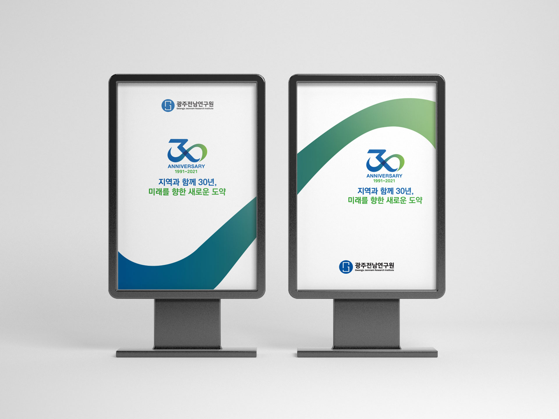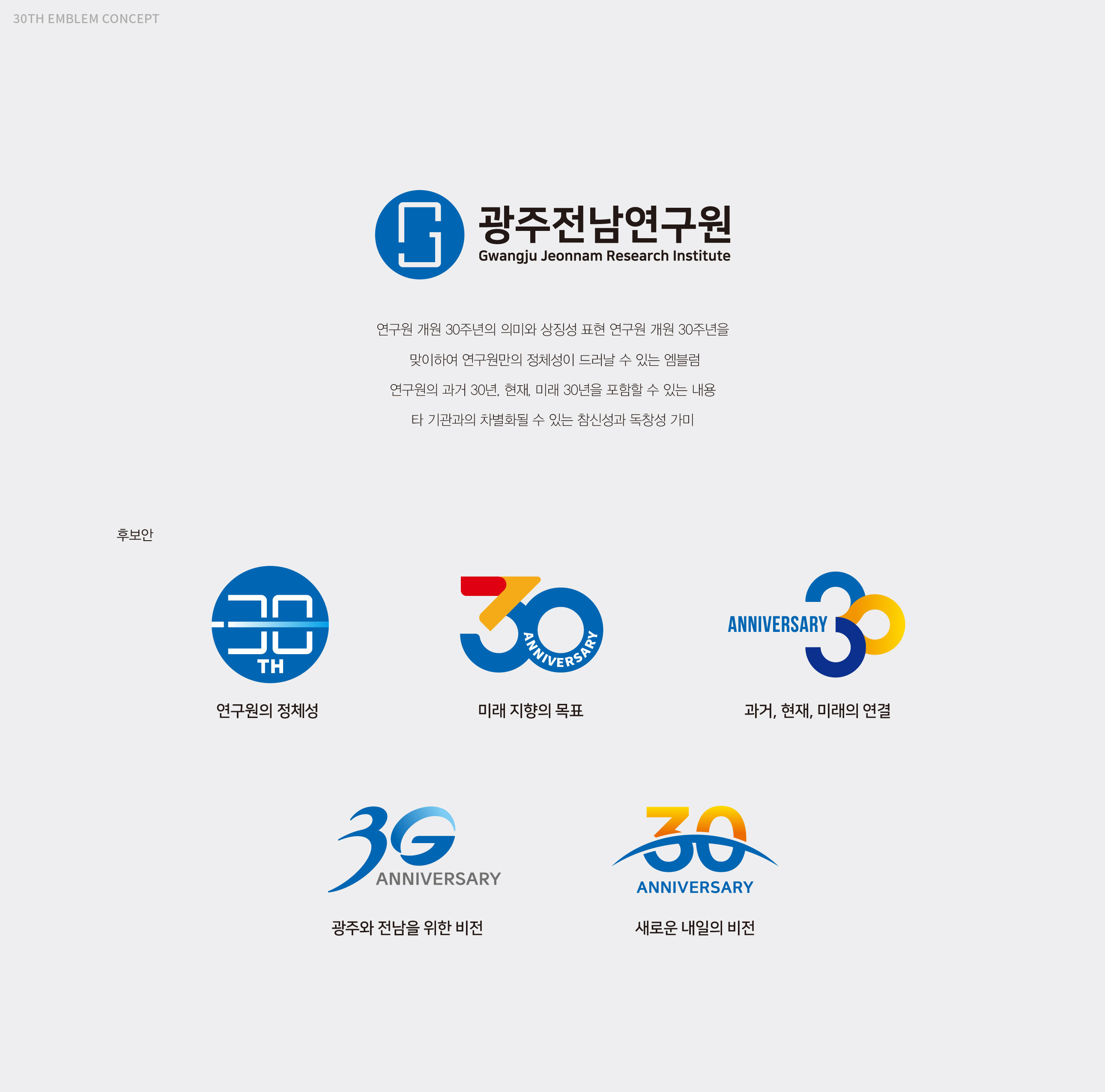 광주전남연구원 30주년 엠블럼 30년의 연구, 지역의 미래를 설계하다 광주전남연구원 30주년 엠블럼 개발은 단순한 기념 표식 제작이 아닌, 기관의 정체성과 30년의 축적된 성과를 상징적으로 재정립하는 작업이었다. 광주광역시와 전라남도의 공동 발전 전략을 연구해 온 기관으로서, 이번 30주년은 지난 성과를 돌아보고 미래 비전을 재확인하는 전환점의 의미를 지니고 있었다. 광주전남연구원은 지역 경쟁력 향상, 시도민 삶의 질 제고, 도시의 상생발전 기여라는 설립 목적 아래 정책 연구를 수행해 온 공공 연구기관이다. 이에 따라 엠블럼 개발은 단순한 연차 표기가 아닌, 광주광역시와 전라남도의 협력 구조와 공동 비전을 상징적으로 담아내는 브랜드 전략 수립 과정이었다. 특히 두 지역의 연결성과 통합적 연구 기능을 강조하며, 상호 협력과 균형 발전이라는 핵심 가치를 시각적 구조 안에 반영하였다. 이는 지역 단위 연구기관을 넘어, 광역권 정책 싱크탱크로서의 위상을 명확히 드러내기 위한 방향 설정이었다. 본 브랜드 개발은 30년의 축적된 정책 연구 경험을 기반으로, 앞으로의 미래 전략을 제시하는 기관의 역할을 재정의하는 데 초점을 두었다. 과거의 성과를 기념하는 동시에, 미래 30년을 향한 비전과 책임을 담아내는 상징 체계를 구축하는 것이 핵심이었다. | ||||