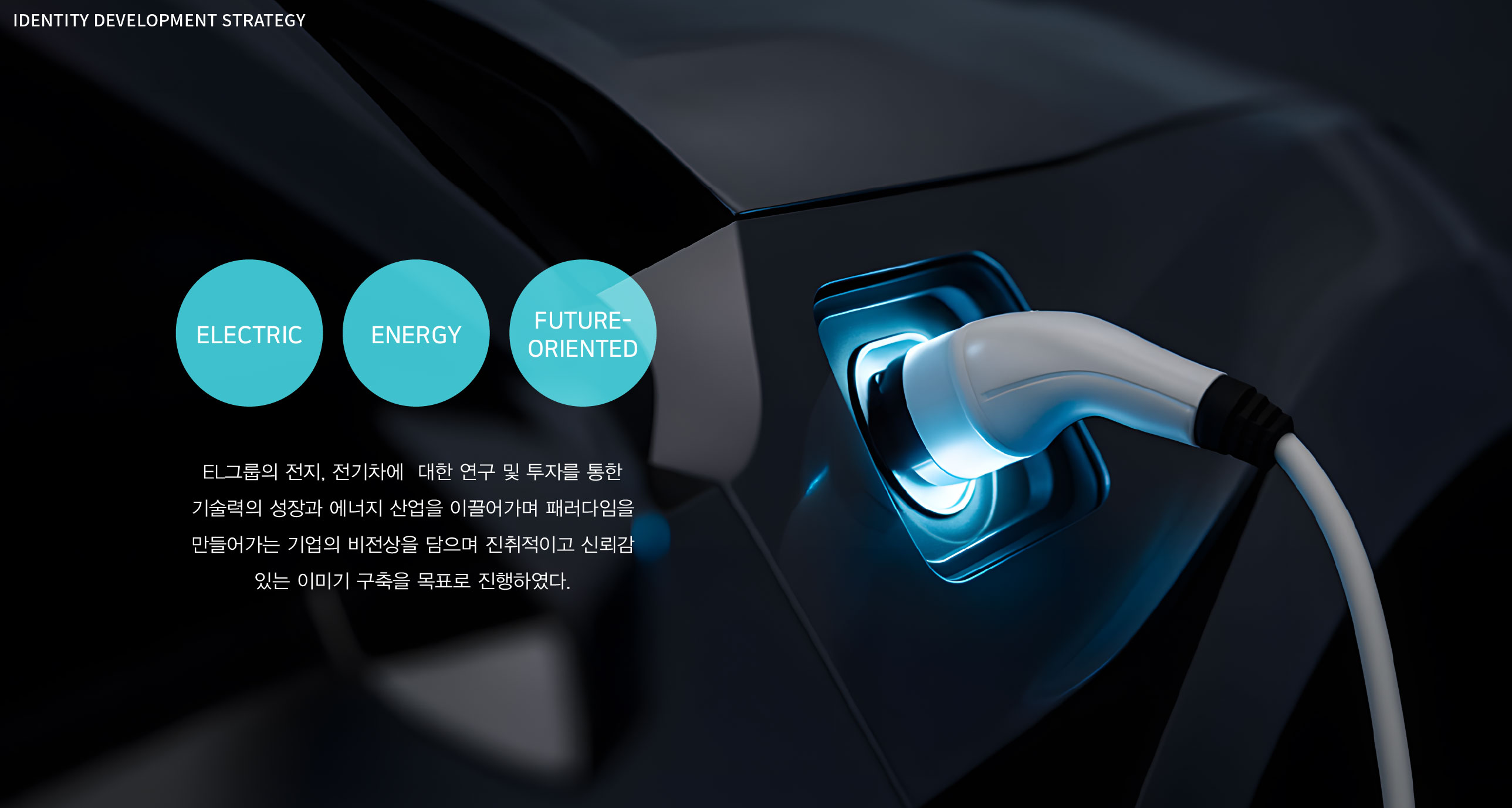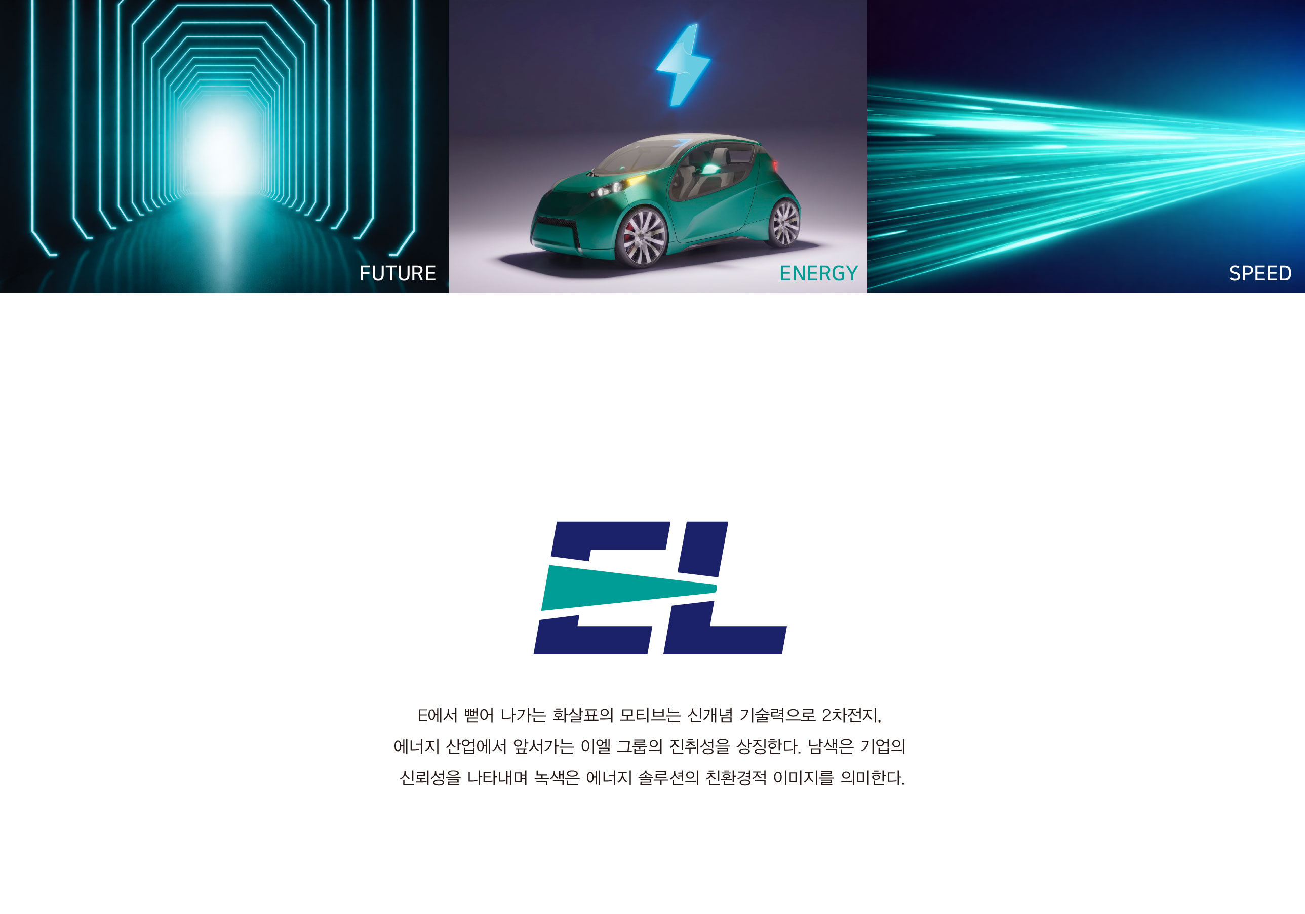 EL그룹 CI 지속 가능한 친환경에너지 패러다임 EL 그룹 브랜드 개발은 2차전지와 전기차 산업을 기반으로 에너지 패러다임을 선도하는 기업으로서의 정체성을 재정립하기 위한 전략적 작업이었다. 본 프로젝트는 기술 중심 제조 기업을 넘어, 미래 에너지 산업을 이끄는 그룹 브랜드로서의 위상을 명확히 구축하는 데 목적이 있었다. EL 그룹은 EL EVATA의 2차전지·배터리 사업을 기반으로 전기차 분야까지 사업을 확장하며, 연구개발과 투자에 지속적으로 집중해 왔다. 이에 따라 브랜드는 단일 사업 영역을 설명하는 수준을 넘어, 그룹 차원의 통합적 비전과 기술 경쟁력을 전달할 필요가 있었다. 브랜드 개발의 핵심 방향은 ‘전기’, ‘에너지’, ‘미래지향’이라는 가치에 기반하였다. 2차전지에서 전기차로 이어지는 기술 확장 구조를 하나의 성장 서사로 정리하고, 이를 통해 에너지 산업의 새로운 기준을 제시하는 기업 이미지를 구축하는 것이 핵심 과제였다. 또한 그룹 체계 안에서 각 사업 영역이 유기적으로 연결되어 있음을 드러내며, 연구개발 중심 기업으로서의 전문성과 지속적인 혁신 역량을 강조하였다. 이는 단순 생산 기업이 아닌, 기술 기반 에너지 플랫폼 기업으로 도약하려는 전략적 방향성을 반영하고자 하였다. 결과적으로 EL 그룹 브랜드 개발은 친환경 에너지 시대를 선도하는 기술 기업의 비전과 확장성을 집약한 브랜드아이덴티티 구축을 목표로 하였다. | ||||