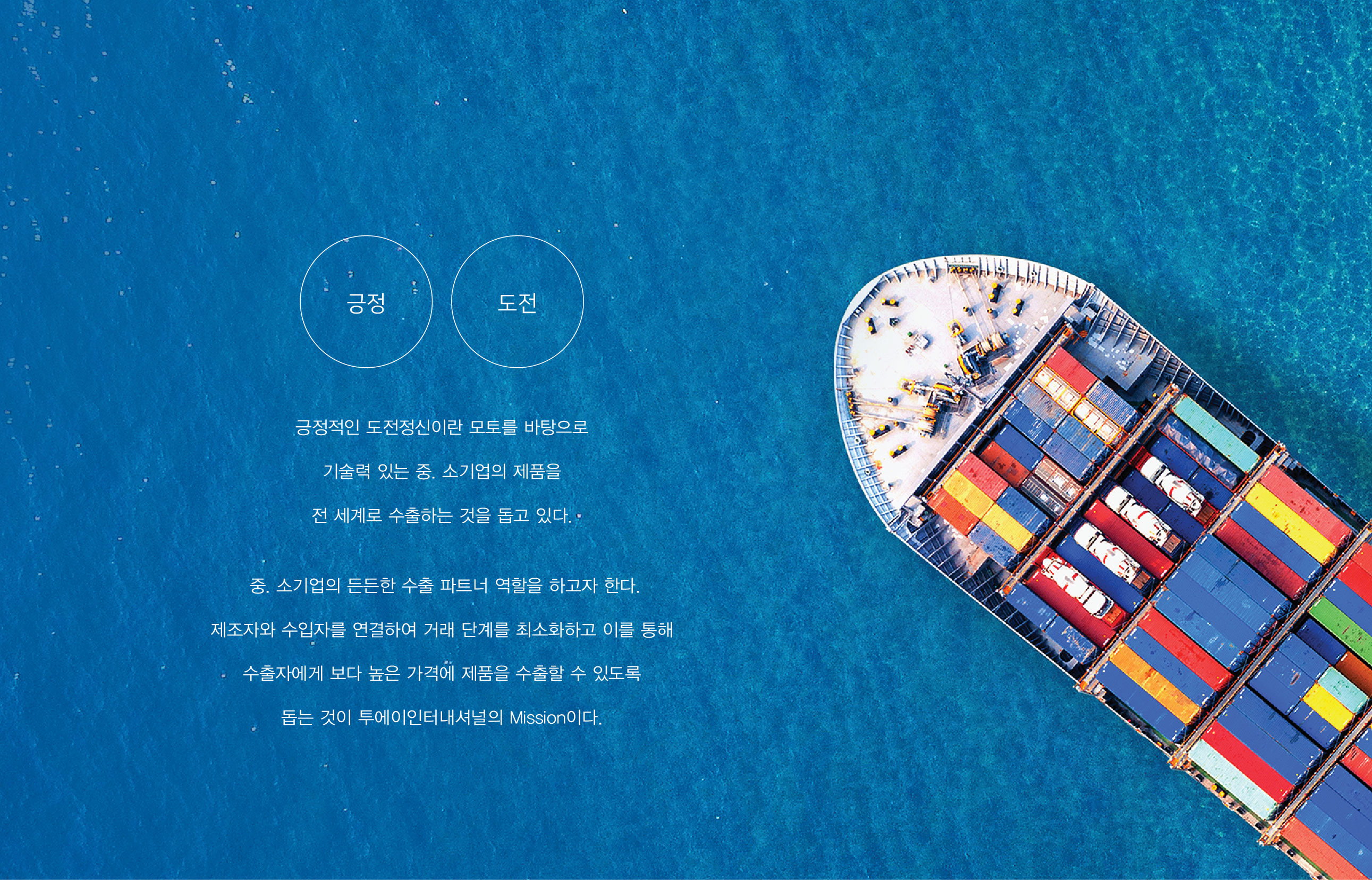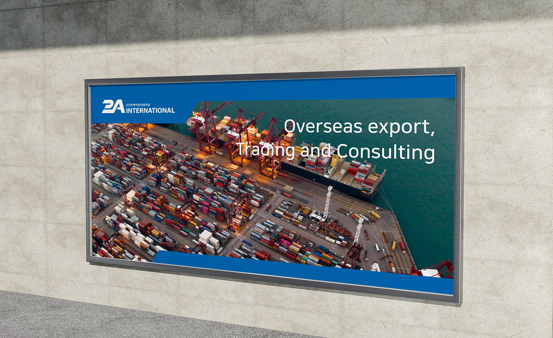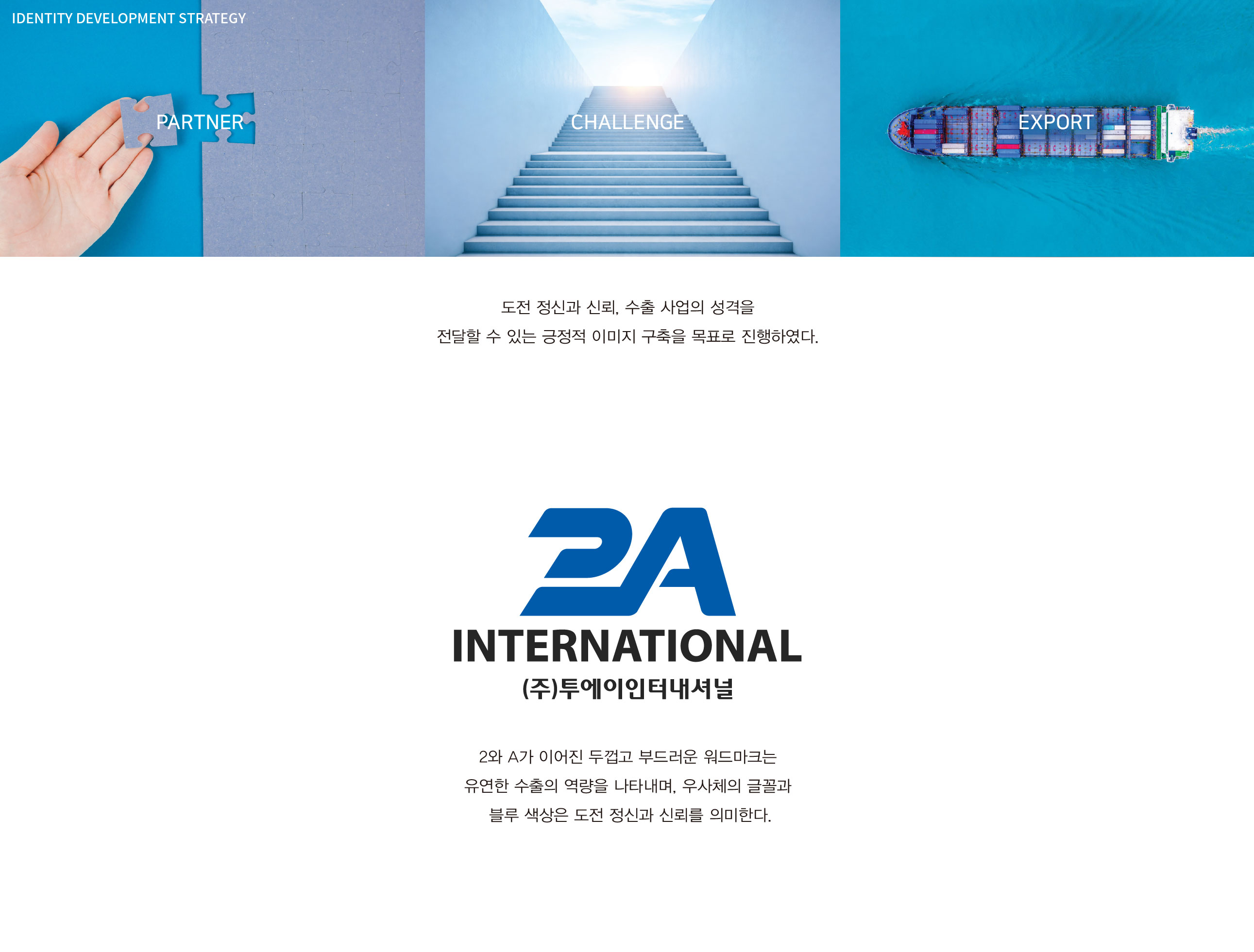 2A인터내셔널 CI 수출 경쟁력을 높이는 전략 파트너 투에이인터내셔널은 기술력 있는 중·소기업의 해외 진출을 지원하는 수출 전문 기업으로서의 정체성을 명확히 구축하기 위한 전략적 작업이었다. 단순 무역 대행사가 아닌, 기업의 글로벌 확장을 함께 설계하는 든든한 수출 파트너로 자리매김하는 것이 핵심 방향이었다. 투에이인터내셔널은 ‘긍정’과 ‘도전’이라는 기업 모토를 기반으로, 해외 시장 개척에 어려움을 겪는 중·소기업의 제품을 전 세계로 연결하는 역할을 수행해 왔다. 제조자와 수입자를 직접 연결하여 유통 단계를 최소화하고, 이를 통해 가격 경쟁력과 수익 구조를 개선하는 실질적 솔루션을 제공한다는 점에서 차별화된 경쟁력을 지니고 있었다. 이에 따라 브랜드는 신뢰, 실행력, 글로벌 네트워크 역량을 중심 가치로 정립되었다. 수출 과정을 단순히 중개하는 것이 아니라, 기업의 성장 가능성을 실현시키는 전략적 파트너라는 인식을 구축하는 것이 중요한 과제였다. 또한 국제 비즈니스 환경에 부합하는 전문성과 안정감을 동시에 전달하여, 국내 제조기업과 해외 바이어 모두에게 신뢰받는 브랜드 이미지를 형성하고자 하였다. | ||||