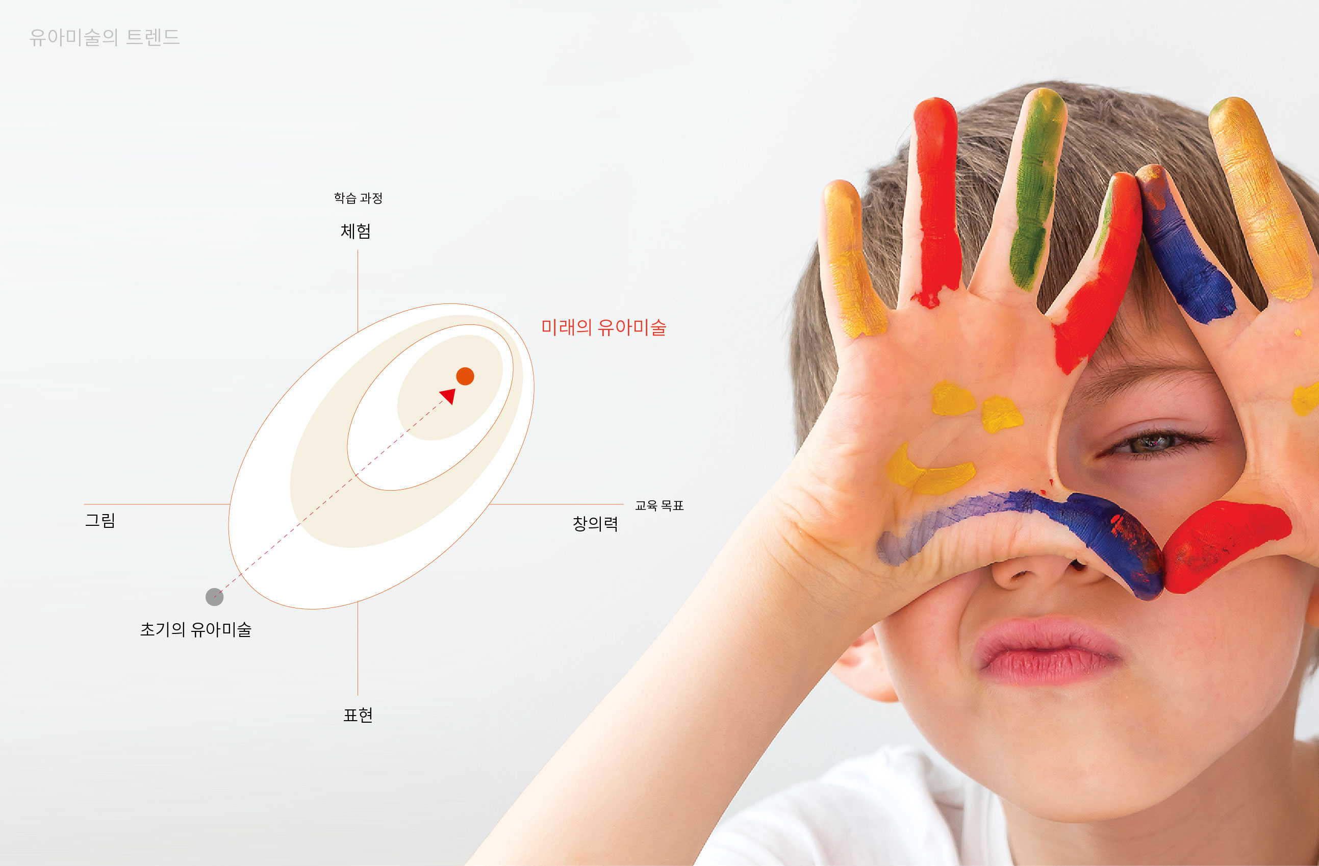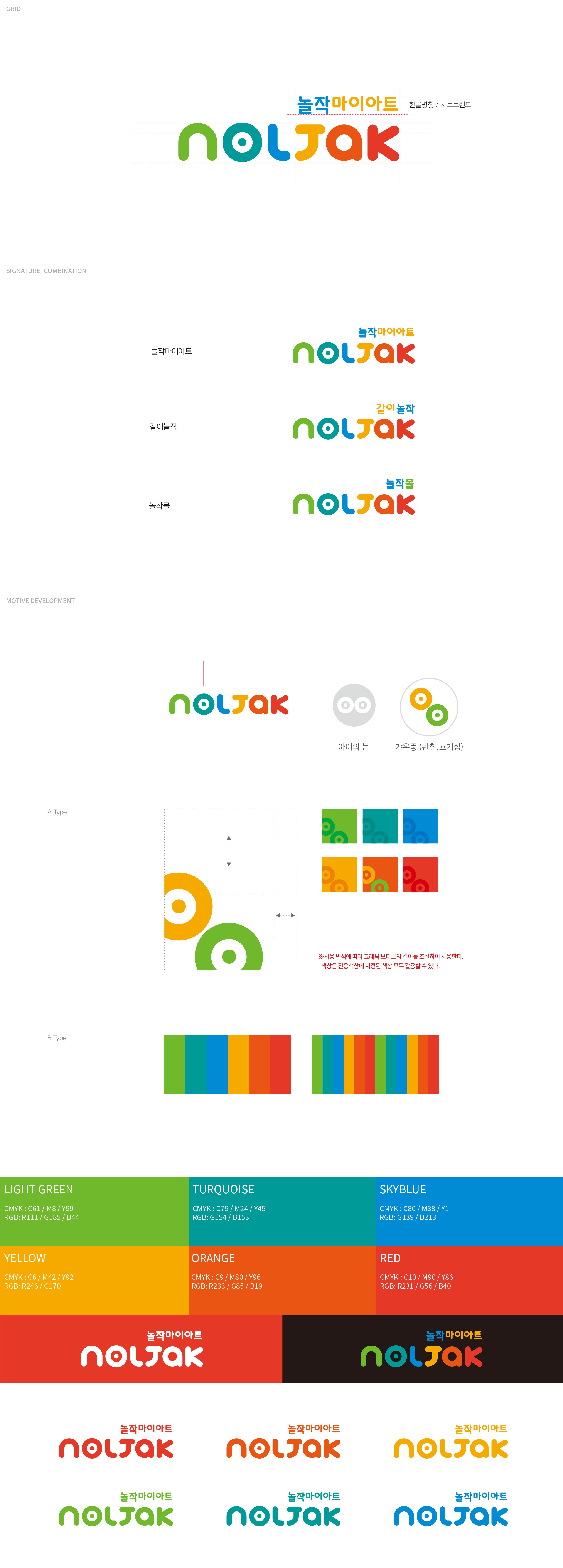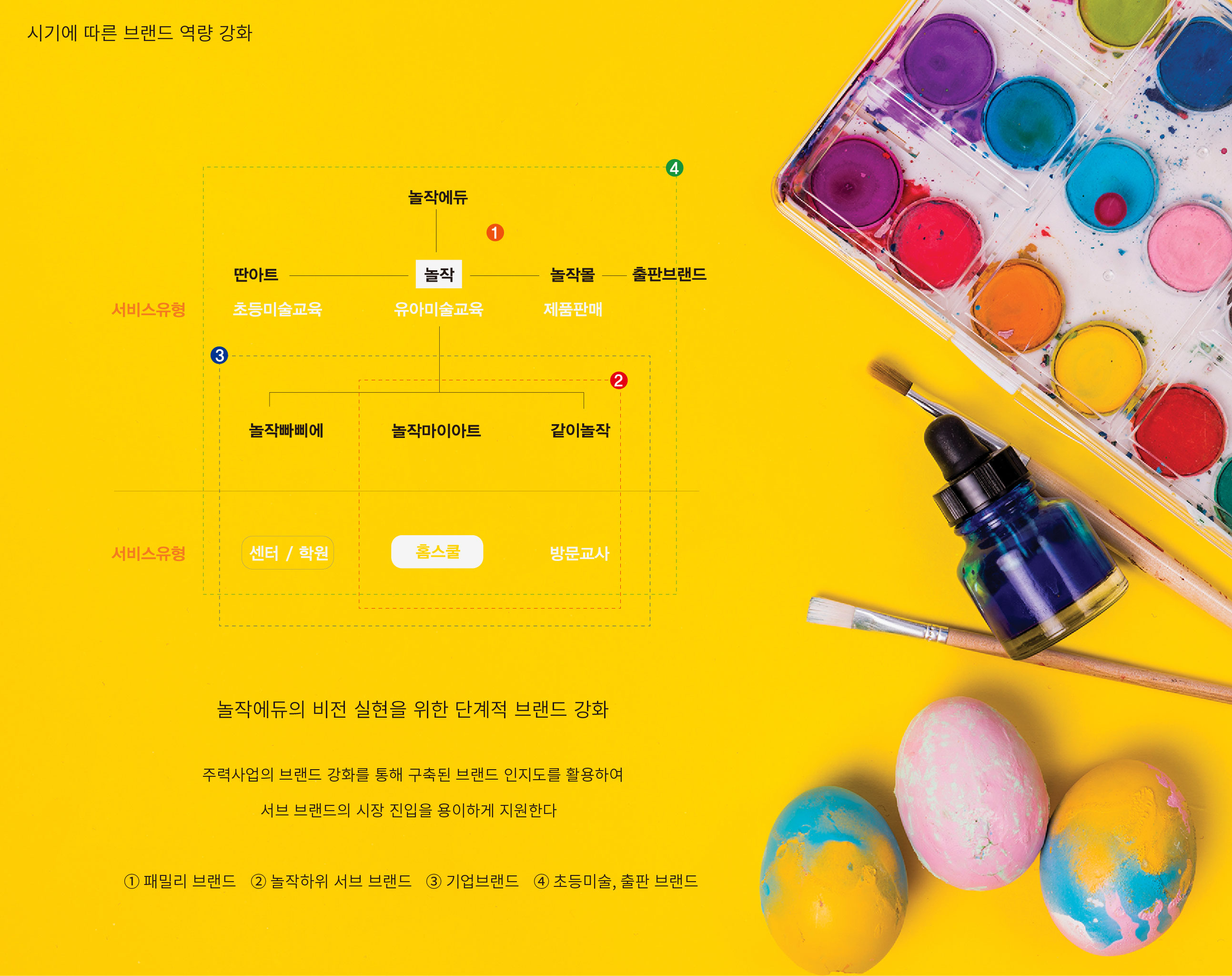 놀작마이아트 관찰에서 시작되는 창의 성장 플랫폼 놀작마이아트는 유아미술 교육 시장에서 후발주자로 출발해 단기간 내 국내 최대 교육원을 운영하는 기업으로 성장한 배경 속에서, 기업 차원의 브랜드 체계를 정립이 필요한 상황이었다. 단순 교육 프로그램 브랜드를 넘어, 글로벌 교육 기업으로 도약하기 위한 통합 브랜드 플랫폼 구축이 핵심 과제였다. 미국과 독일을 포함한 11개국으로 확장된 교육 네트워크는 브랜드의 국제적 정체성 확립을 요구하고 있었으며, 한국과 동일한 교육 운영 마인드와 경영 원칙을 유지하는 일관된 브랜드 메시지가 필요했다. 이에 따라 브랜드는 ‘생각하는 관찰, 창의적인 표현’이라는 교육 철학을 중심 가치로 설정하고, 제품 중심 인식에서 기업 비전 중심 구조로 재정비되었다. 2014년을 기점으로 지속적인 기업 성장과 함께 브랜드 전략 관리의 중요성이 부각되었고, 기존 제품 브랜드의 시각적 아이덴티티 정비를 넘어 기업 브랜드의 방향성과 사업 정의를 새롭게 설정하였다. 패밀리 브랜드의 인지도를 기반으로 개별 브랜드를 체계적으로 확장하고, 명확한 메시지 구조를 수립하는 것이 브랜드 전환의 핵심 전략이었다. | ||||